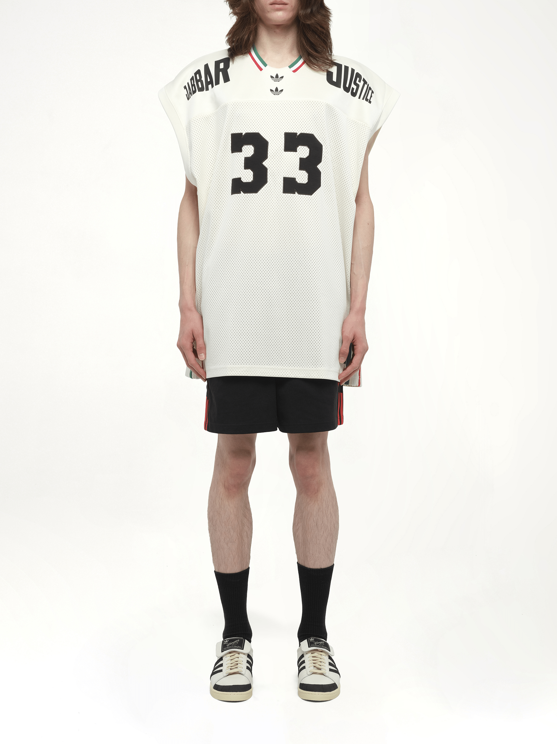 The Adidas X Chavarria Jabbar Basketball Jersey in Off White merges classic athletic codes with bold streetwear design. Inspired by Kareem Abdul-Jabbar, it features a voluminous silhouette and heritage embroidery details.
