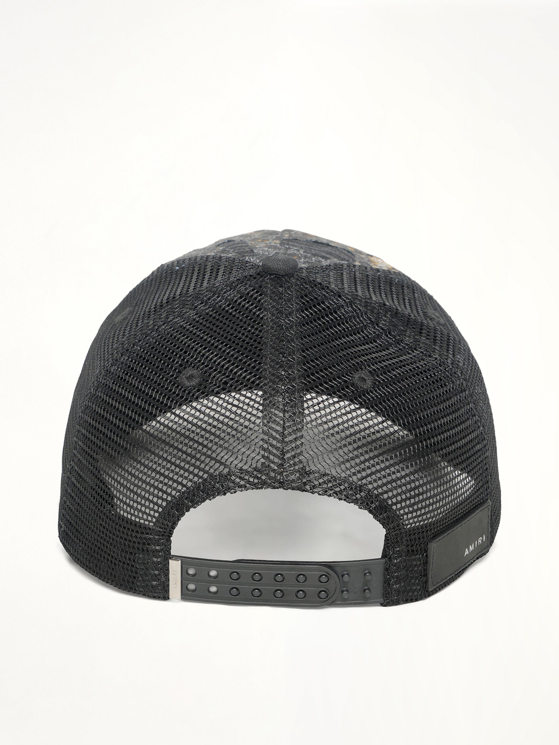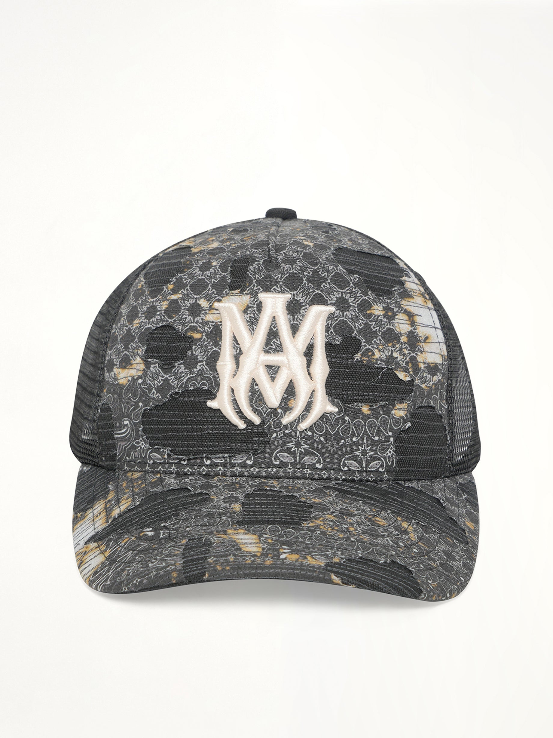 Amiri's Bandana Repair Trucker Hat in Black is a stylish and unique accessory that combines classic trucker hat design with a modern twist. Perfect for adding a touch of edge to any casual outfit.