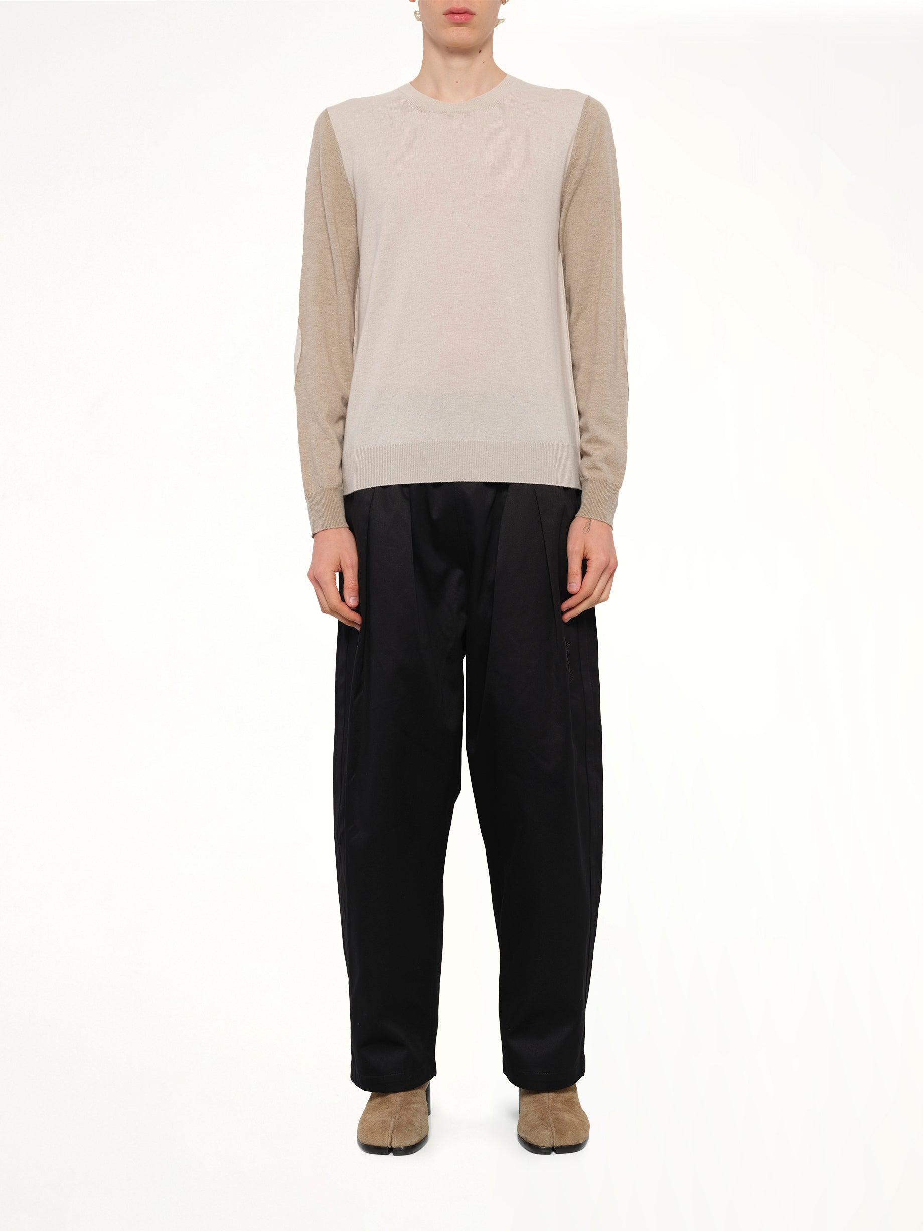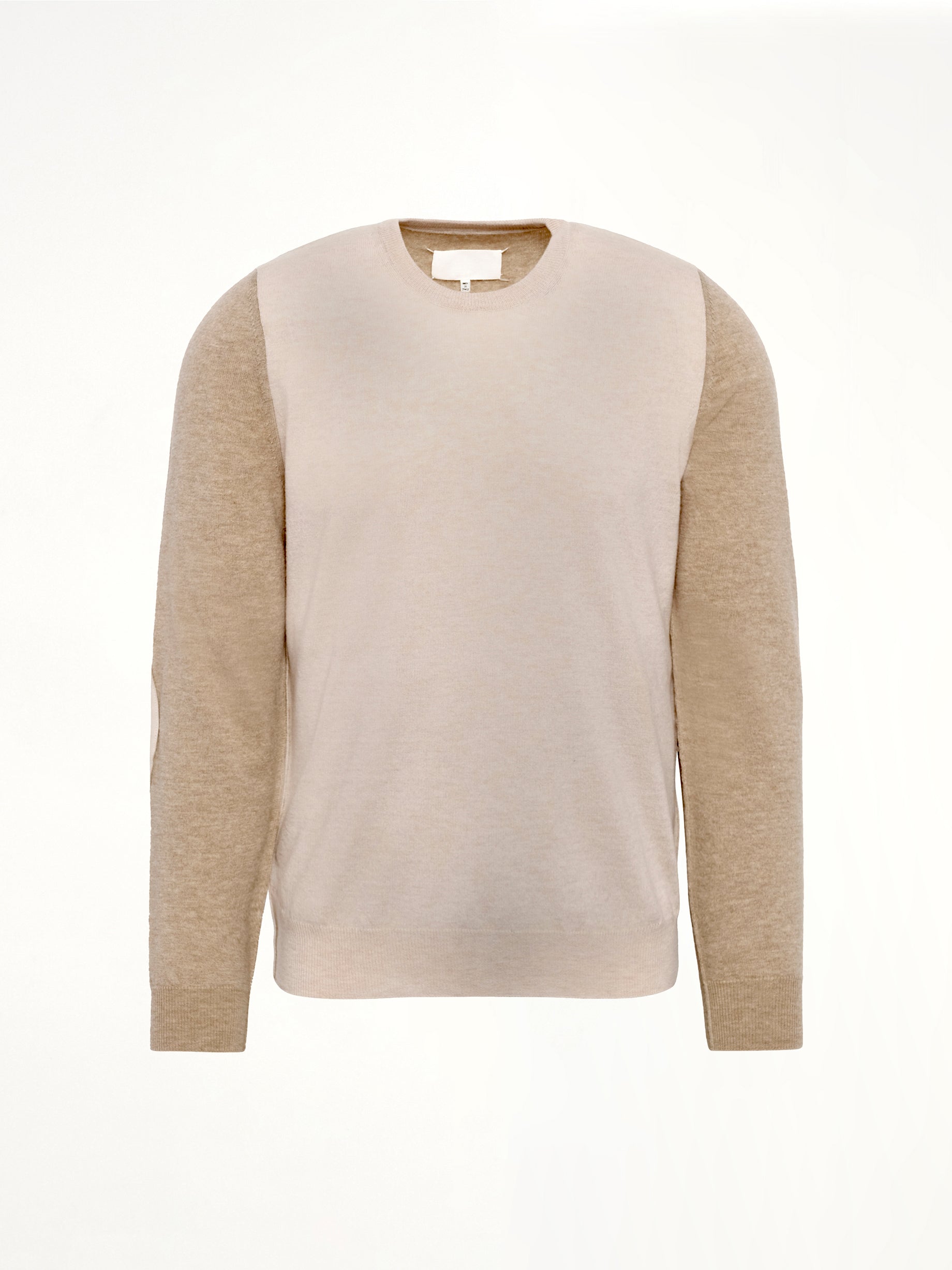 Maison Margiela's Contrast Panel Sweater in Beige/Camel is a sophisticated piece that combines modern design with timeless elegance. This sweater features a unique contrast panel design that adds a touch of contemporary flair to any wardrobe.