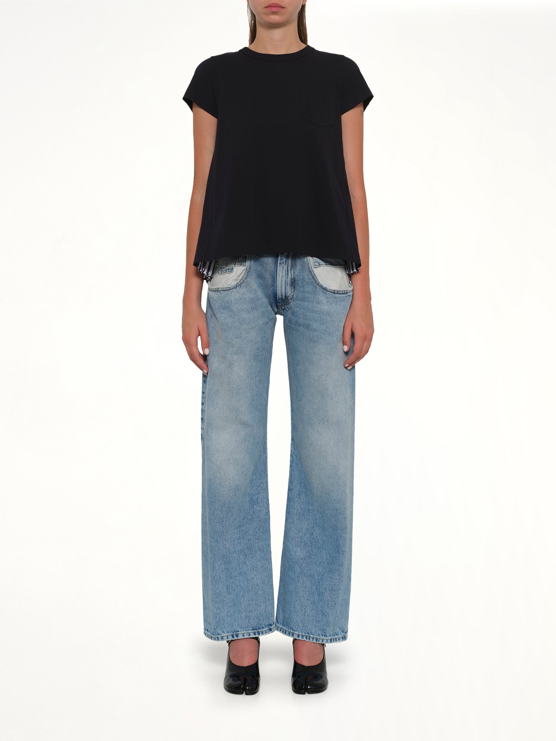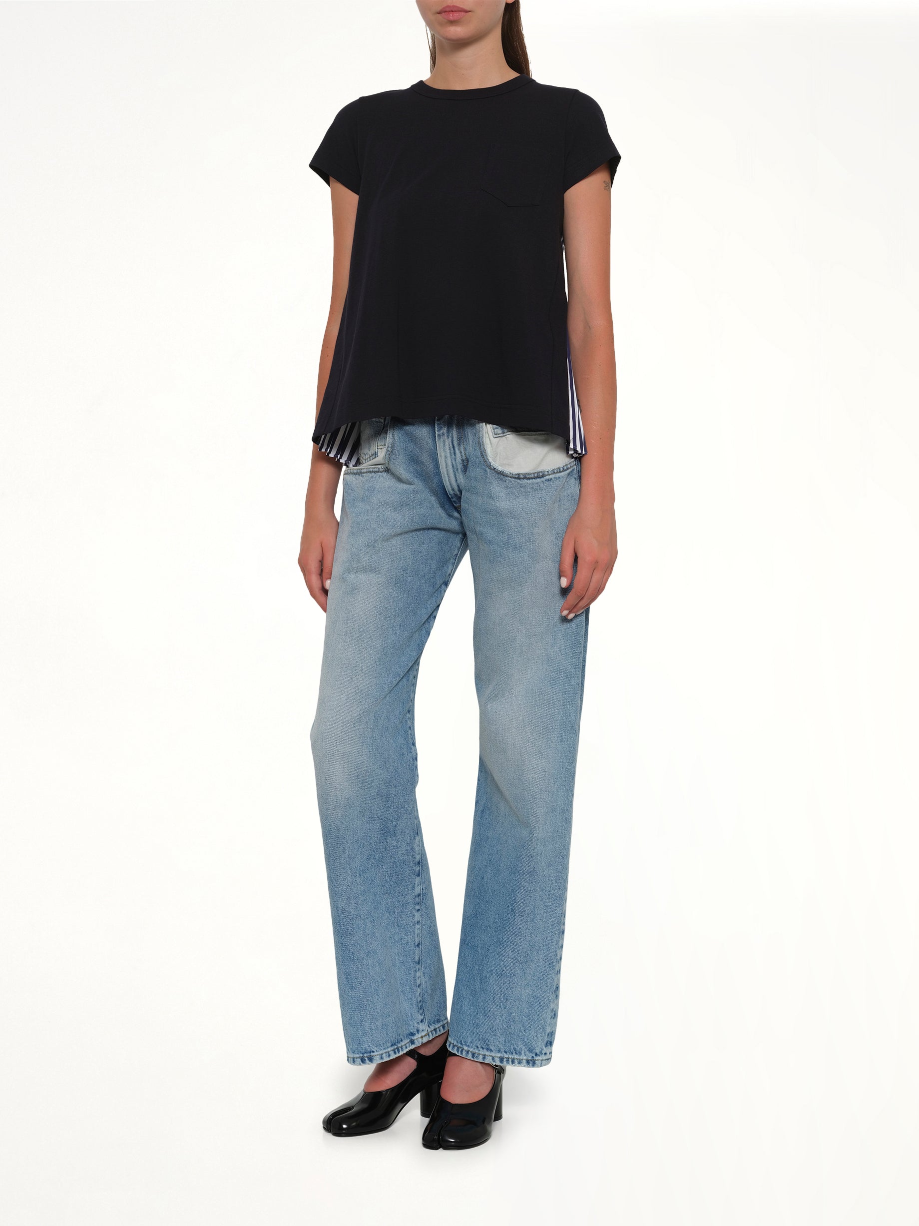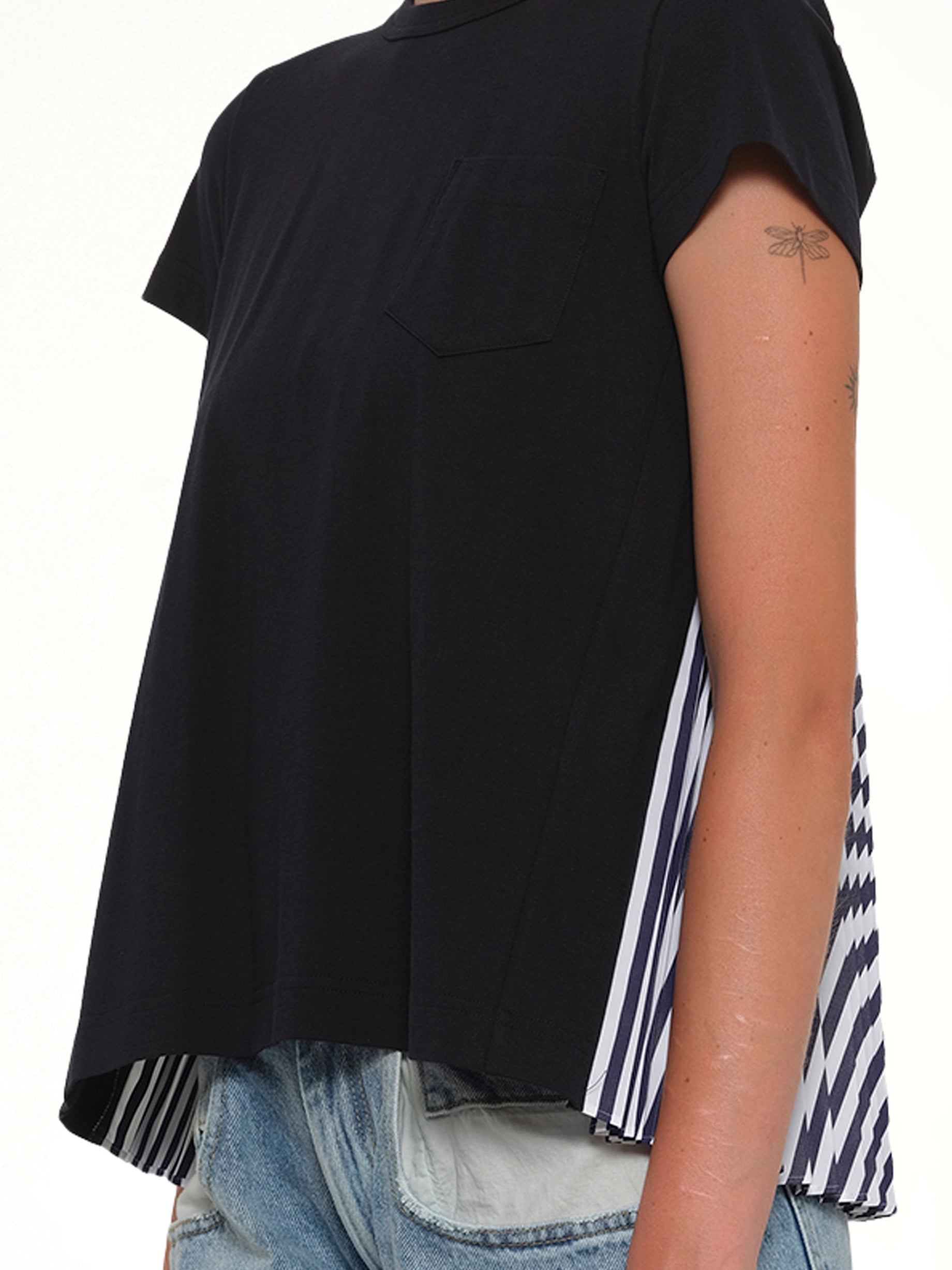 Sacai's Cotton Poplin x Cotton Jersey T-Shirt in Navy is a stylish blend of textures, offering a unique twist on a classic wardrobe staple. This versatile piece is perfect for both casual and smart-casual occasions.