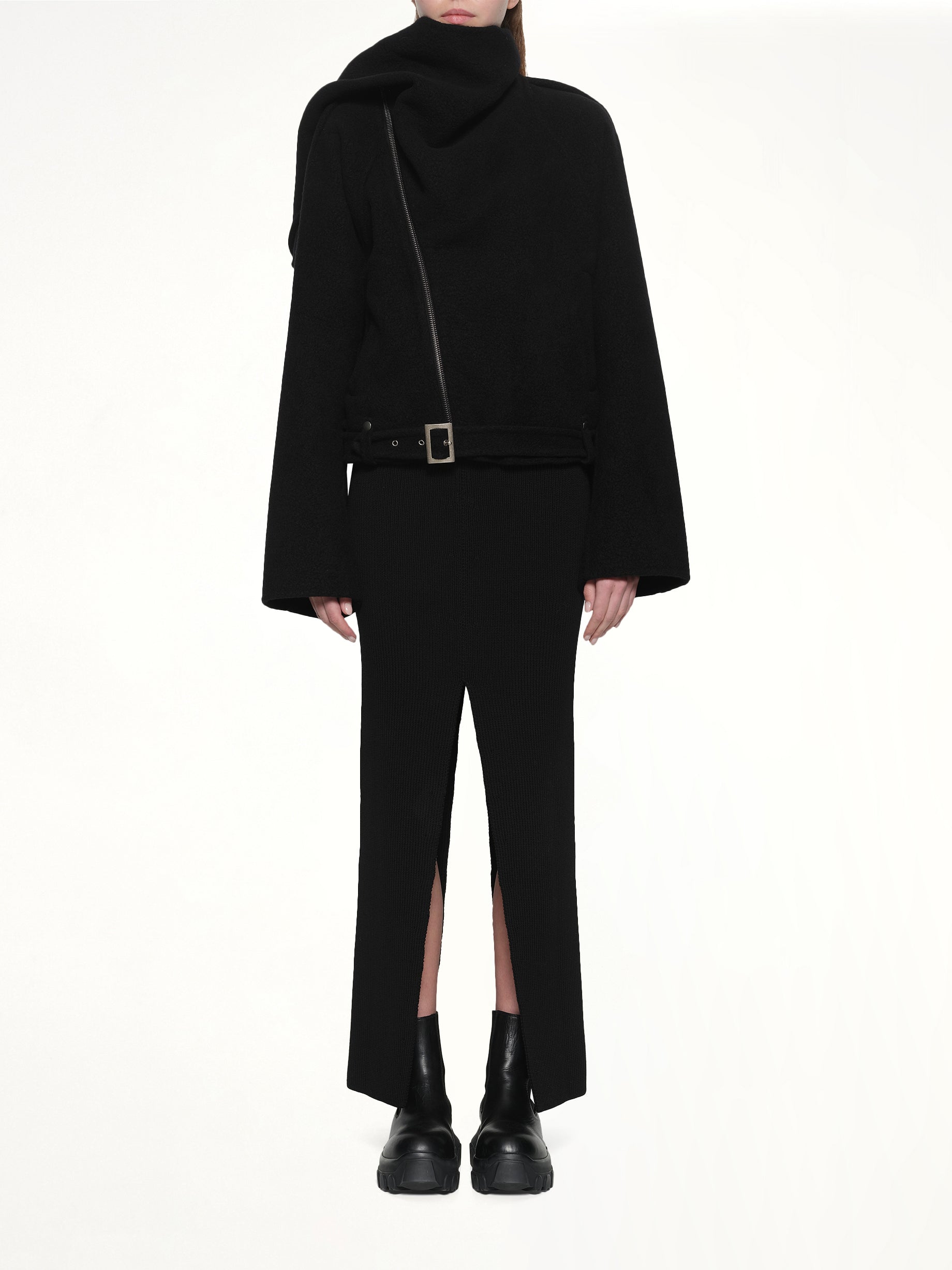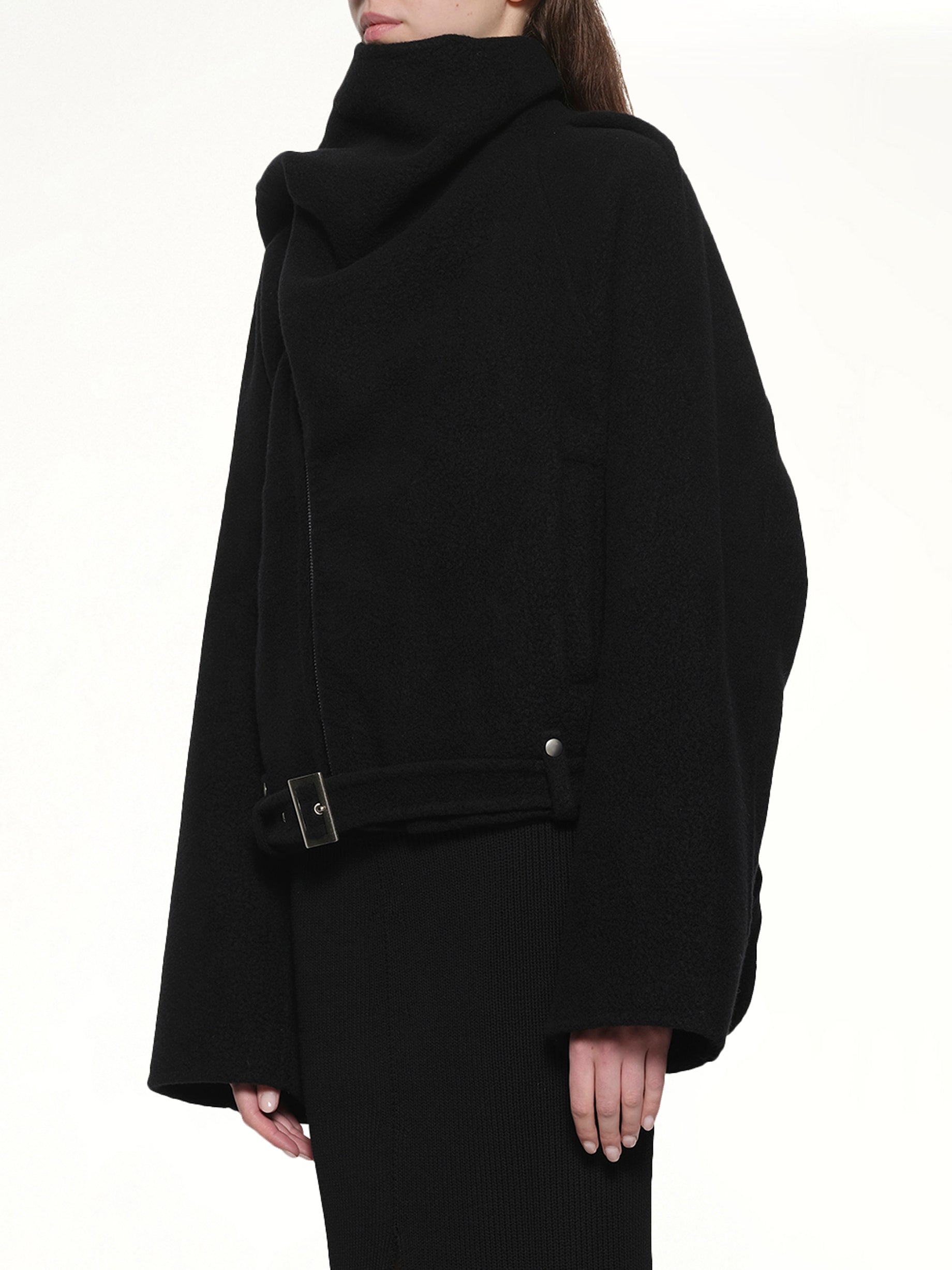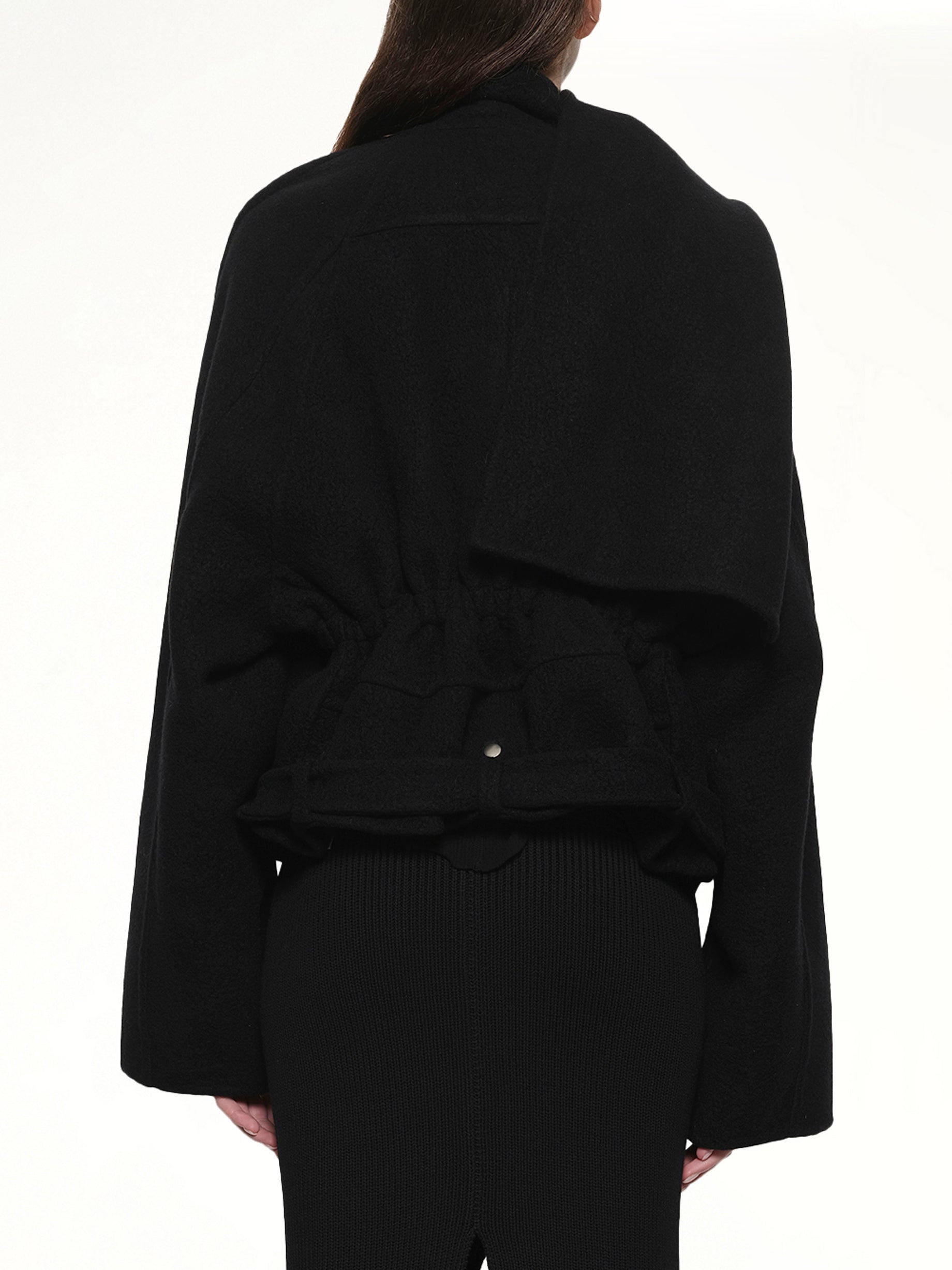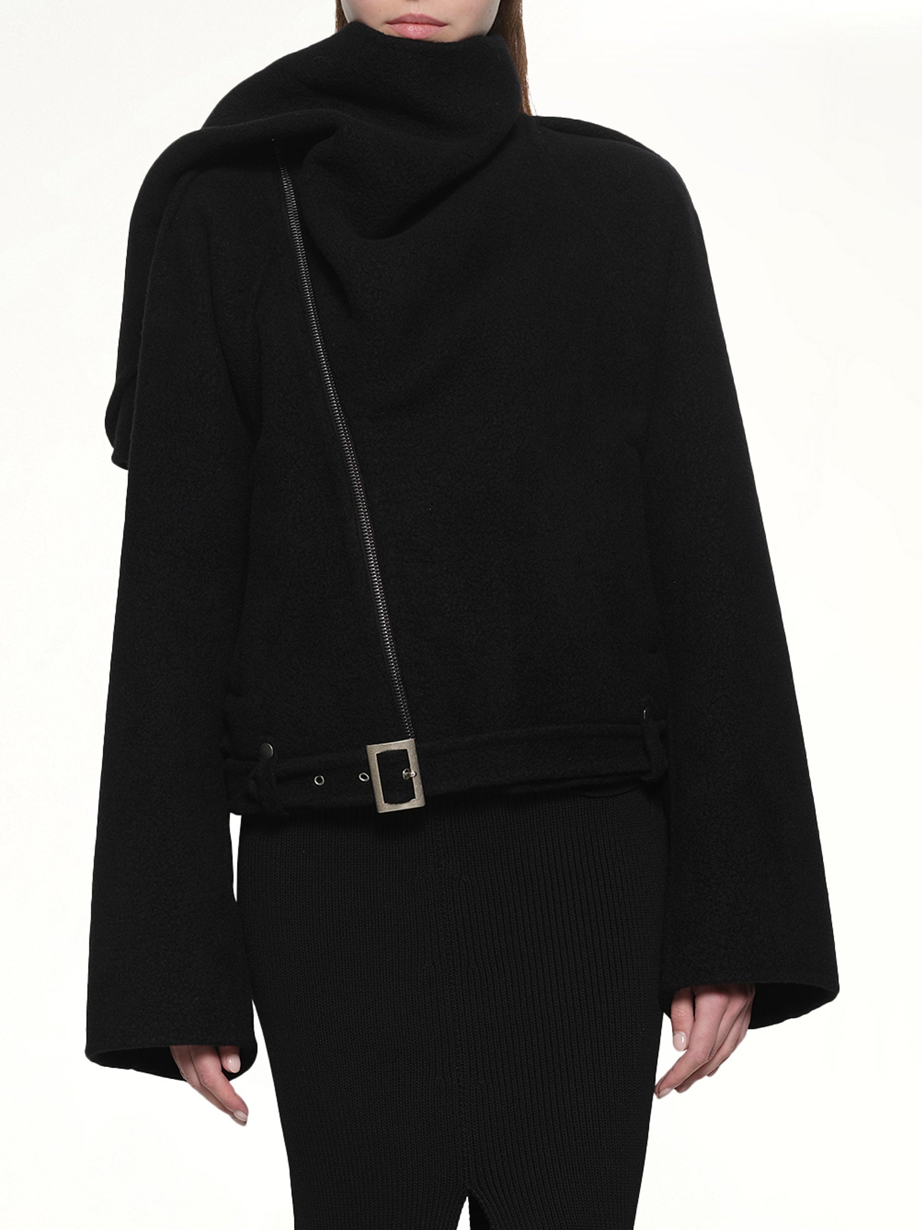 Rick Owens's Cropped Scarf Flight in Black is a distinctive piece that combines avant-garde design with practical functionality. This unique garment features a cropped silhouette and an integrated scarf, offering both style and warmth.