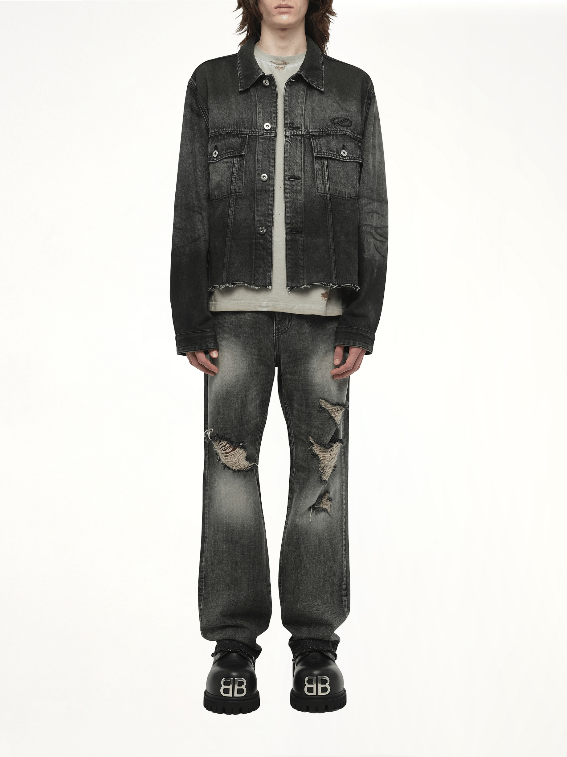 WE11DONE's Dark-Spray Detail Denim Jacket in Black is a bold statement piece that combines edgy design with classic denim style. Perfect for elevating any outfit, this jacket is a must-have for those who dare to stand out.