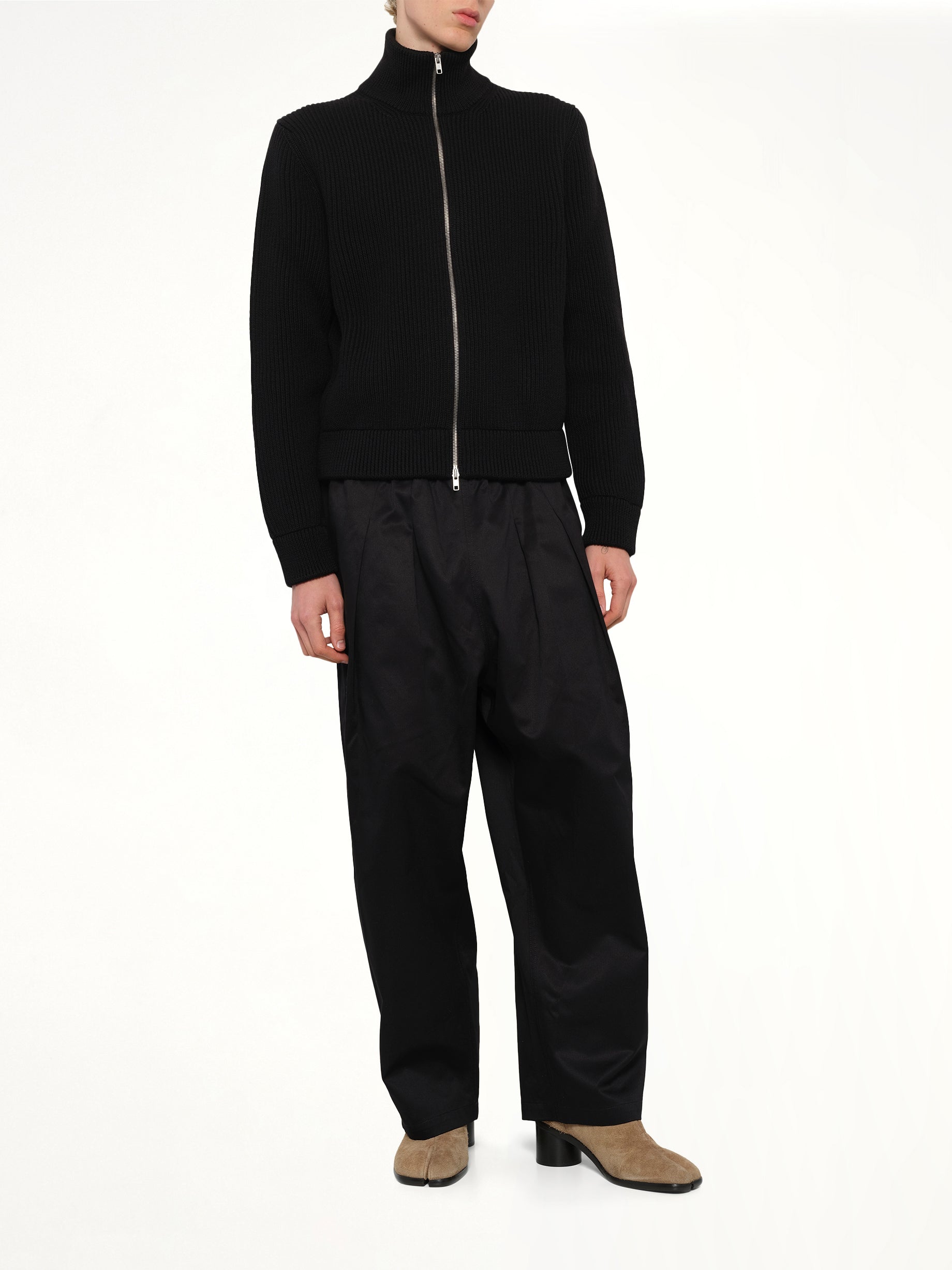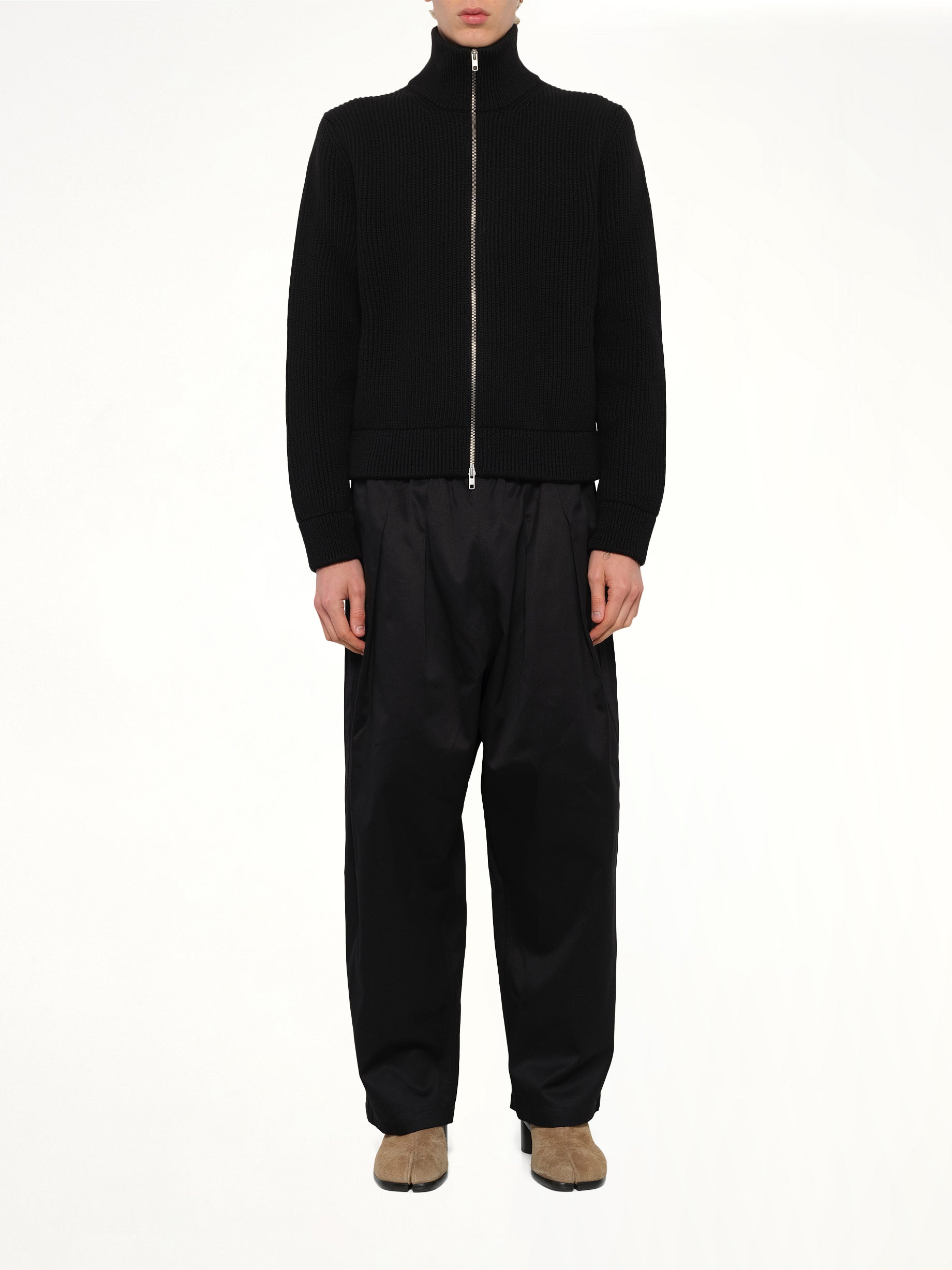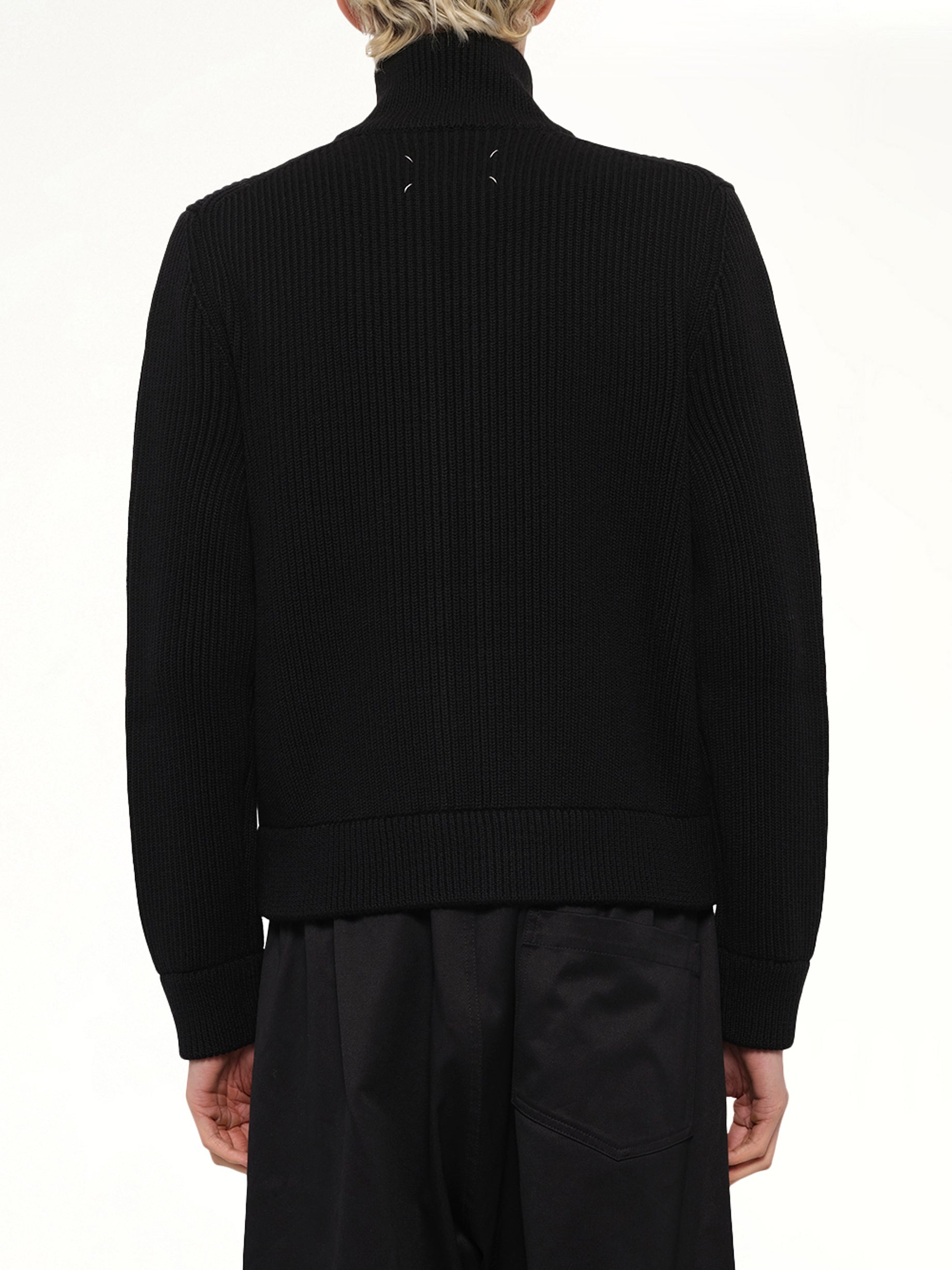 Maison Margiela's Drivers Knit Zip Sweater in Black is a sophisticated blend of style and functionality. This versatile piece is perfect for layering, offering both comfort and a sleek aesthetic.