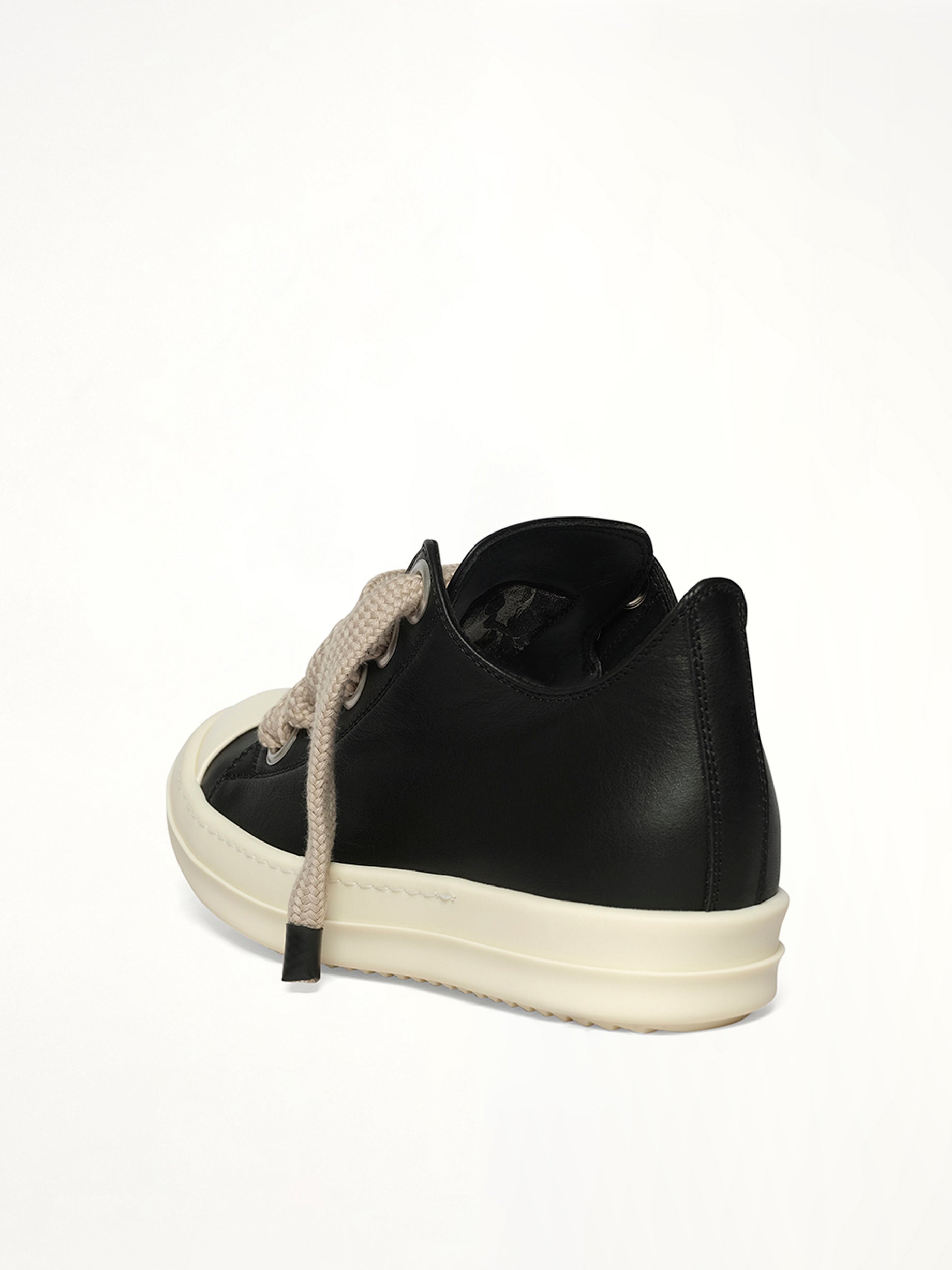 Rick Owens's Jumbolace Low Sneaks in Black/Milk/Milk is a striking blend of avant-garde design and everyday functionality. These sneakers offer a bold aesthetic with their unique color combination and distinctive silhouette.