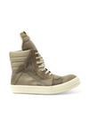 Rick Owens' Geobasket Transparent Leather Sneaker in Dust/Milk features a futuristic design with a transparent leather upper and contrasting dusty and milk-colored panels. The high-top silhouette is combined with signature oversized detailing, providing a bold, innovative look that stands out in any setting.