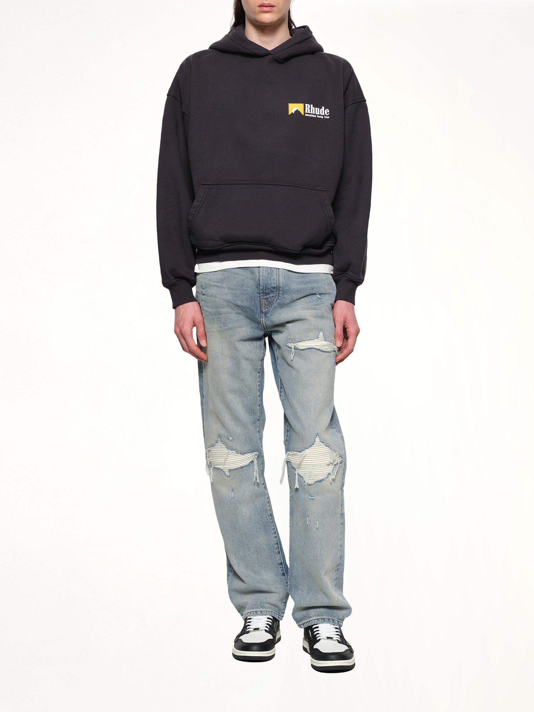 Rhude's International Racing Logo Hoodie in Vintage Black is a stylish and versatile piece that combines comfort with a bold design. Perfect for casual outings or making a statement, this hoodie is a must-have for any fashion-forward wardrobe.