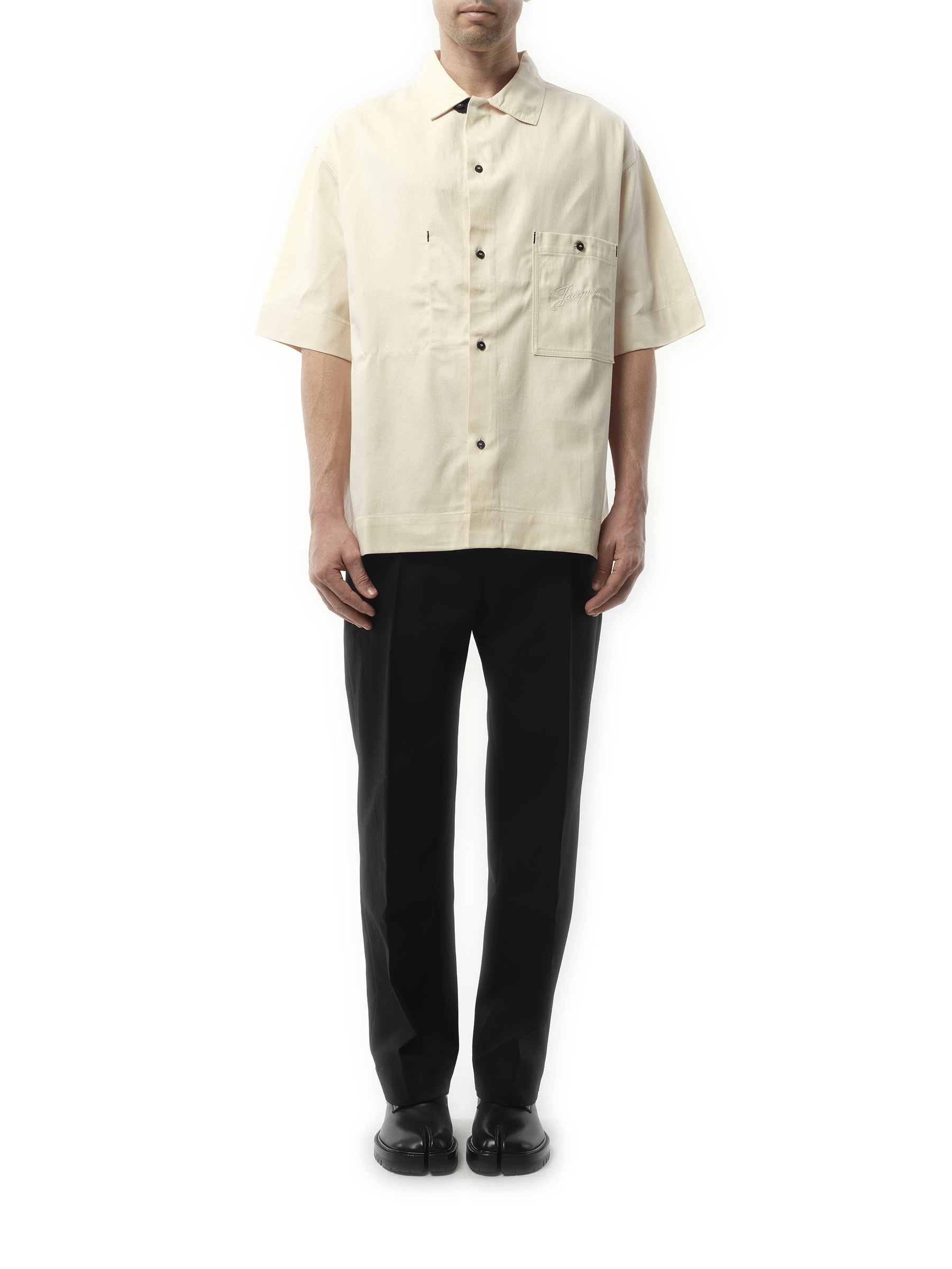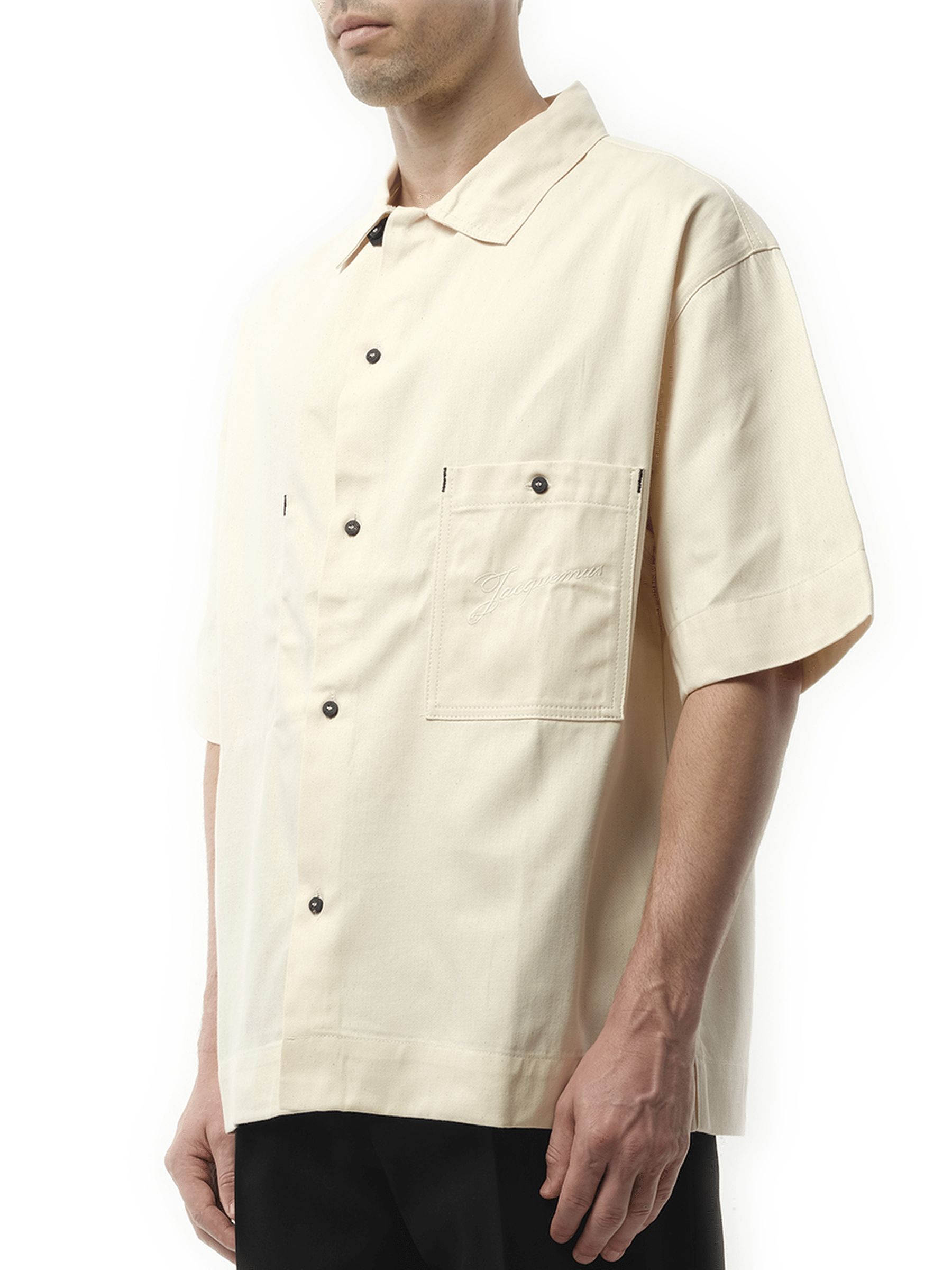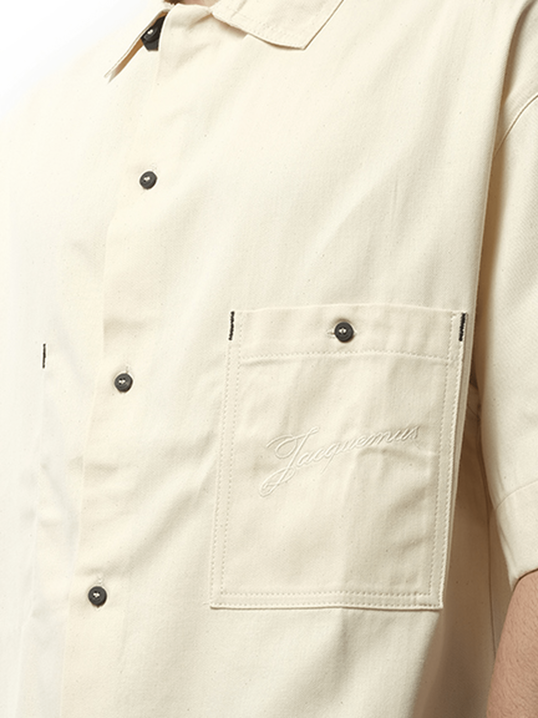 Jacquemus' La Chemise Denim Aloe in Off White, crafted from soft, breathable cork for a light, airy feel. The shirt features a relaxed, oversized fit with timeless detailing, perfect for both casual and smart-casual wear.