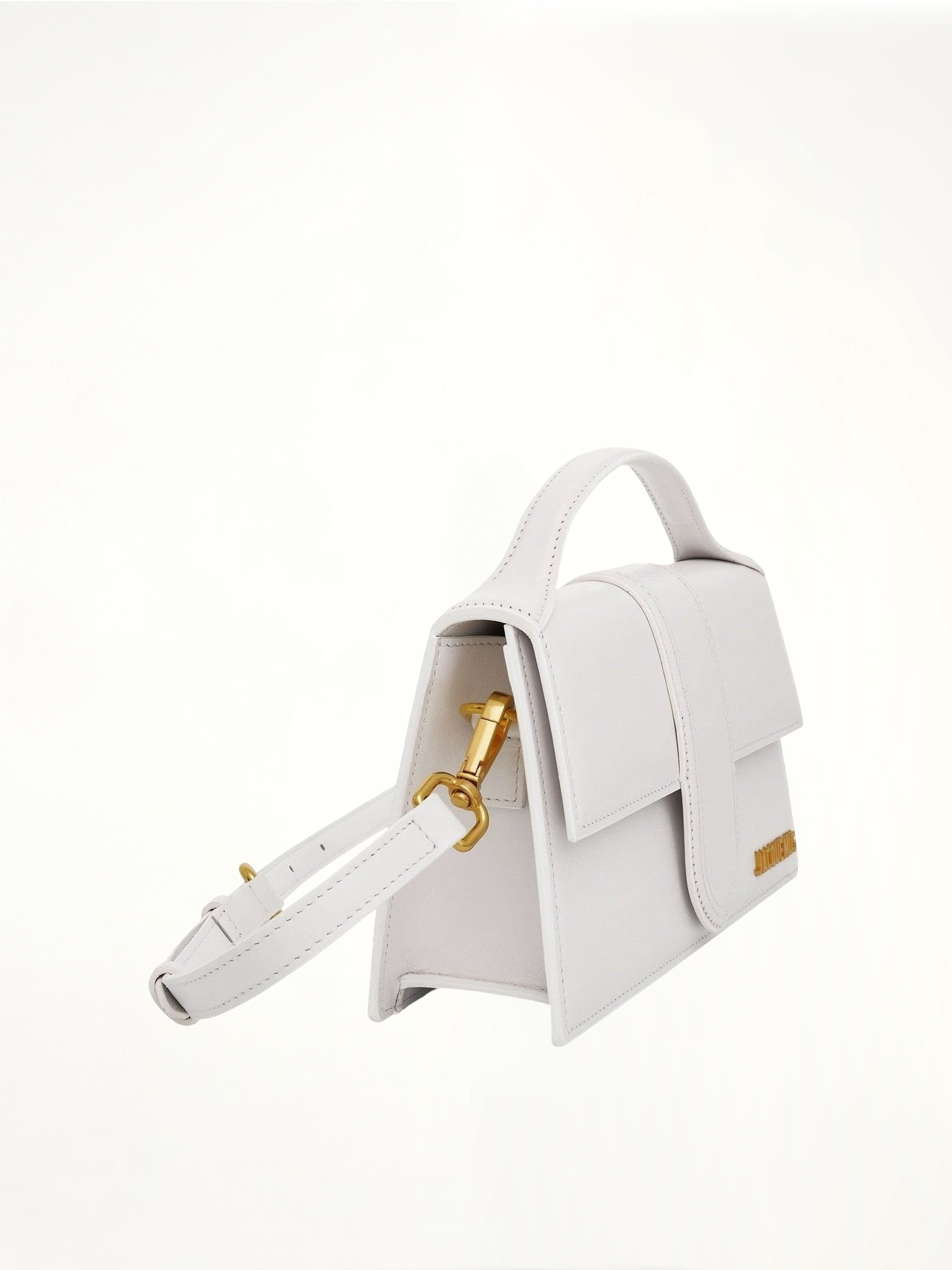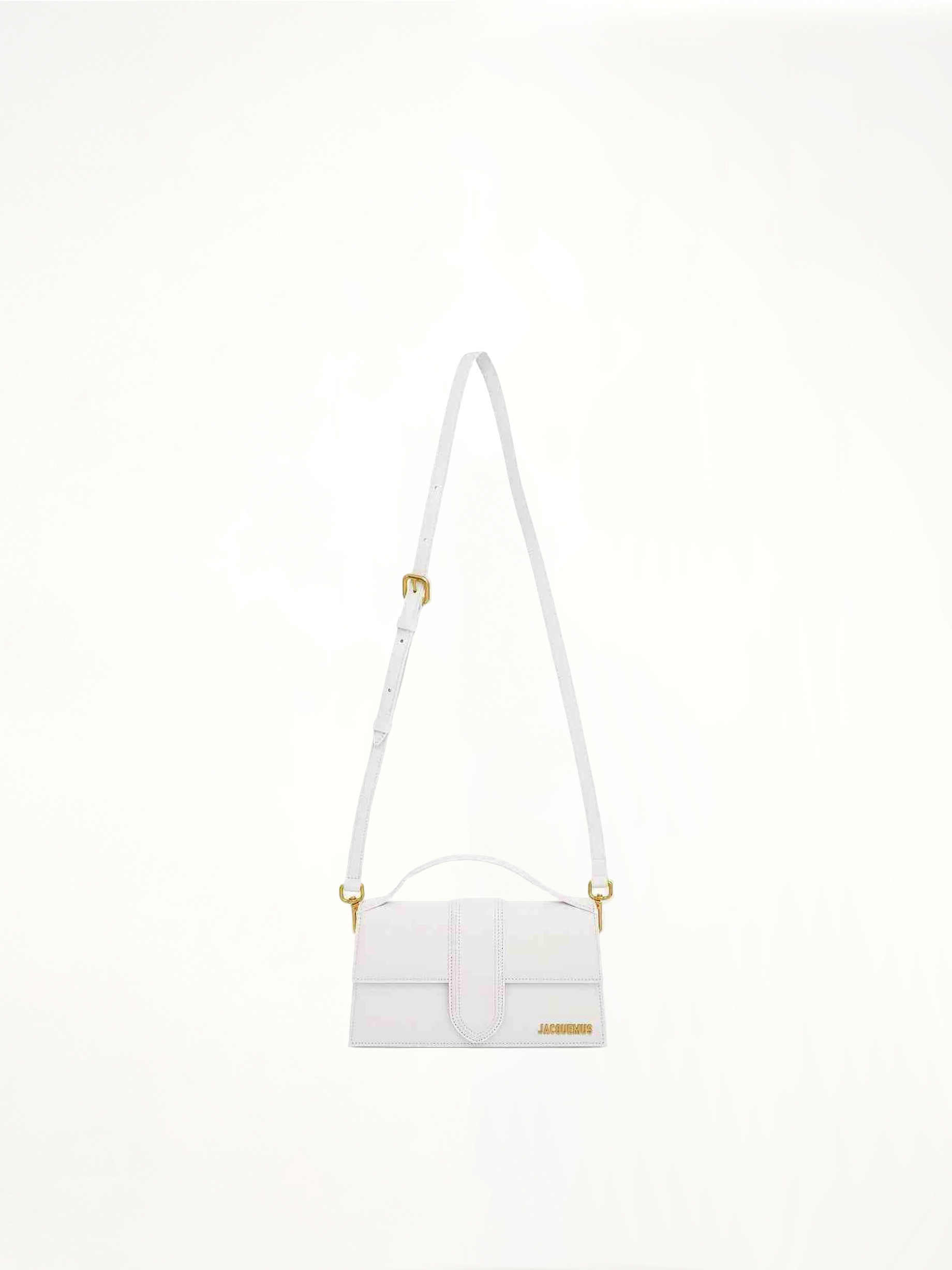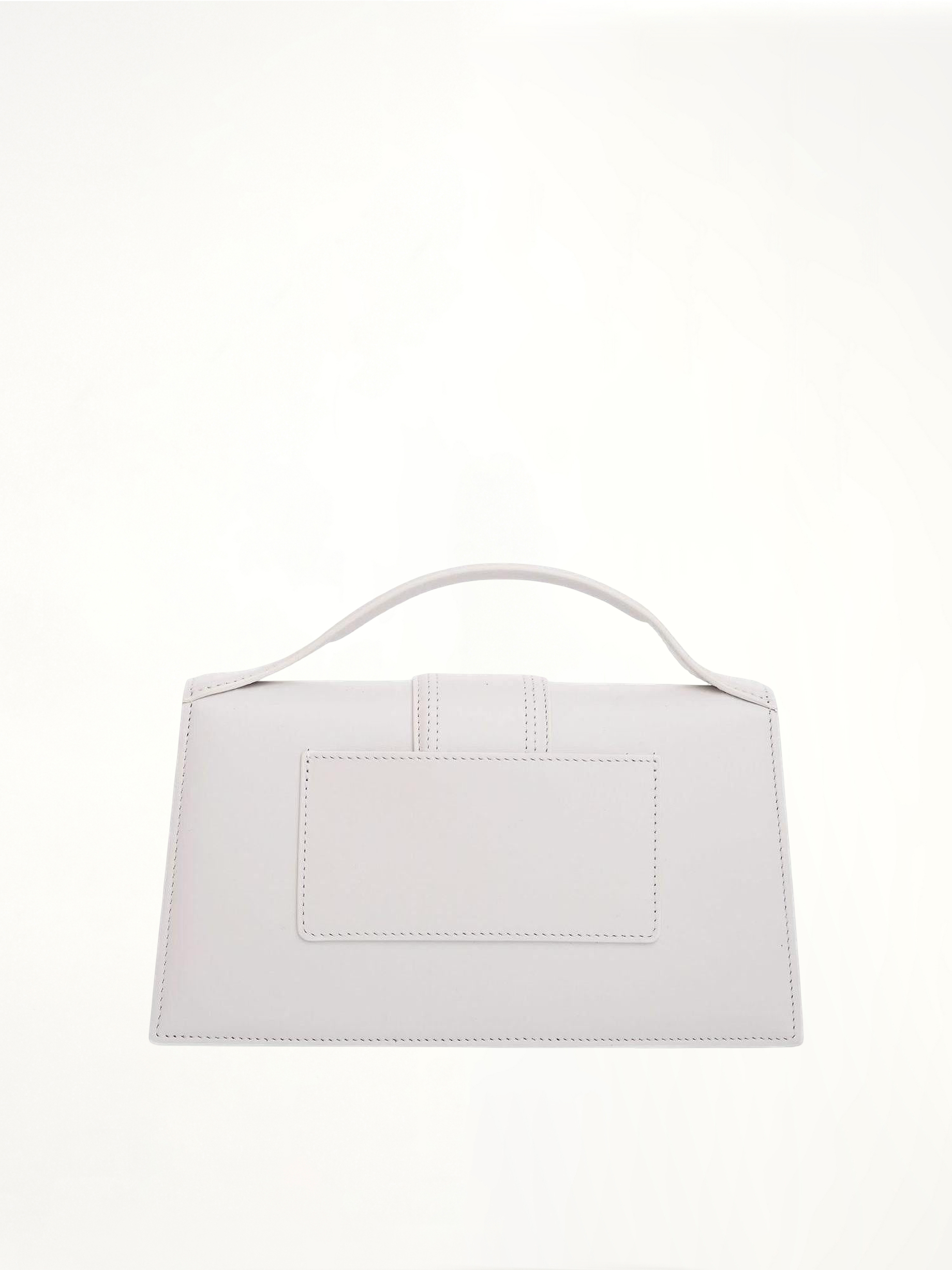 Le Grand Bambino bag Crafted from sleek and smooth calf leather, the bag exudes a refined and sophisticated aesthetic. It features the iconic gold-tone branded plaque, which serves as a distinctive hallmark of Jacquemus designs.