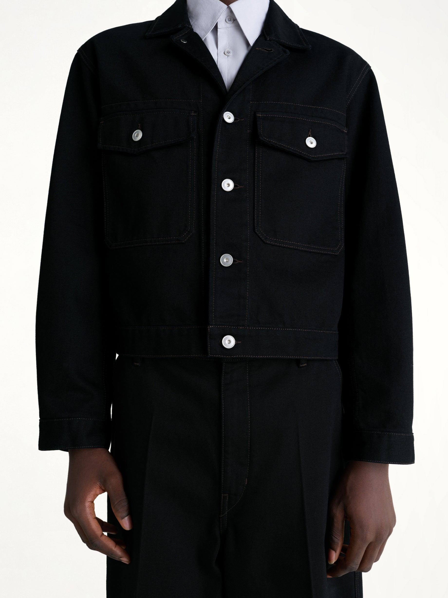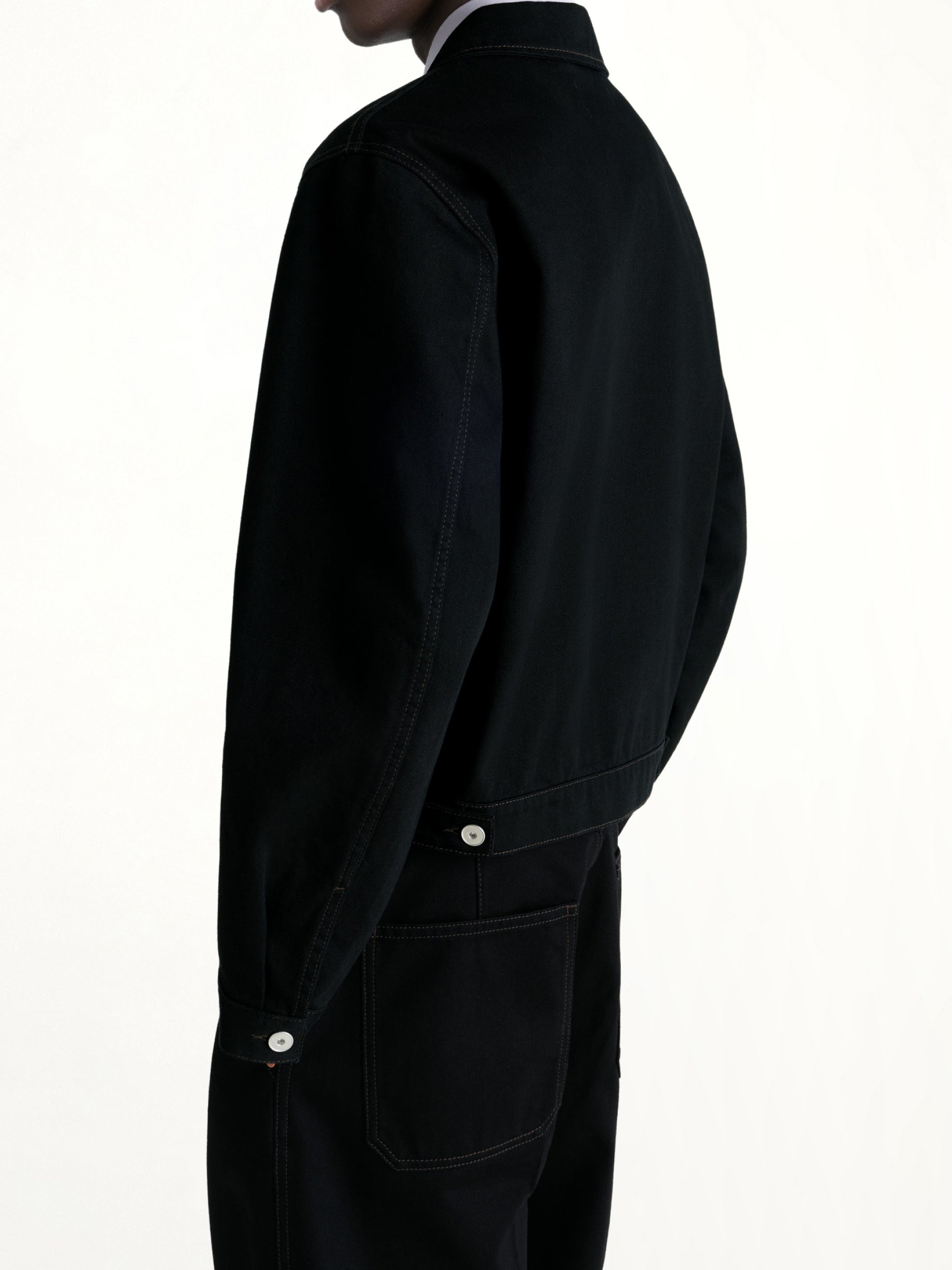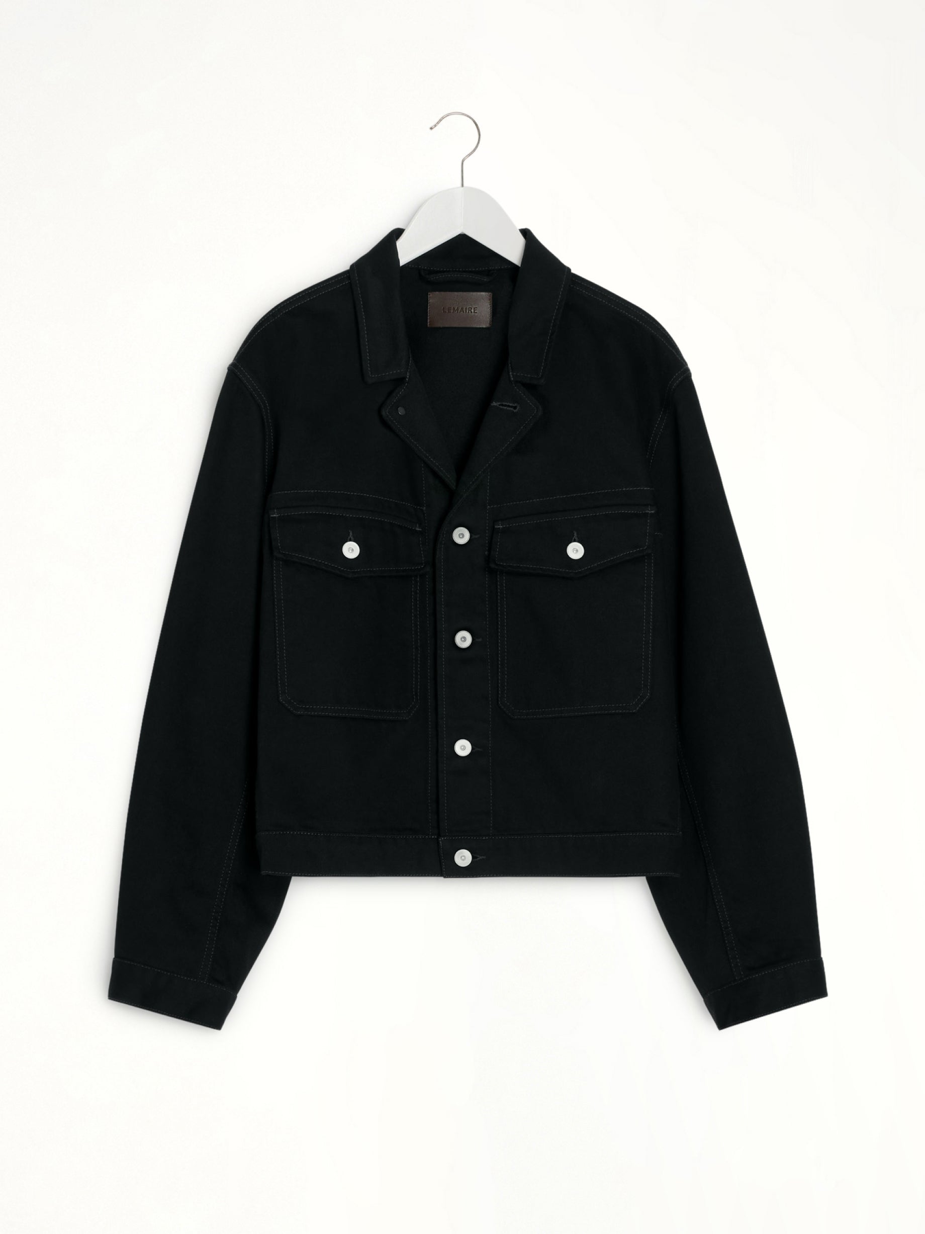 Lemaire's Trucker Jacket in Black is a versatile and stylish outerwear piece that combines classic design with modern aesthetics. Perfect for layering, this jacket offers a sleek silhouette and functional details.