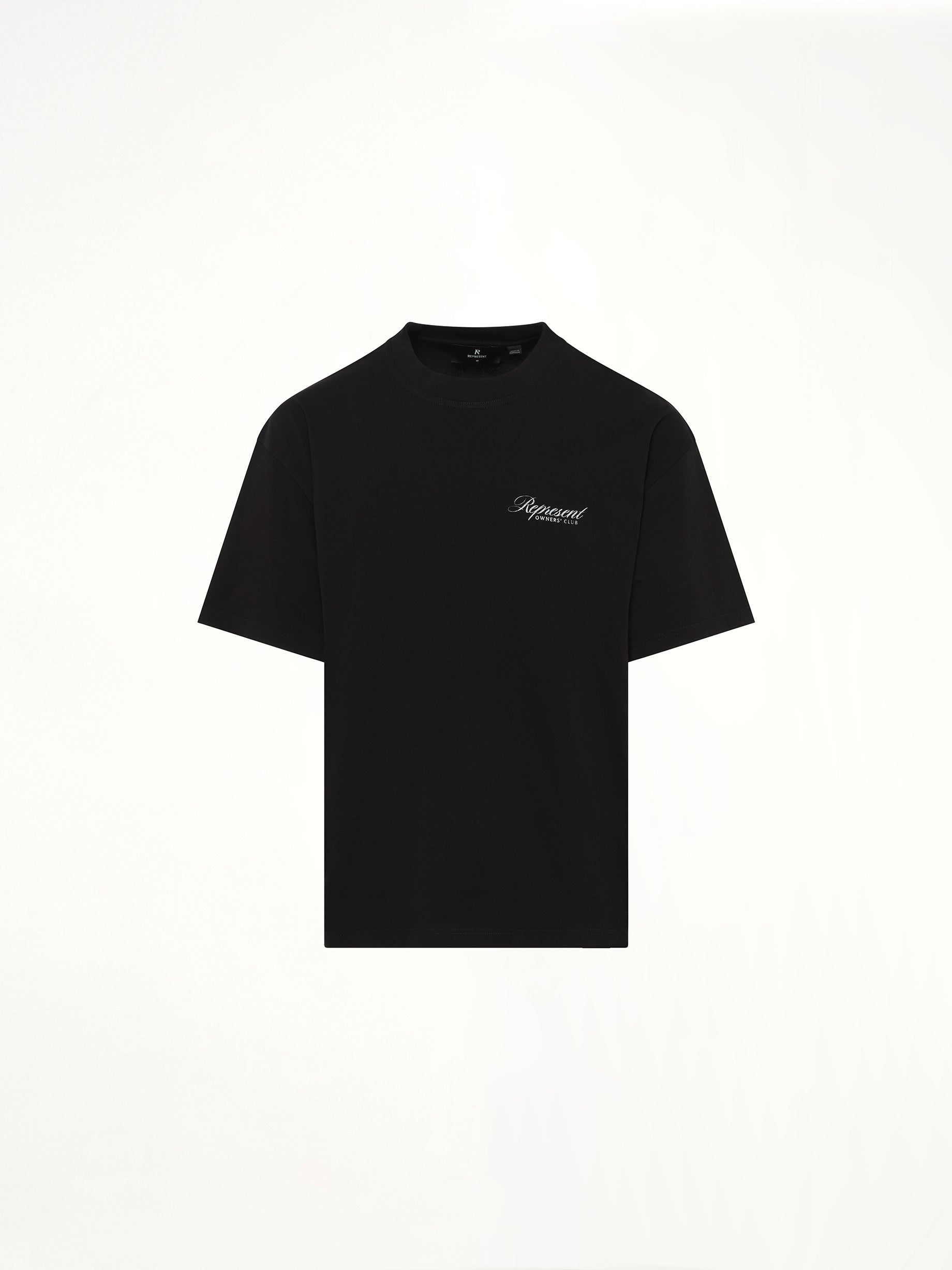 Represent's Represent Owners Club Script T-Shirt in Black is a stylish and versatile addition to any wardrobe. This t-shirt features a sleek design with a bold script logo, perfect for casual outings or layering.