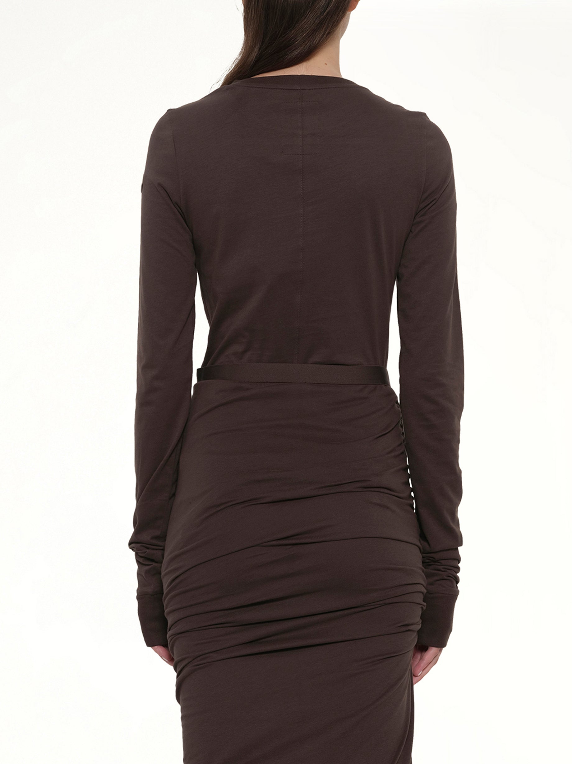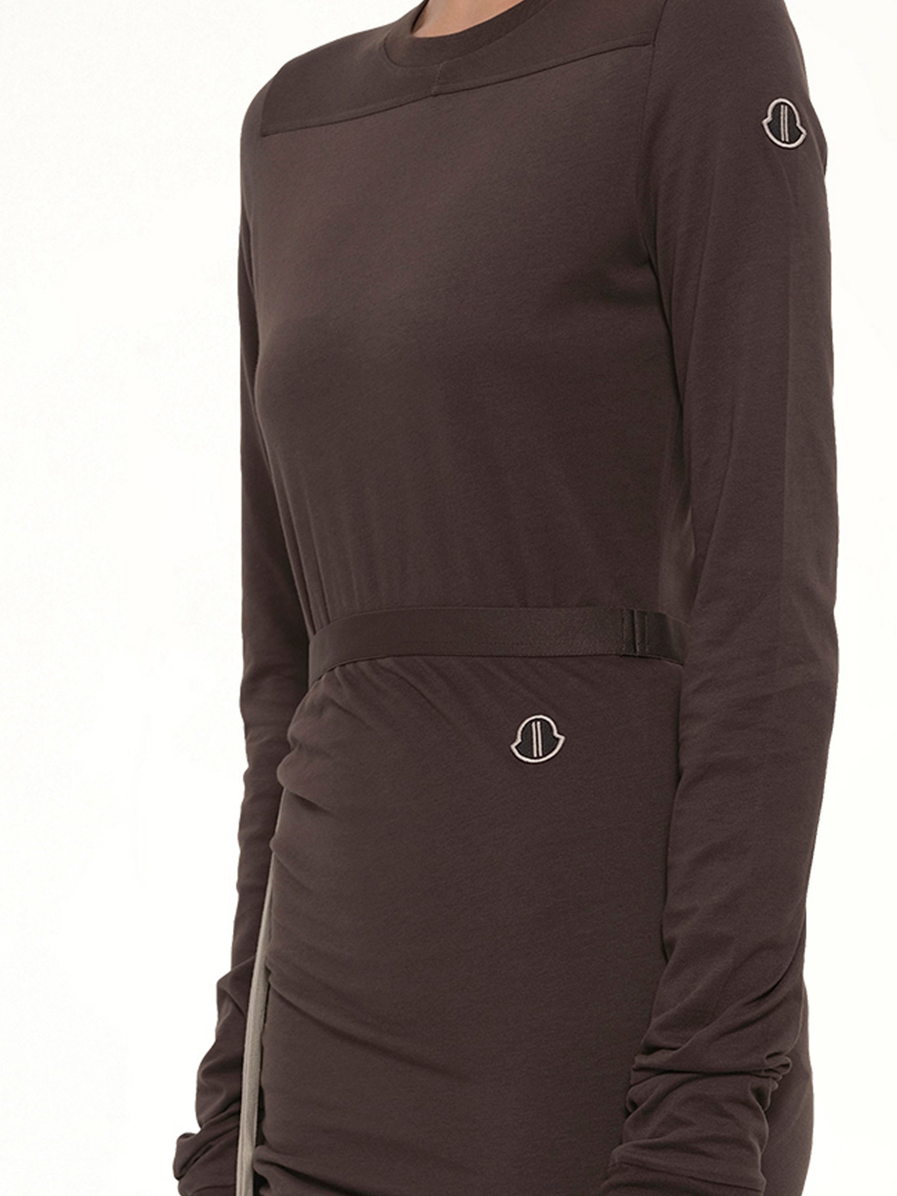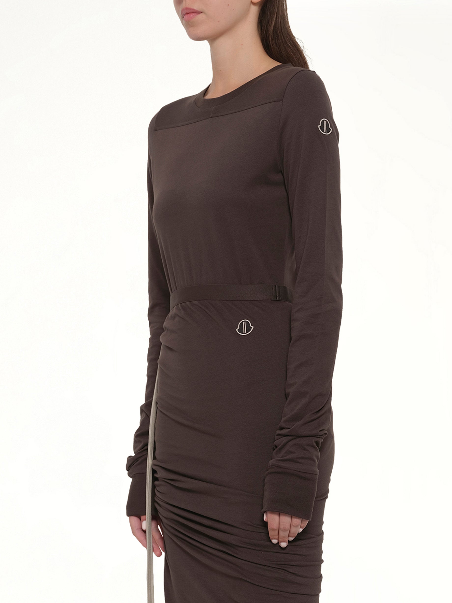 This Moncler + Rick Owens adjustable skirt in mediumweight cotton jersey trails floor length and has a slit on the right leg. It has an elasticized waistband and a slim fit. It drapes and wraps around the hips, and gathers into a seam on the right thigh. The side split can be modified using the drawstring. A higher, or lower, split creates increased draping and ruching. Its train lays floor length to the left. It has the Moncler + Rick Owens embroidered logo patch on the left hip.