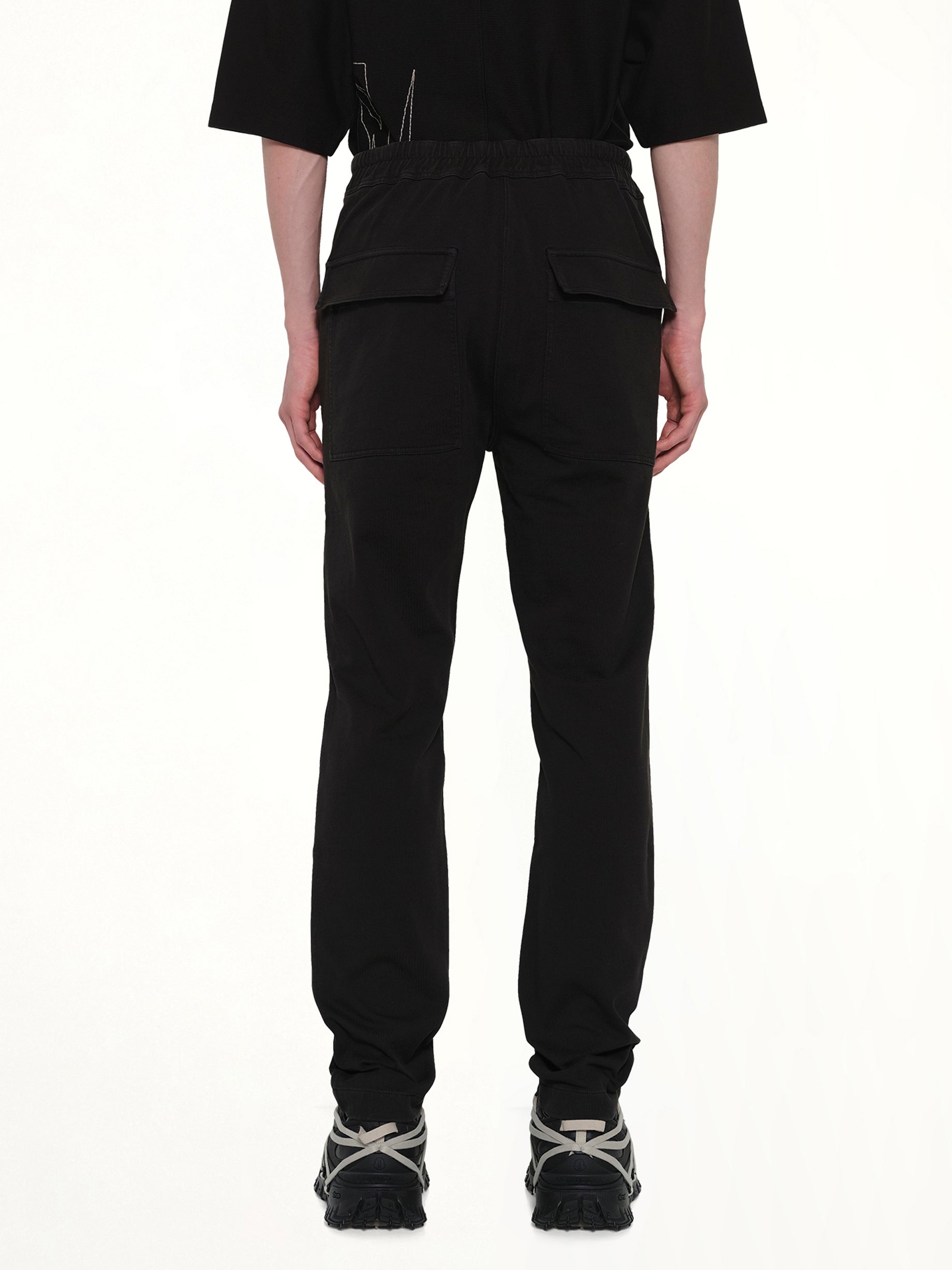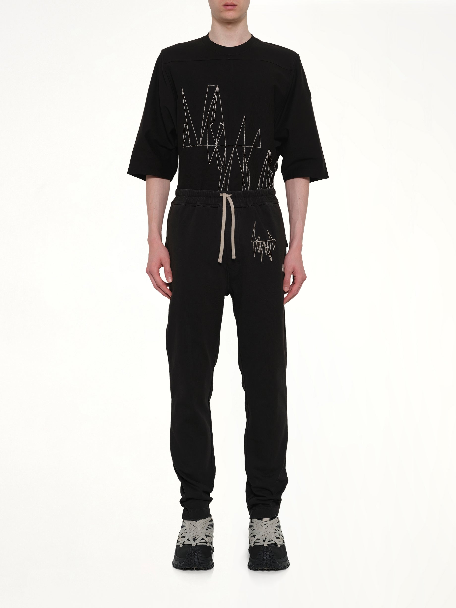 This Moncler + Rick Owens jogger in heavy cotton jersey are full-length with a loose fit. They feature a fixed waistband with drawstring, side pockets and back pockets with flaps. They have the Moncler + Rick Owens embroidered logo patch on the left thigh along with a small geocamo detail.