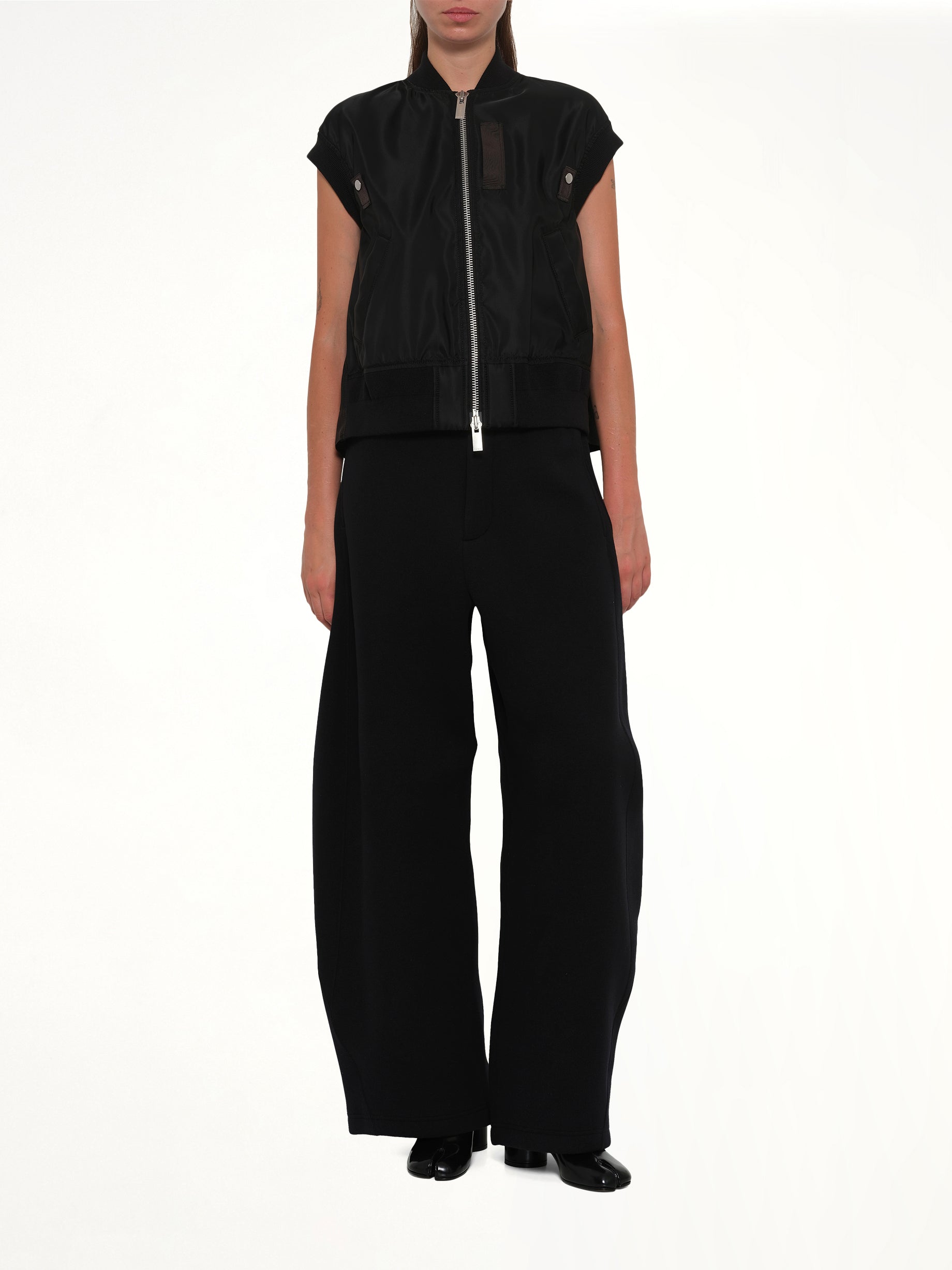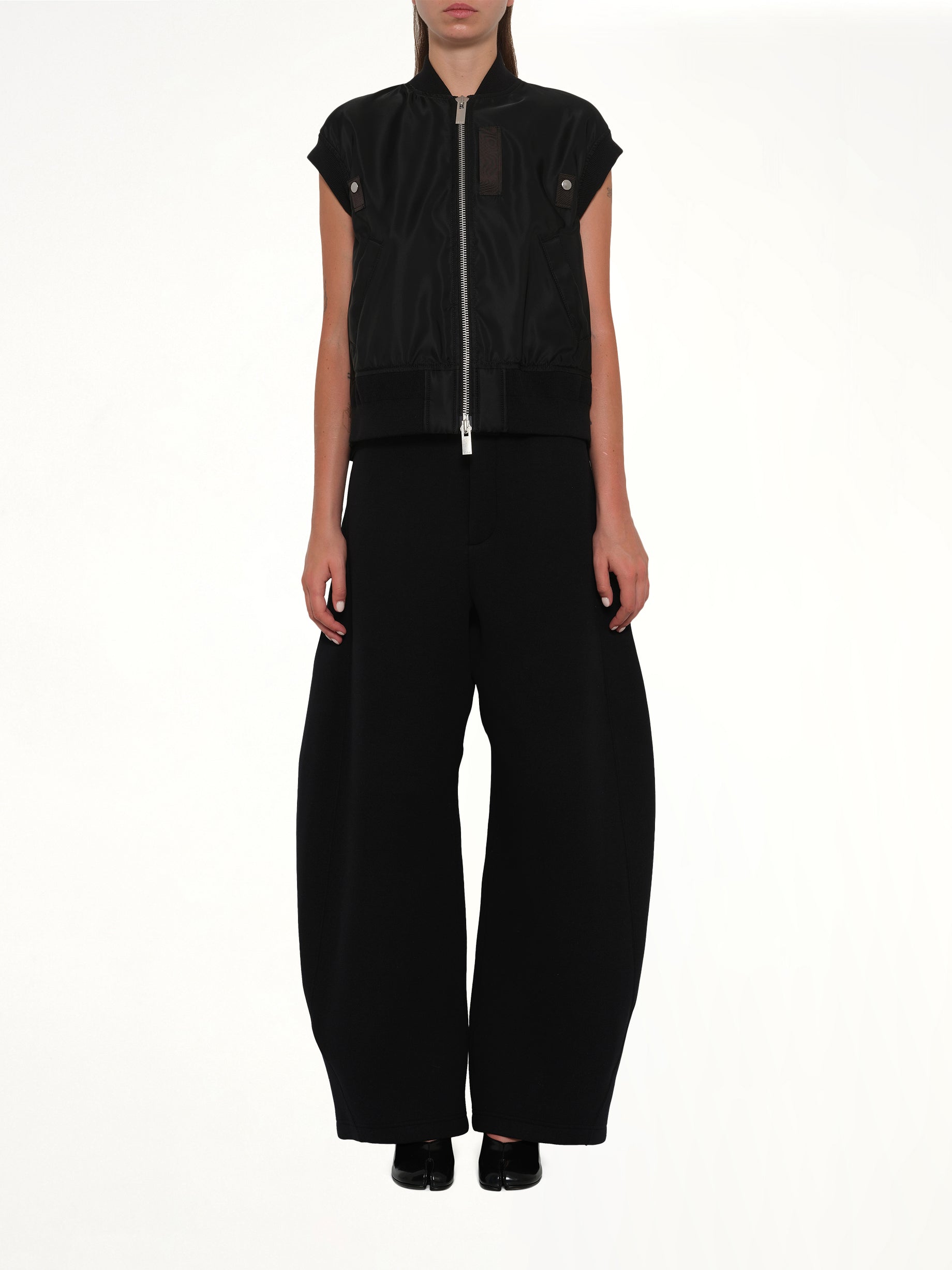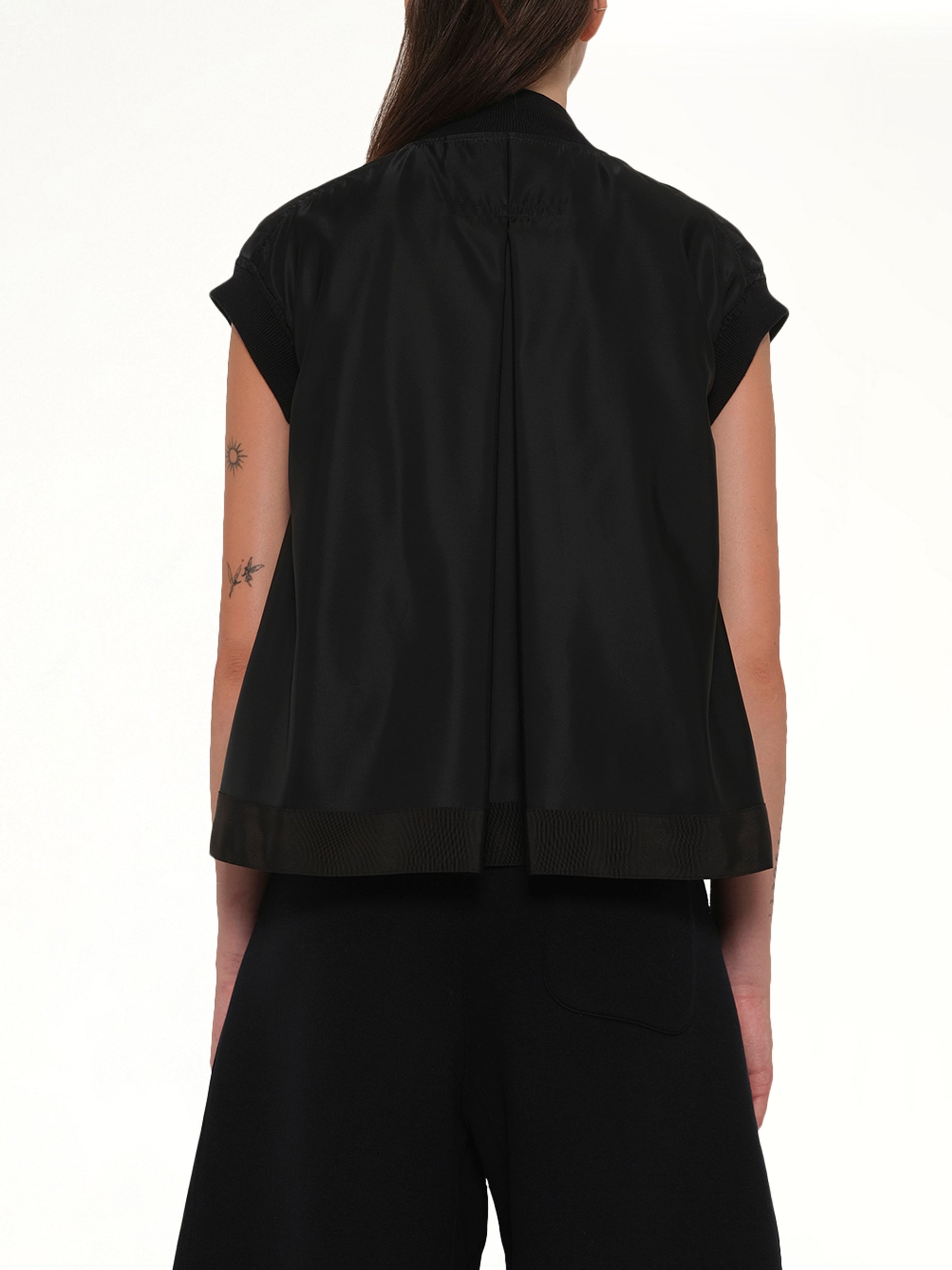 Sacai's Nylon Twill Vest in Black is a versatile and stylish addition to any wardrobe. This vest combines functionality with a modern aesthetic, making it perfect for layering in various outfits.