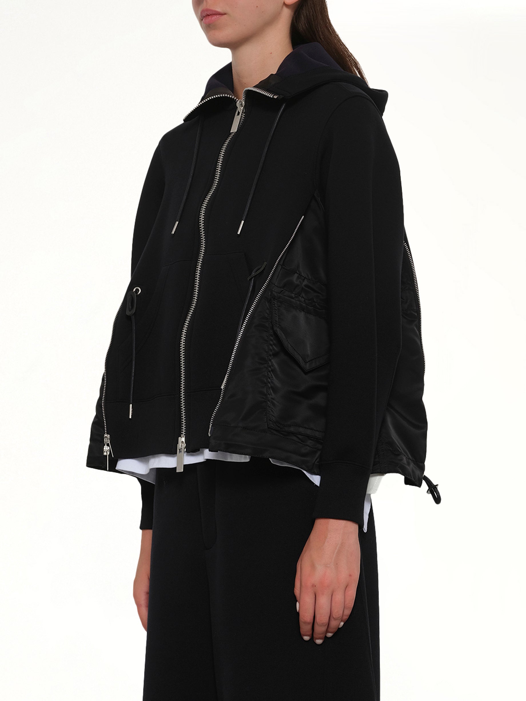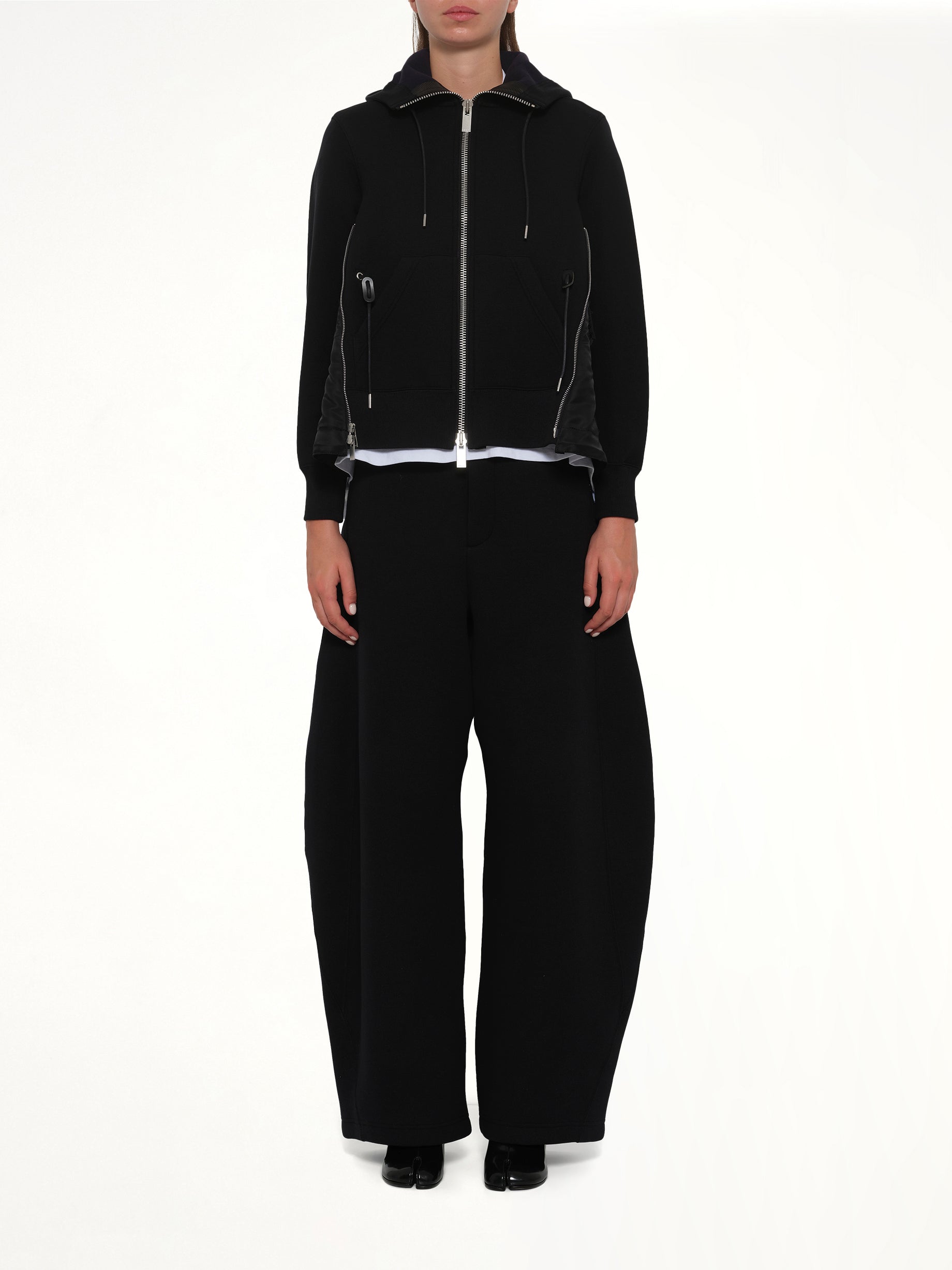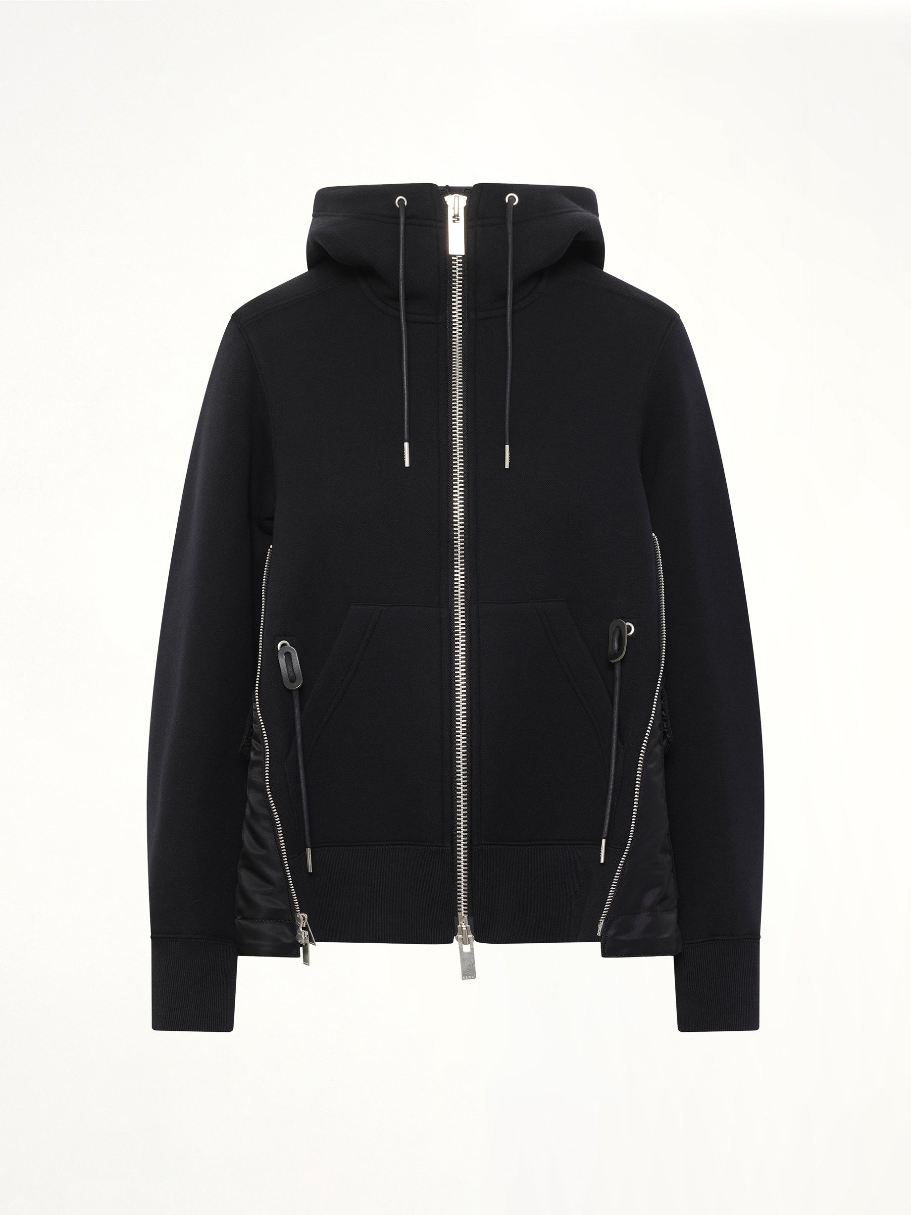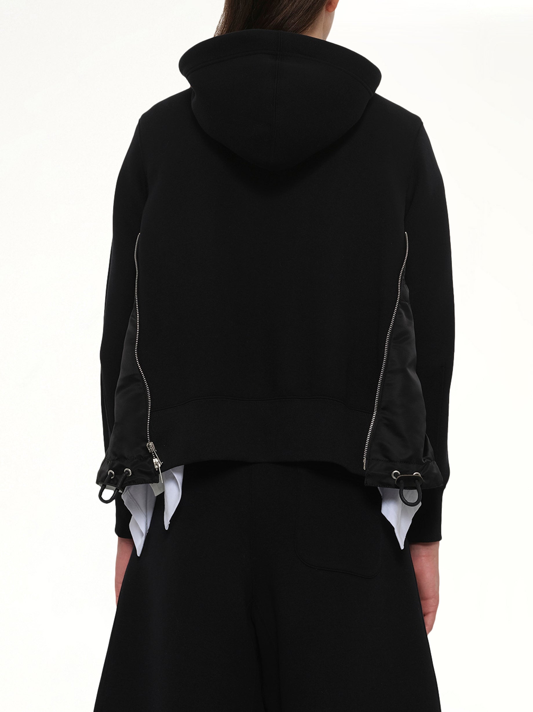 Sacai's Sponge Sweat x Nylon Twill Hoodie in Black is a unique blend of comfort and style, perfect for modern streetwear enthusiasts. This hoodie combines innovative design with practical features, making it a versatile addition to any wardrobe.