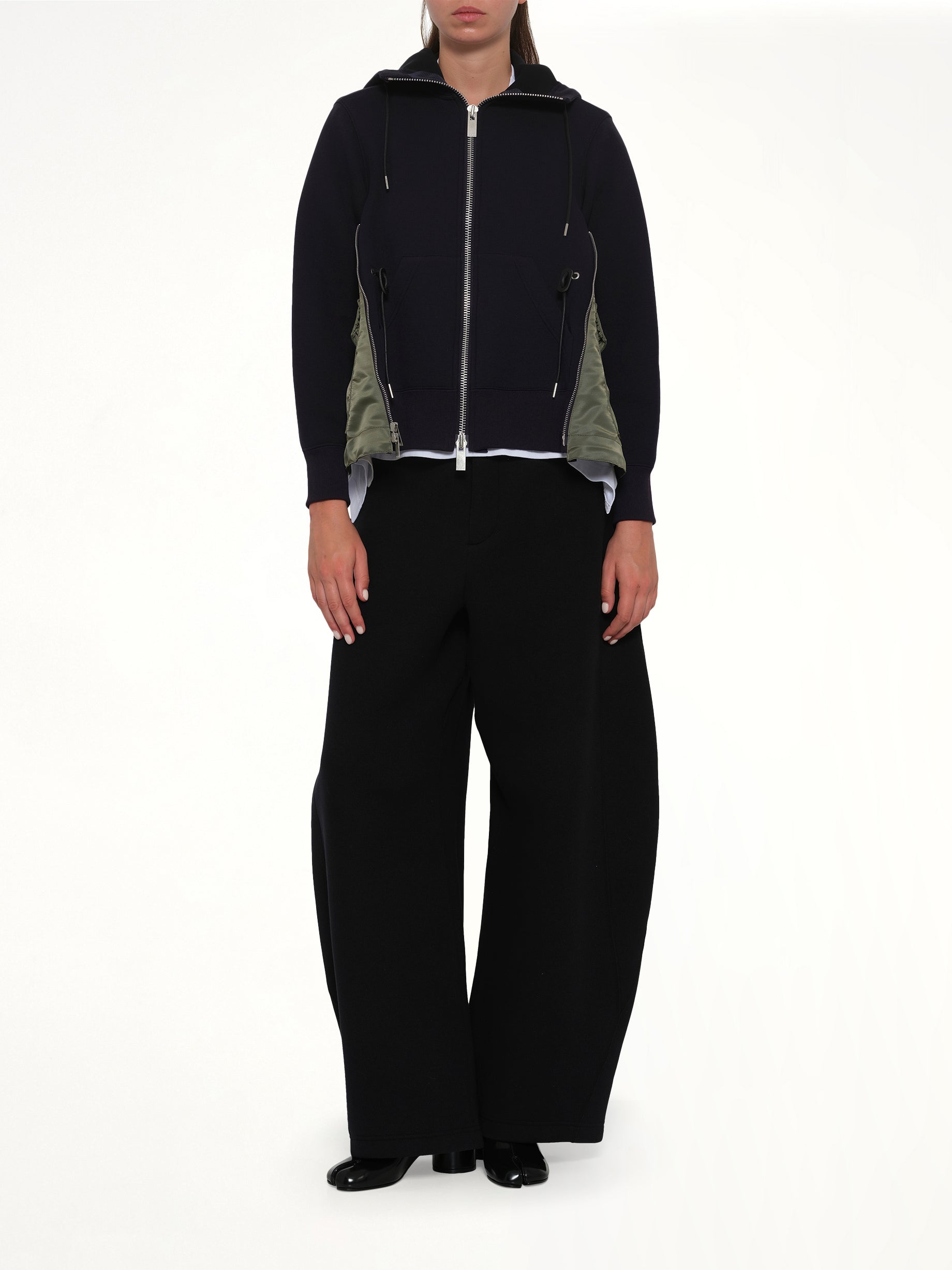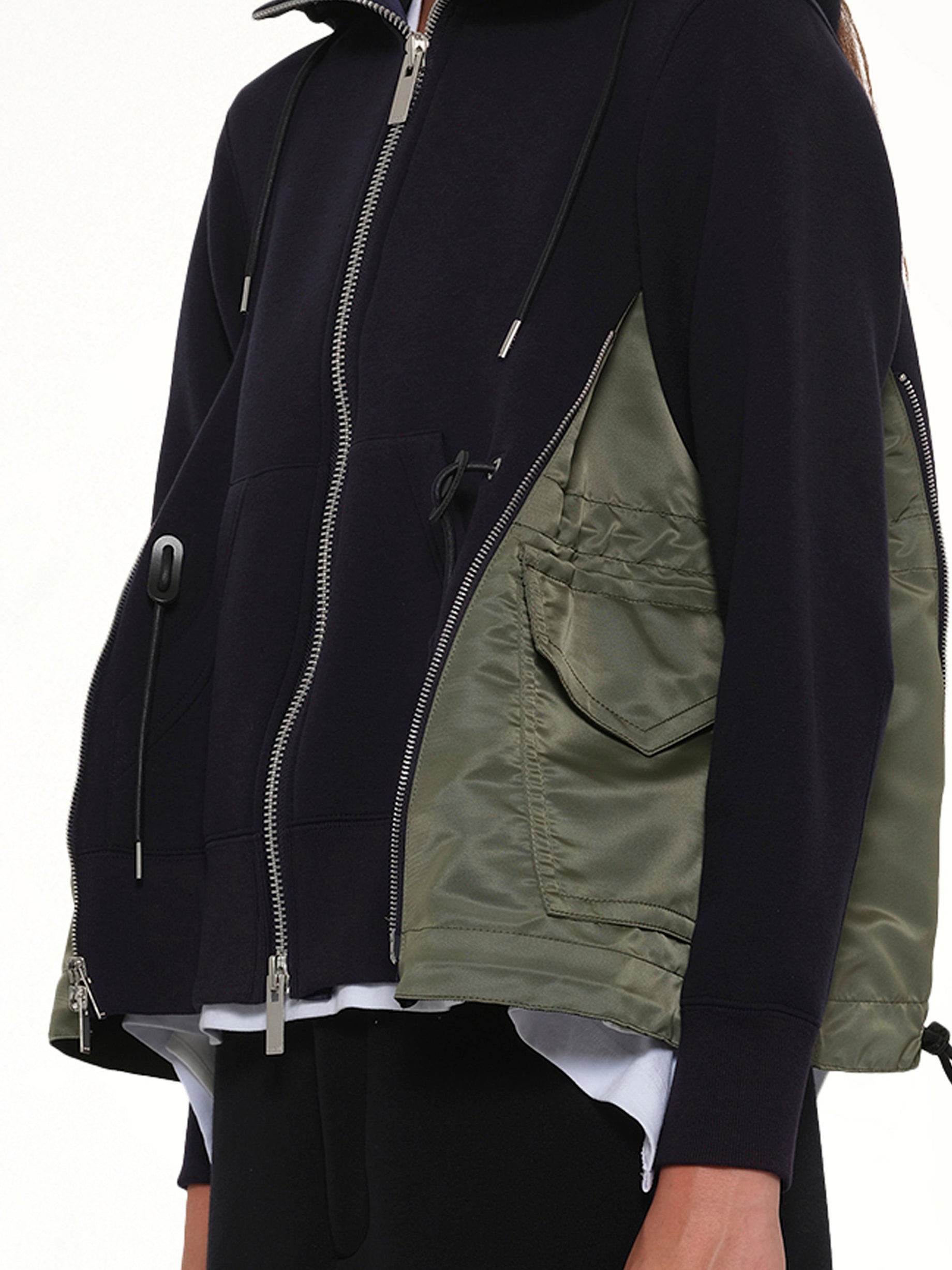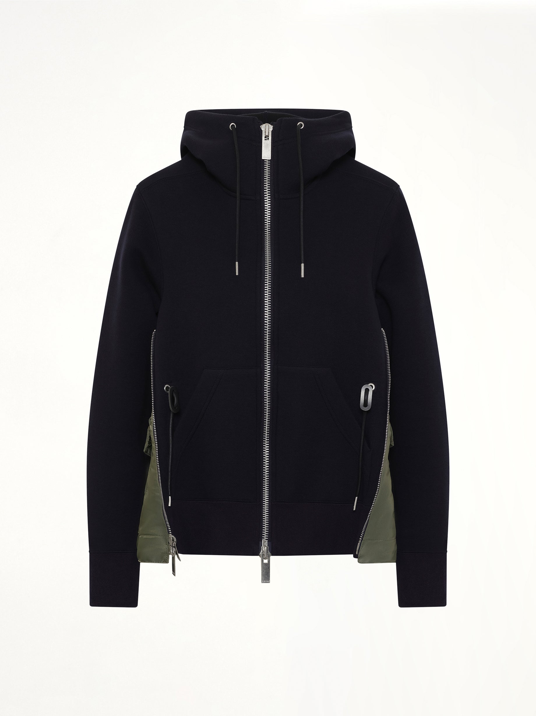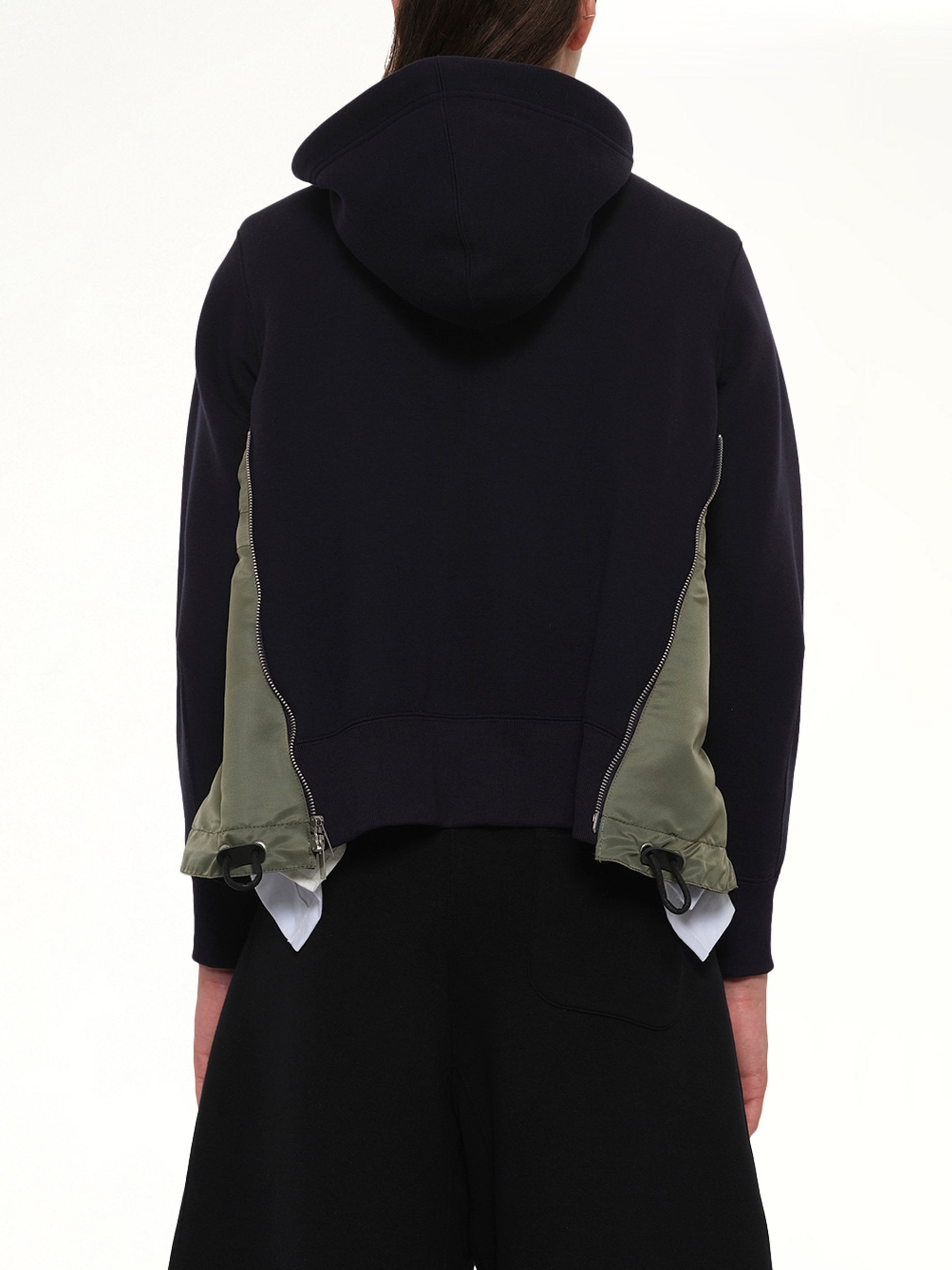 Sacai's Sponge Sweat x Nylon Twill Hoodie in Navy/Khaki is a versatile and stylish addition to any wardrobe. This hoodie combines comfort with a modern aesthetic, making it perfect for both casual and semi-formal occasions.