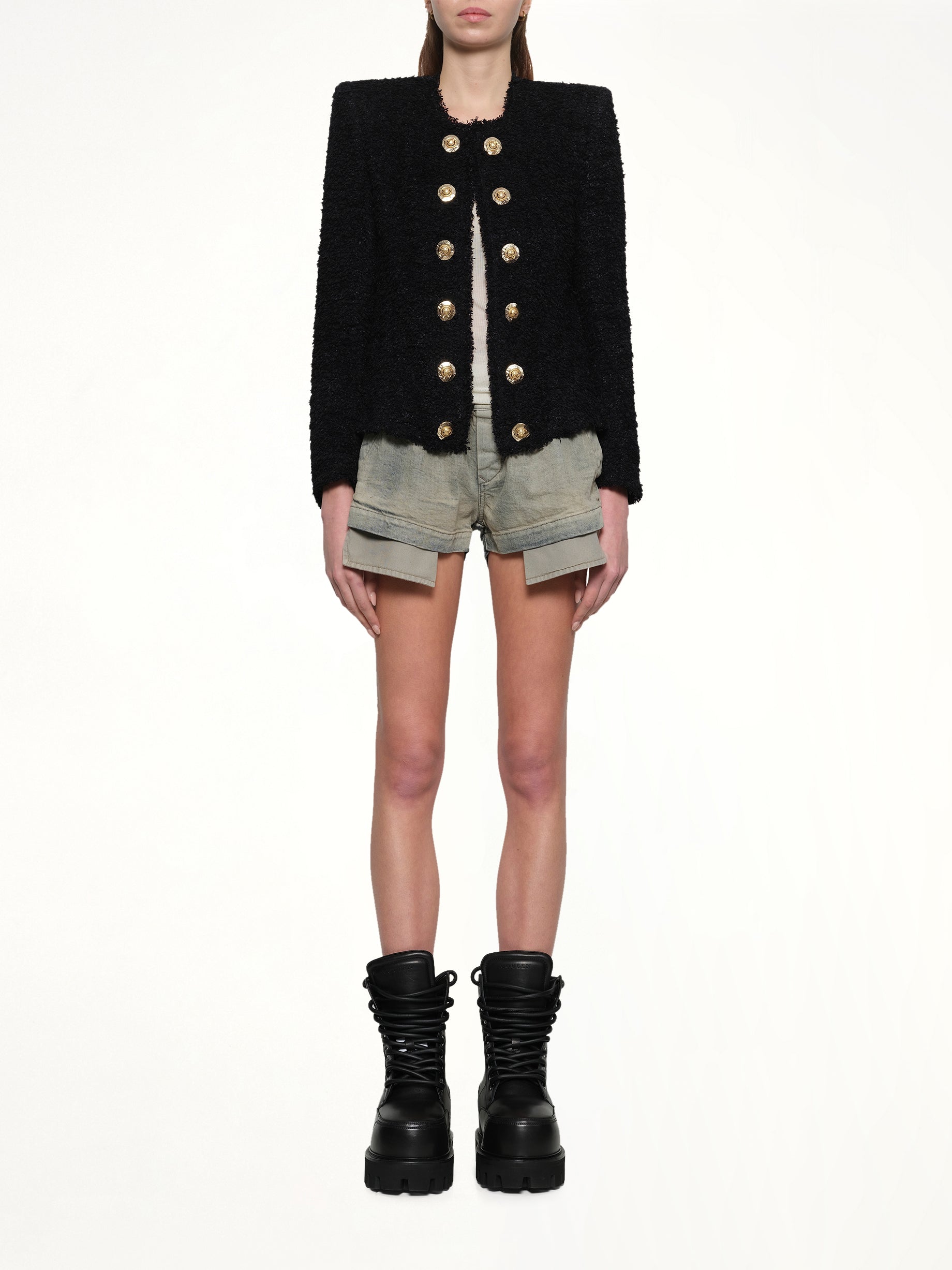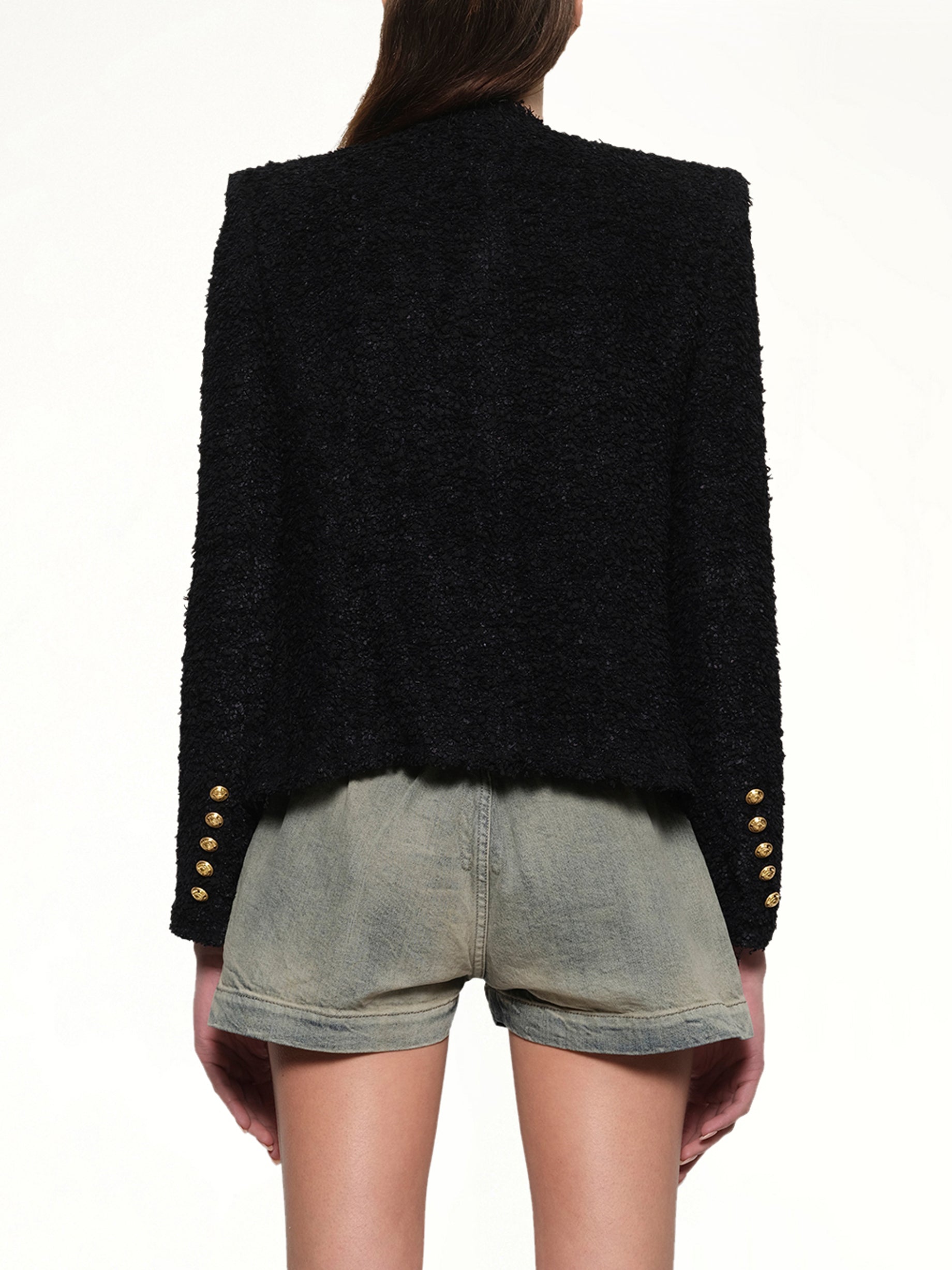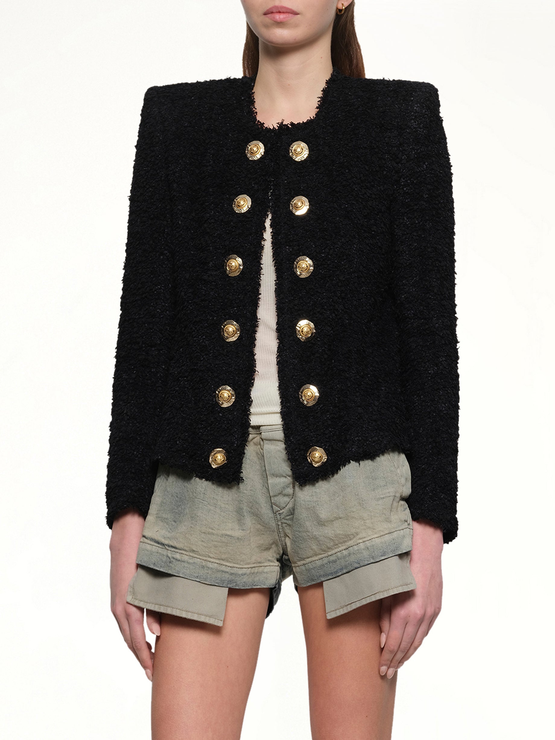 Balmain's Tweed Spencer Jacket in Black is a sophisticated and timeless piece that exudes elegance. Perfect for both formal and casual occasions, this jacket is a must-have addition to any wardrobe.