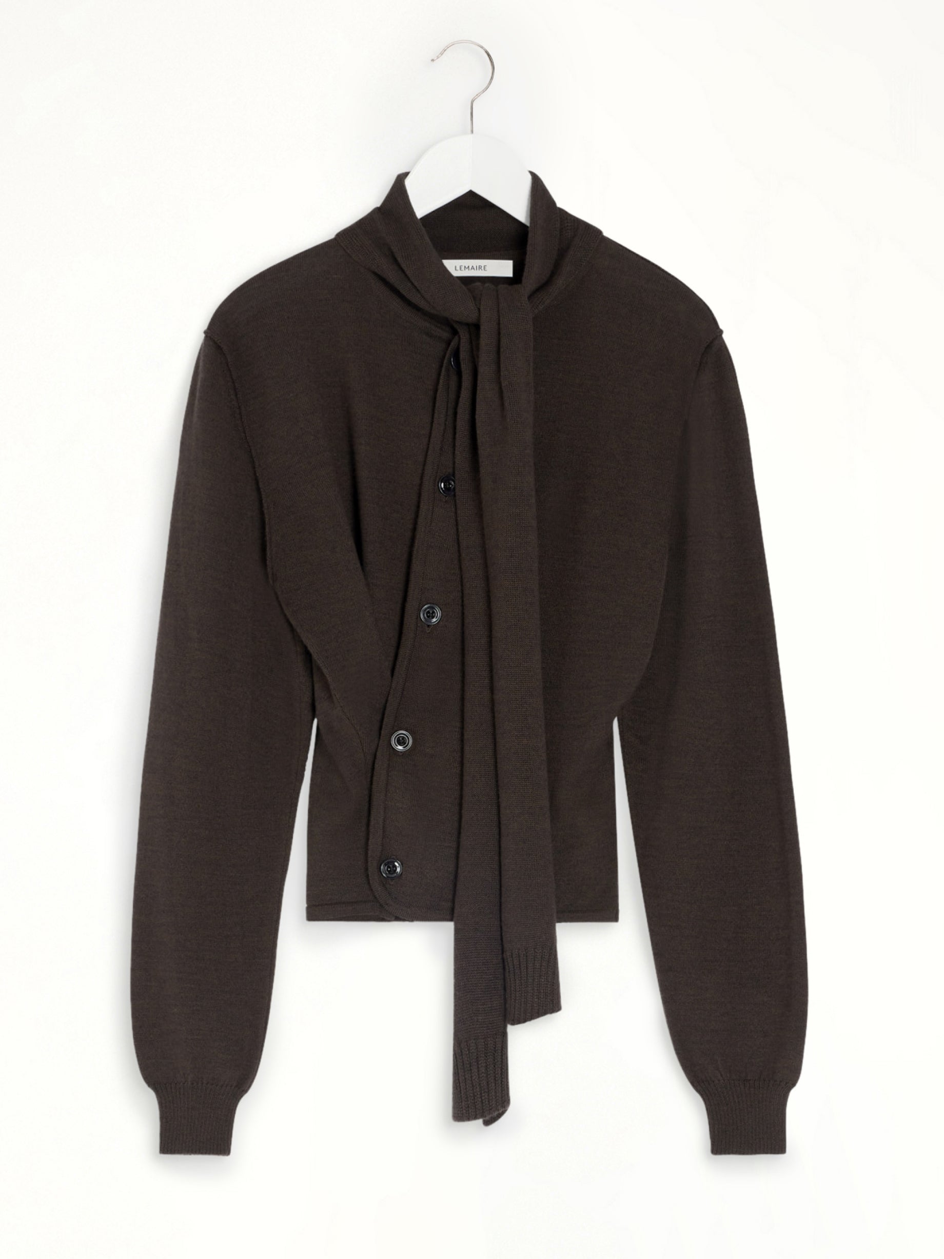 Lemaire's Twisted Cardigan With Scarf in Dark Cacao is a sophisticated and versatile piece that combines elegance with comfort. This unique design features a built-in scarf, adding a touch of modernity to a classic silhouette.
