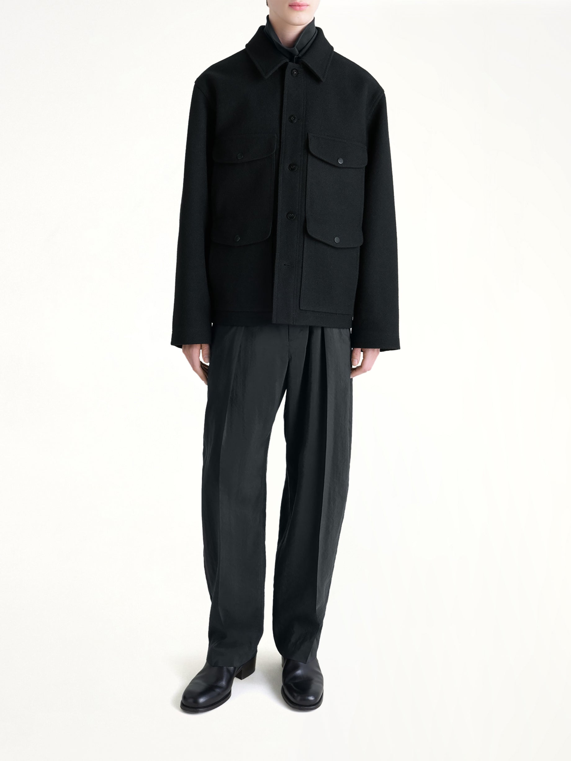 Lemaire's Utility Jacket in Black is a versatile and stylish outerwear piece designed for both functionality and fashion. Its sleek design and practical features make it an essential addition to any wardrobe.