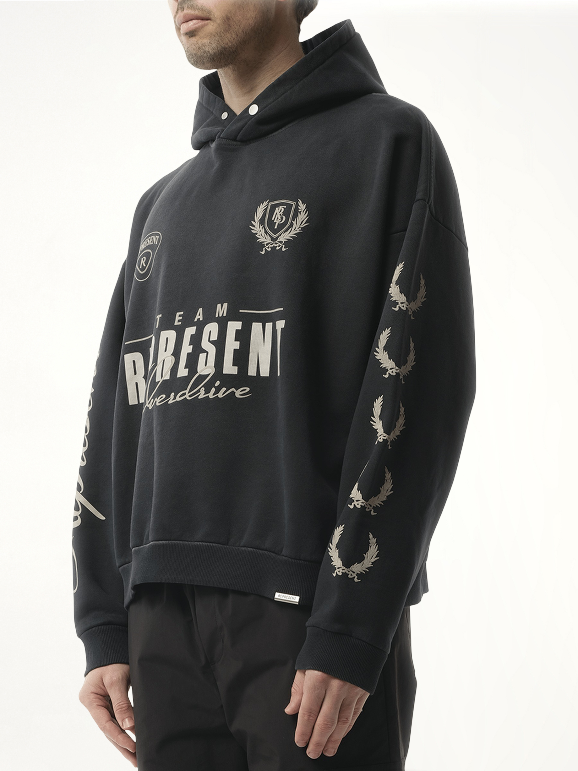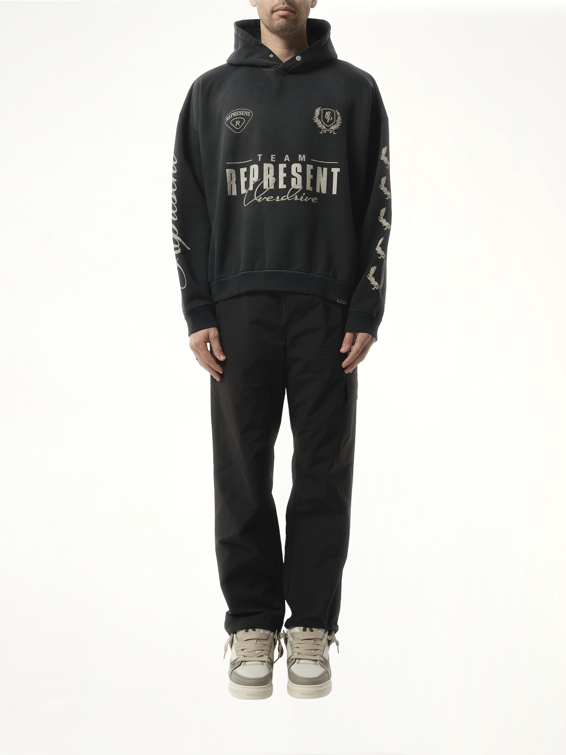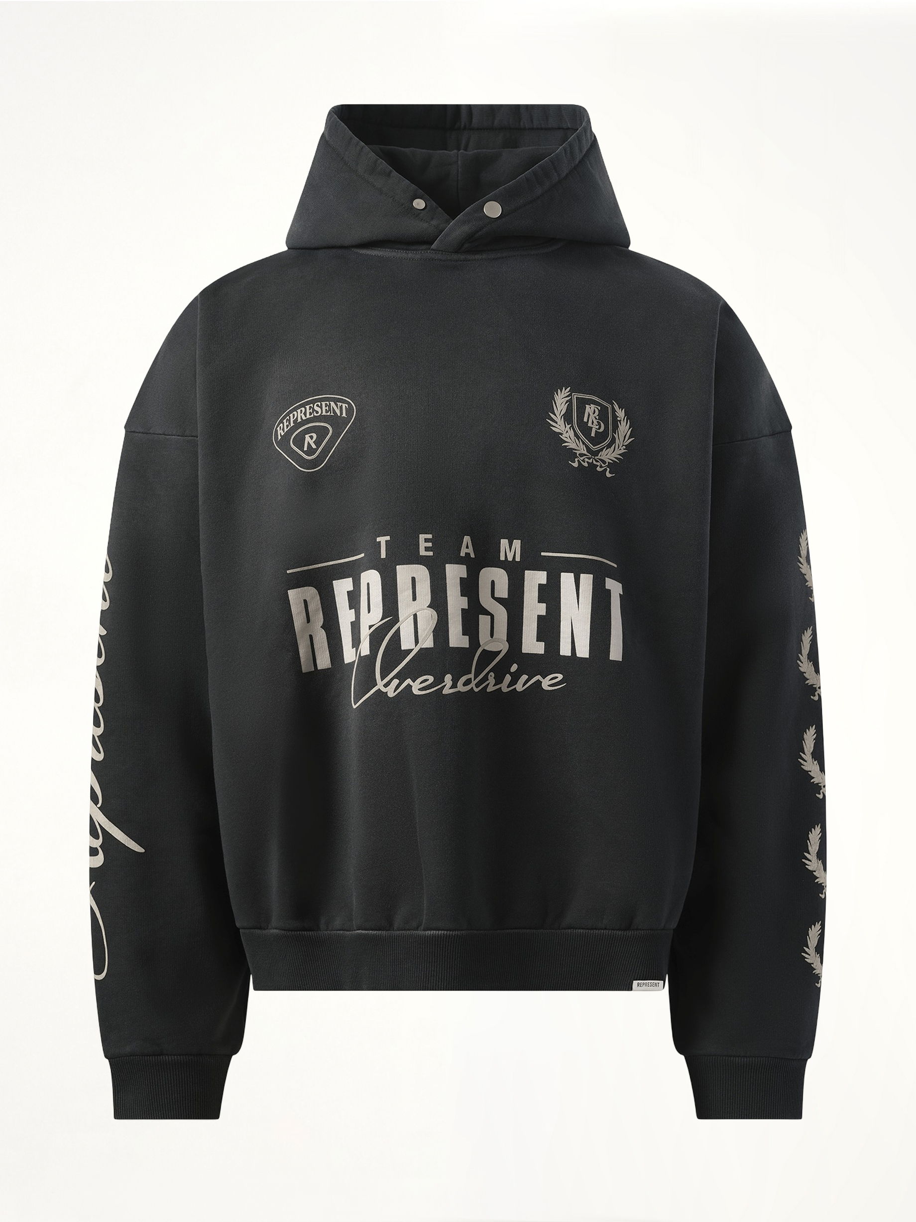 - Finished with Represent metal bar logo at the hem