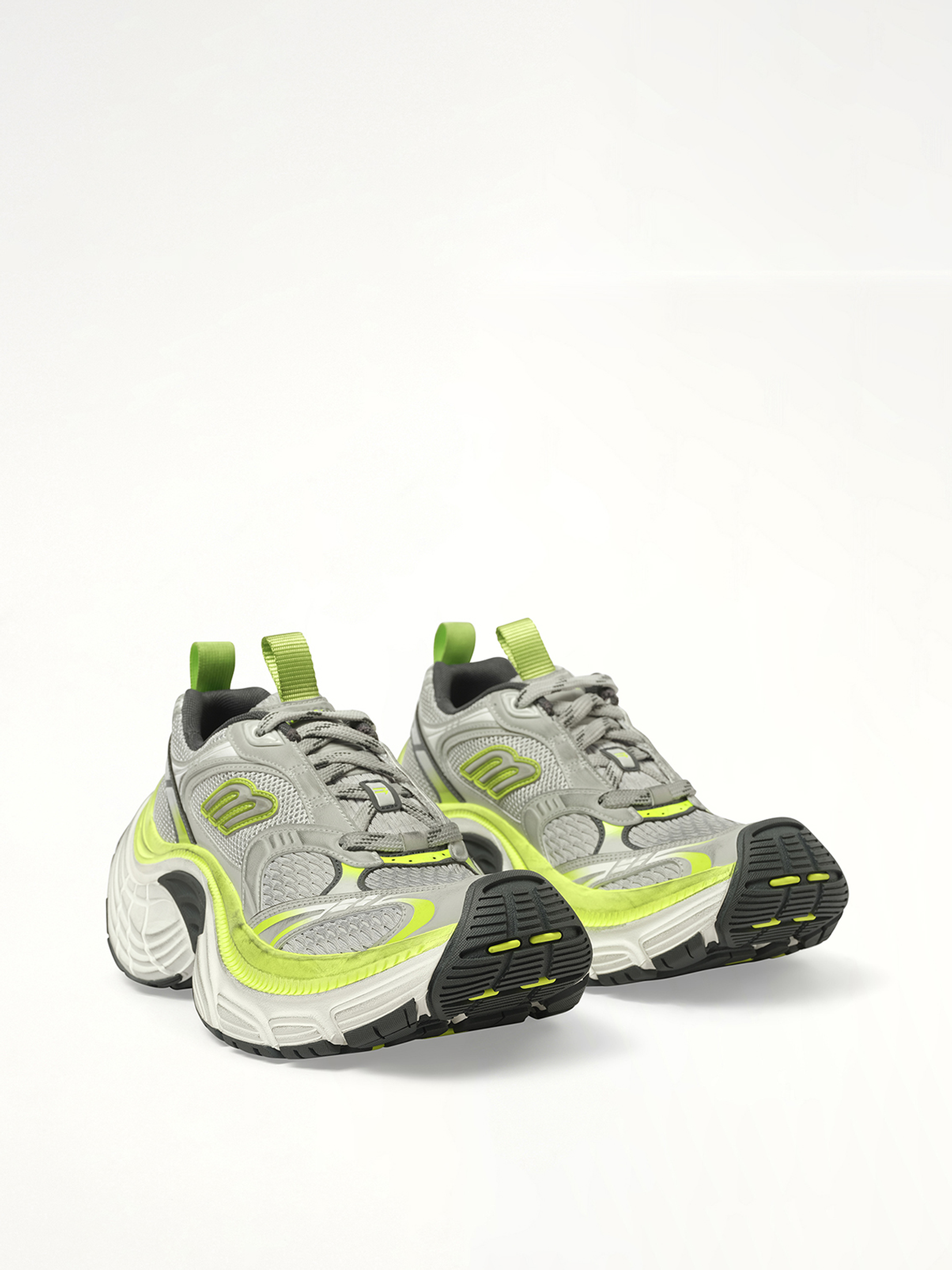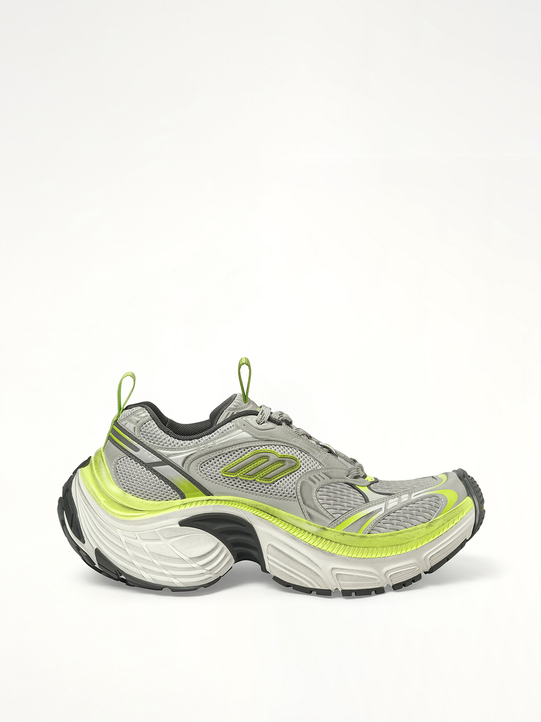 Balenciaga's 6XL Sneaker in Grey/White/Green/Fluo Yellow is a bold statement piece that combines contemporary design with vibrant color accents. Elevate your streetwear game with this eye-catching sneaker that offers both style and comfort.