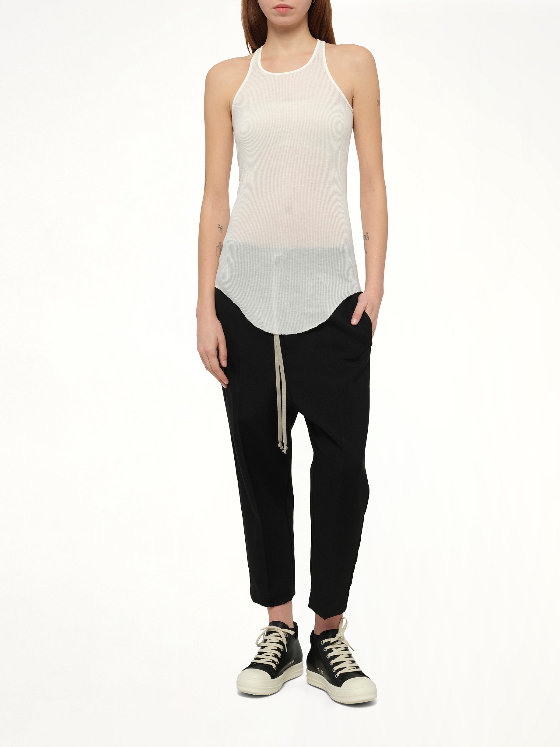Rick Owens's Basic Rib Tank in Milk is a versatile and essential piece for any wardrobe. This tank offers a sleek silhouette and a comfortable fit, perfect for layering or wearing on its own.
