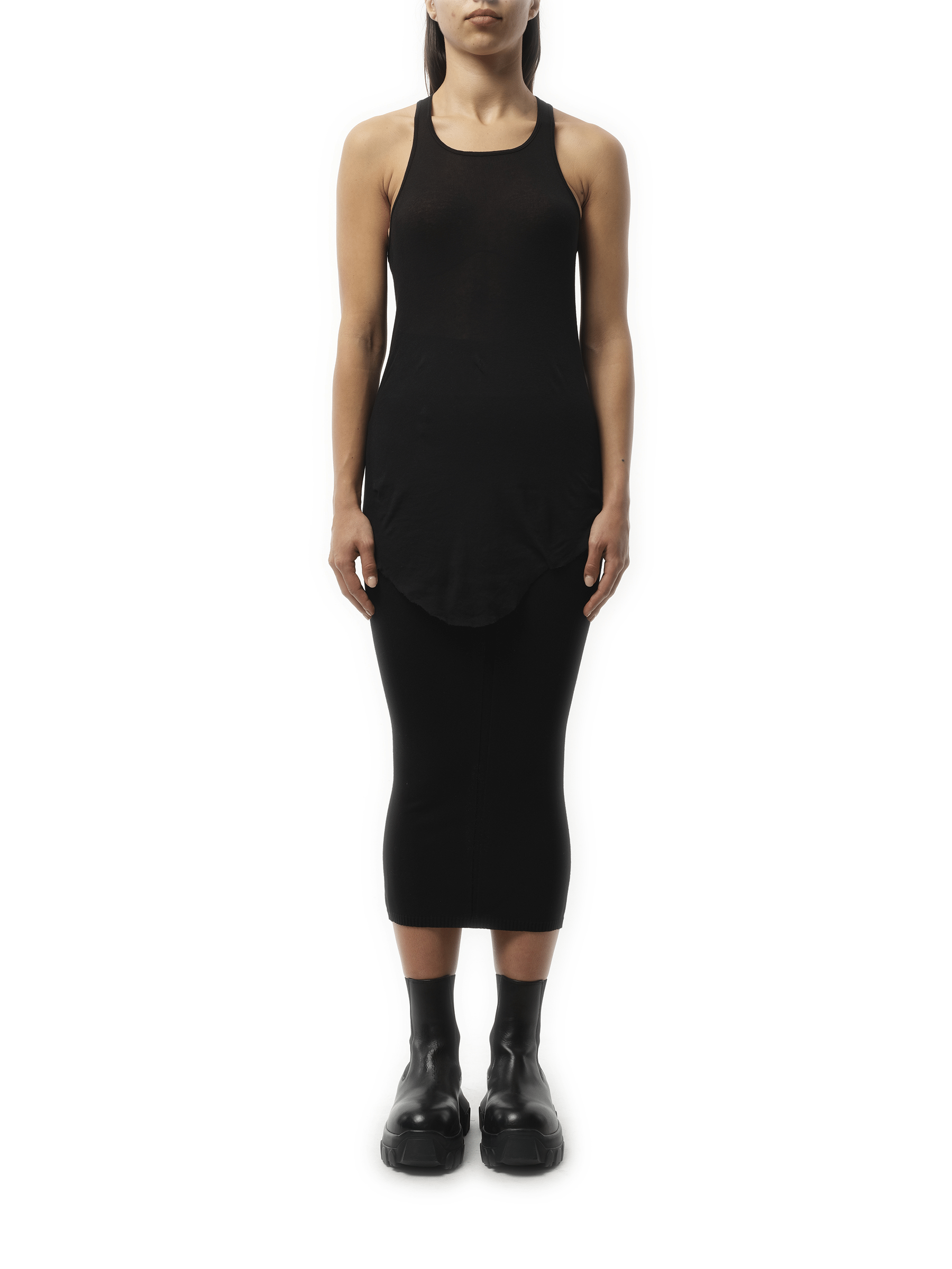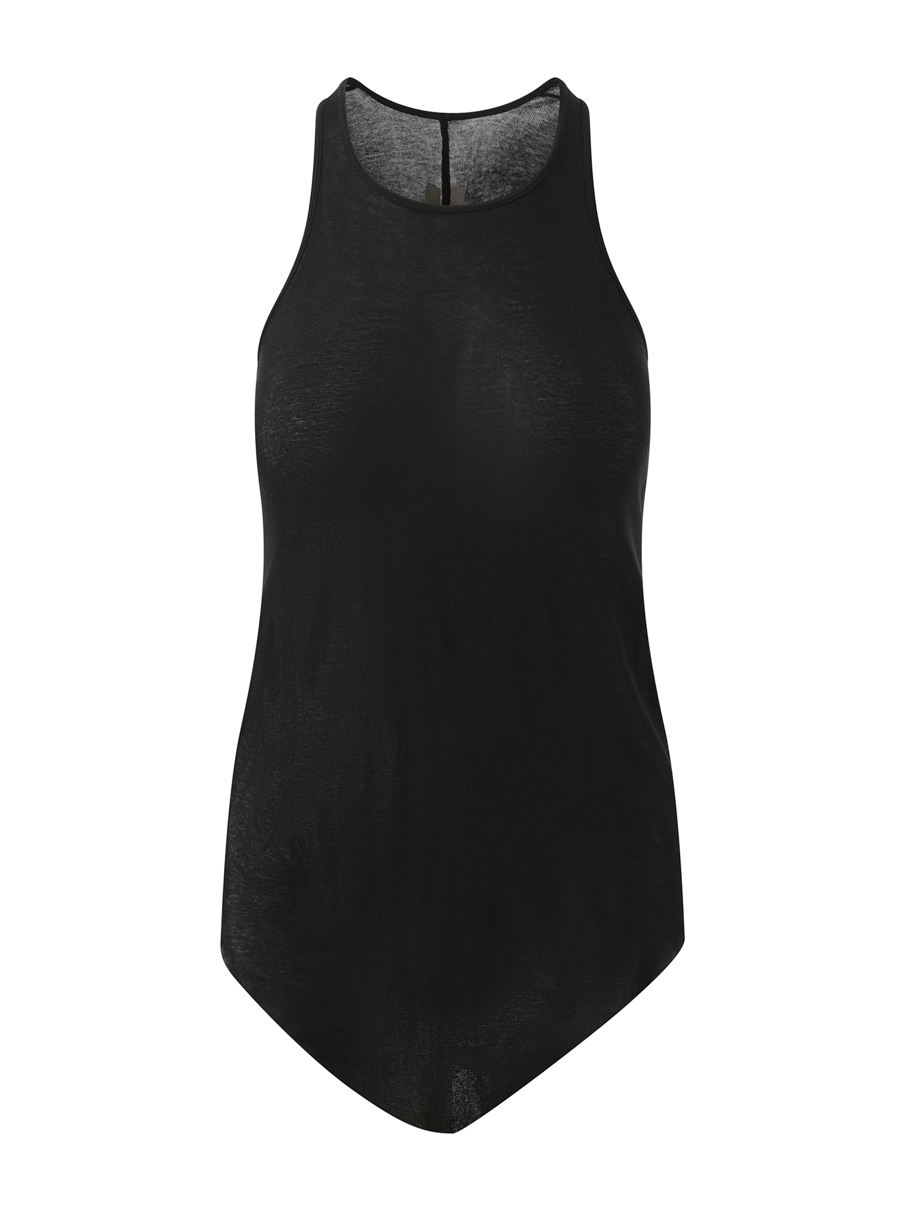 Rick Owens's Basic Rib Tank Top in Black, a minimalist staple cut from lightweight mini rib jersey. This sleeveless silhouette features a rounded raw-cut hem, racerback cut, and signature seam detailing.