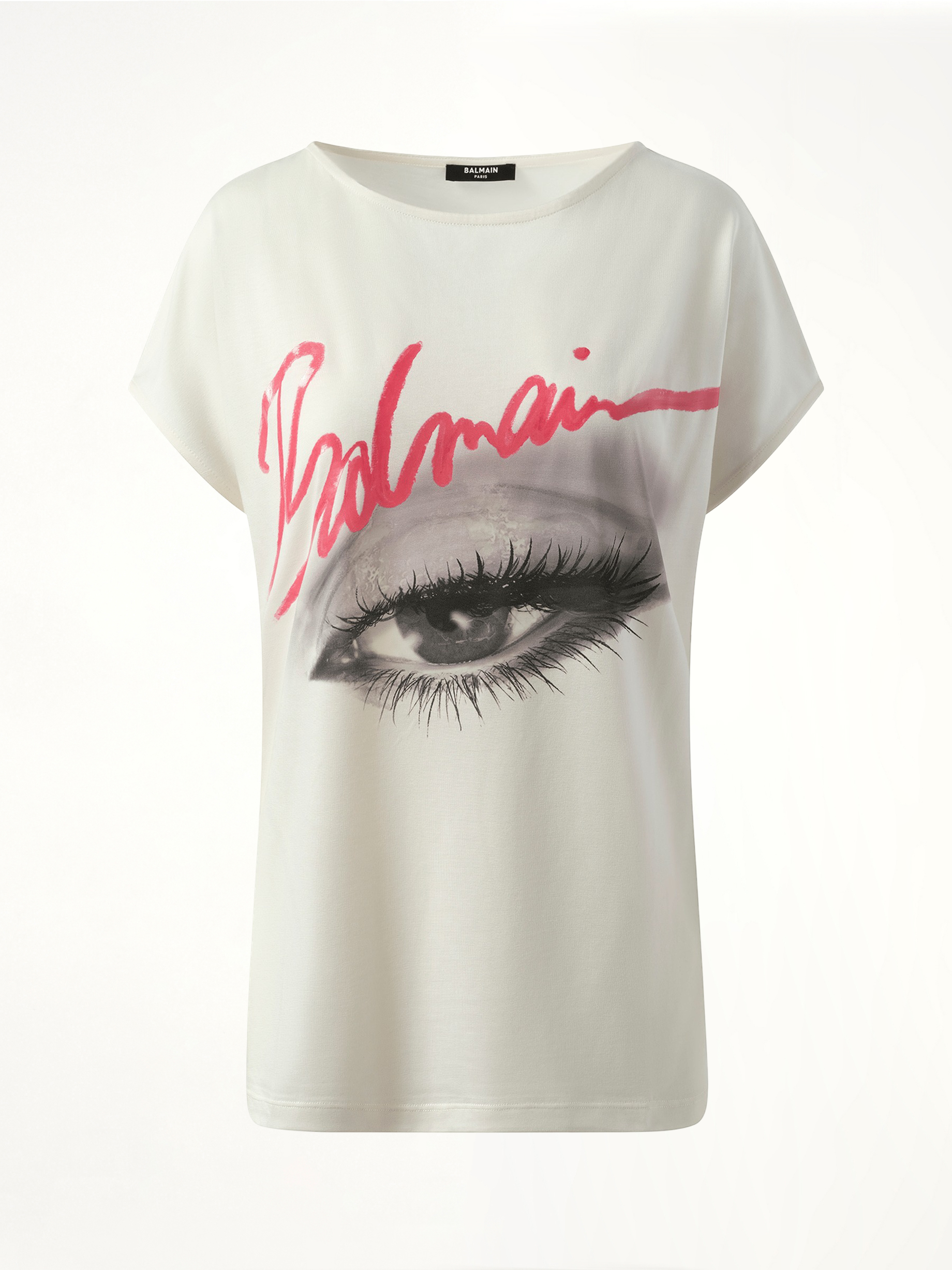 Balmain's Eye Boat Neck Graphic T-Shirt in White offers a striking blend of artistic flair and contemporary design. The bold eye graphic, scripted from creative director Olivier Rousteing's handwriting, adds a distinctive touch to this elegant piece.