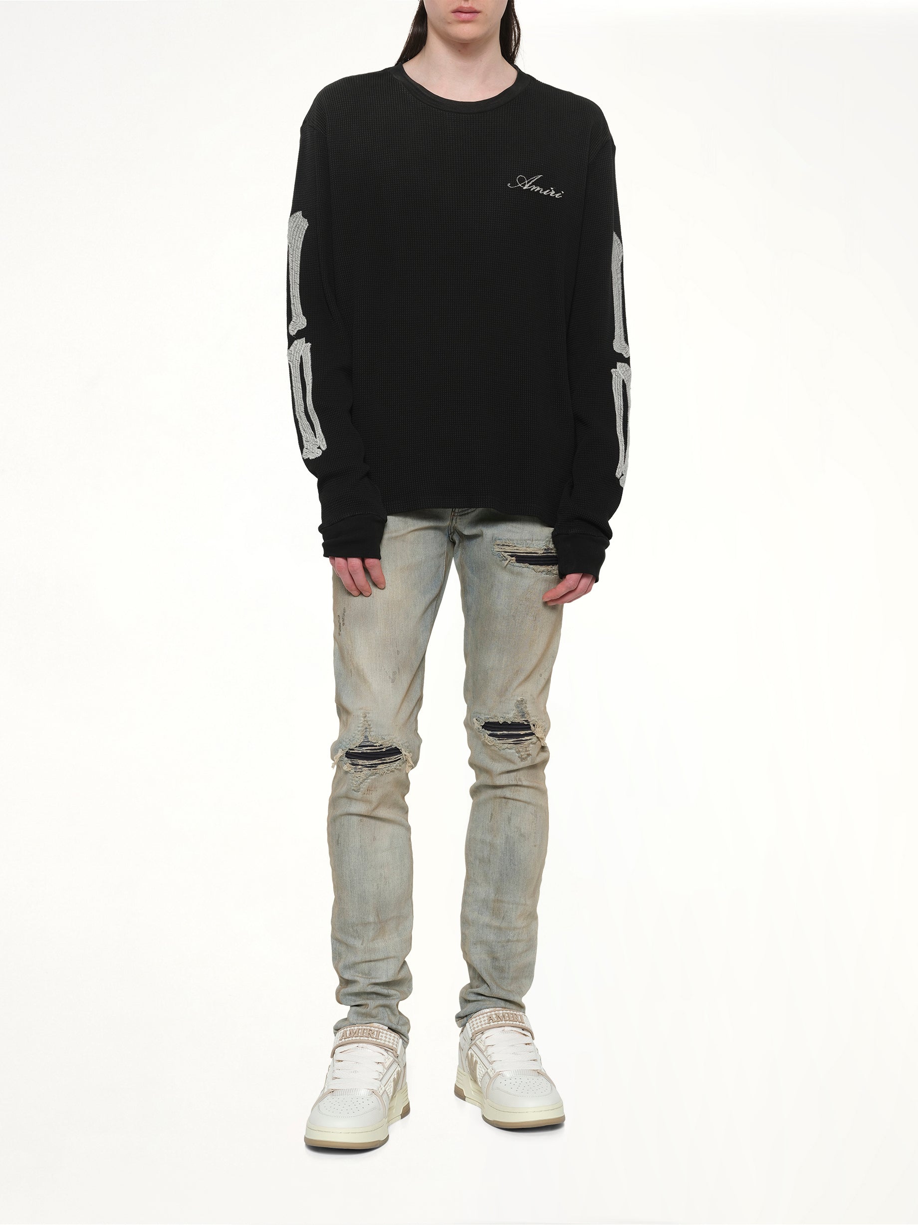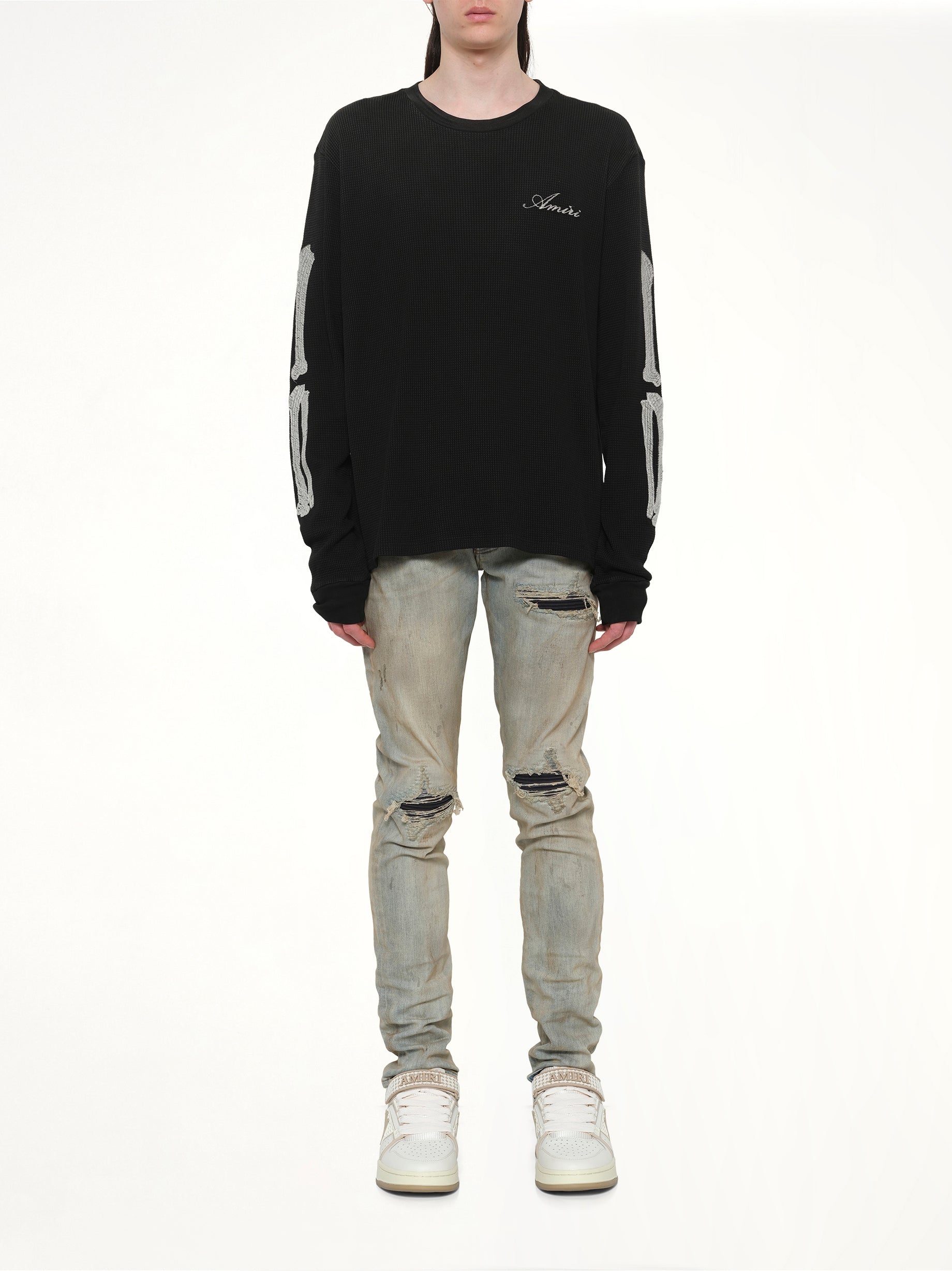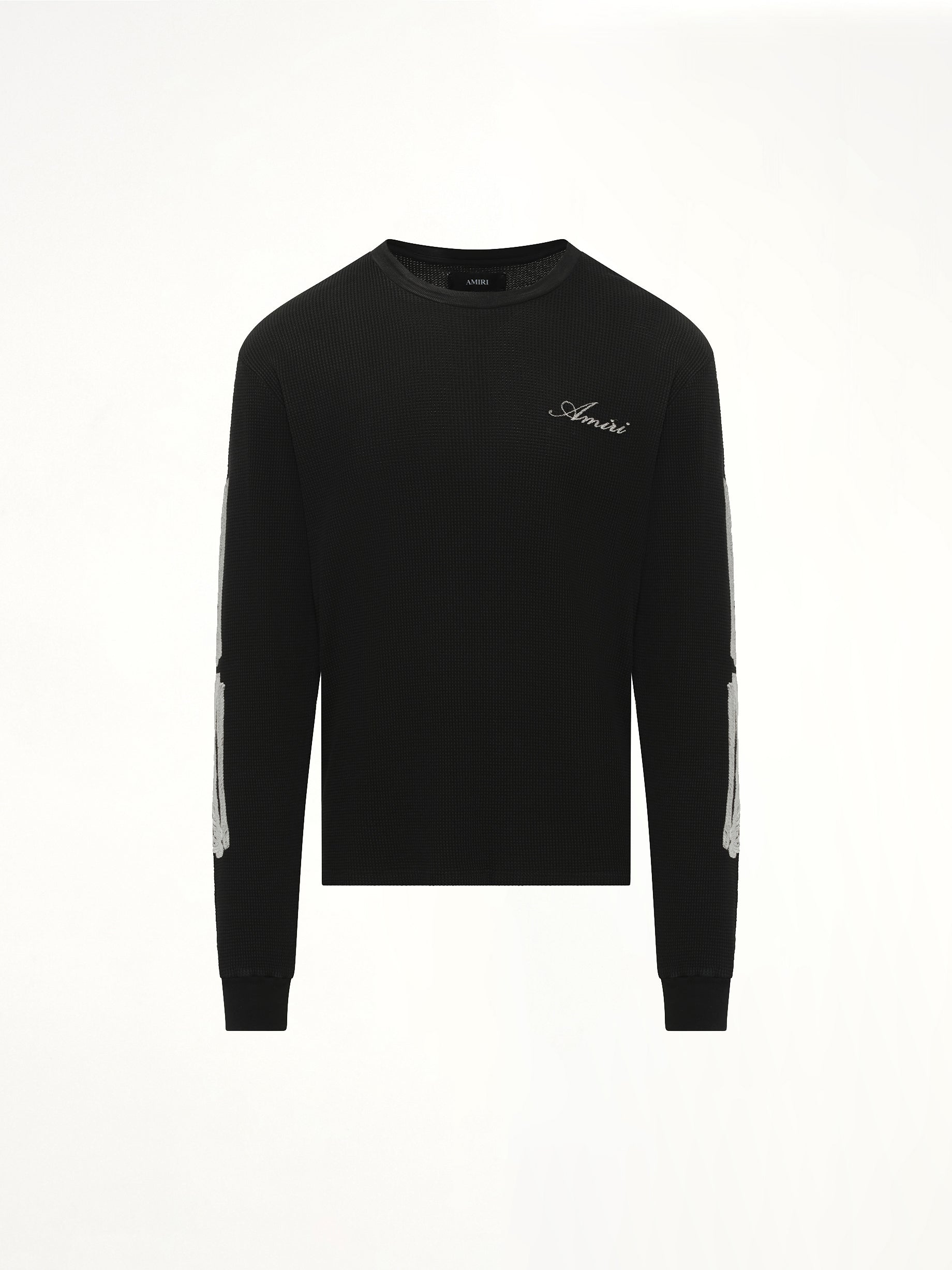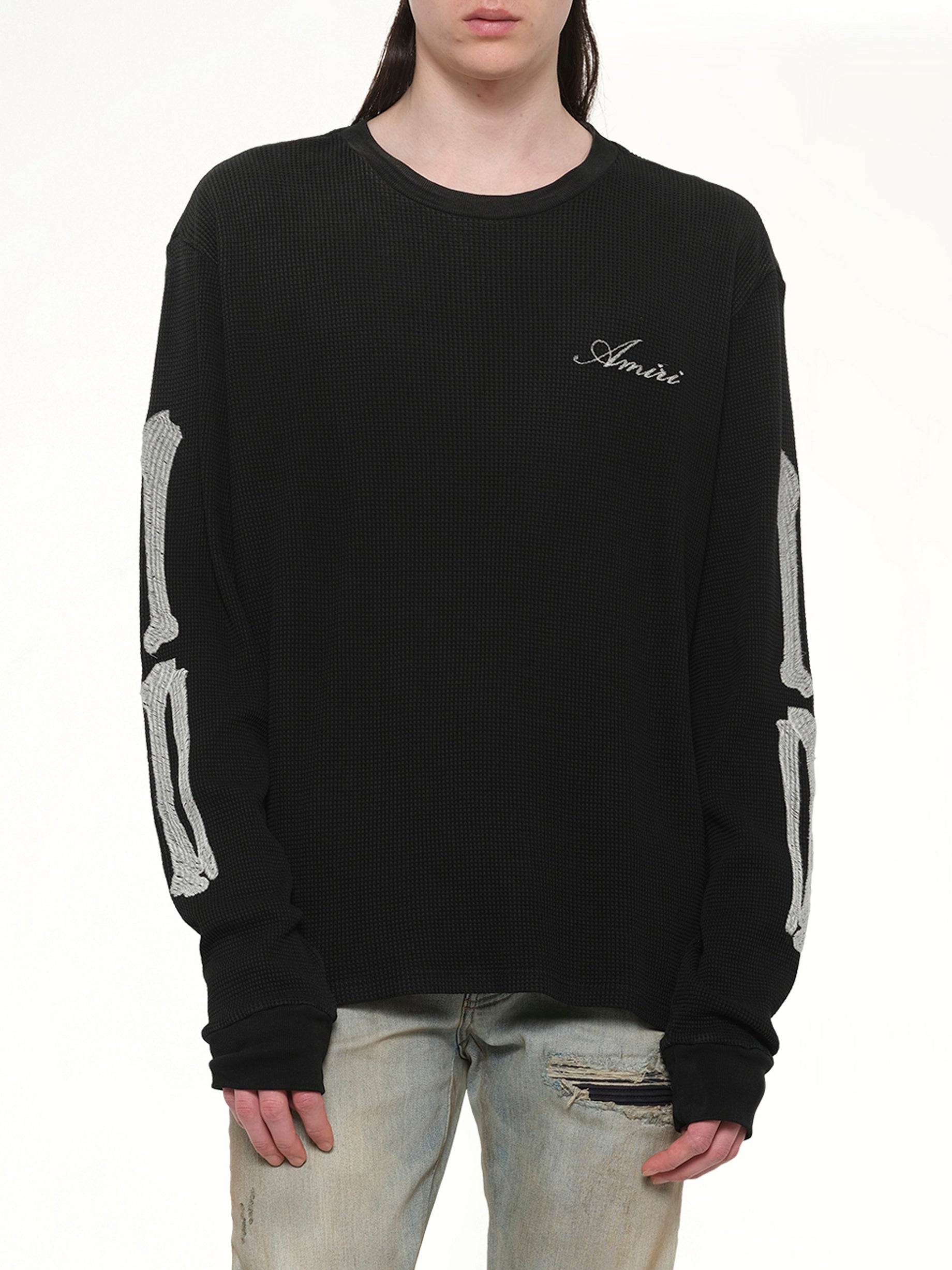 Amiri's Bones LS T-Shirt in Black is a stylish and edgy addition to any wardrobe. Featuring a unique bone graphic design, this long-sleeve tee offers both comfort and a bold fashion statement.