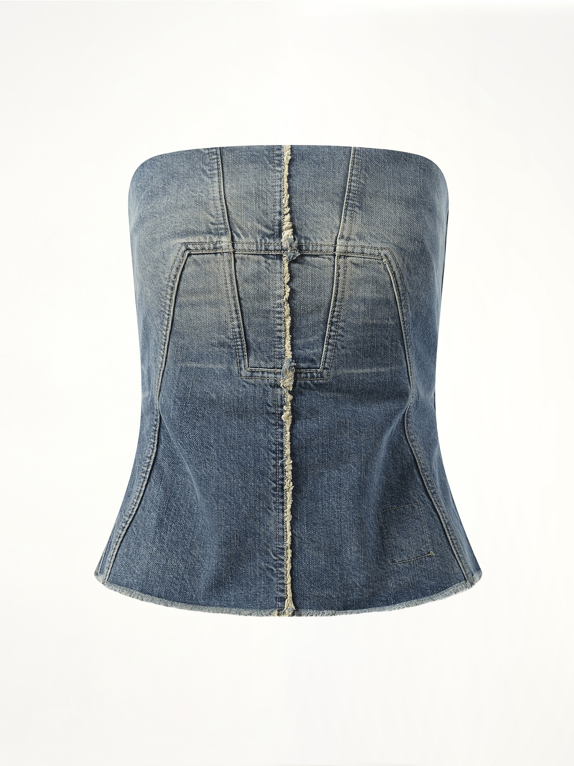 Rick Owens DRKSHDW's Bustier Top in Washed Indigo, this strapless top features a sculptural silhouette with distinctive seam lines. Crafted from 13 oz washed indigo denim, it showcases raw-cut hems for a deconstructed look.