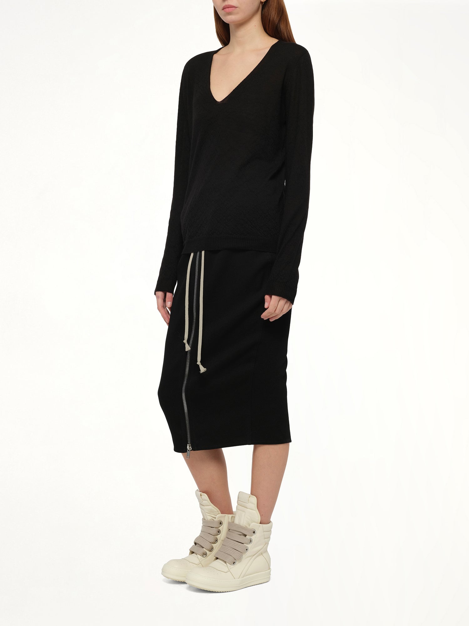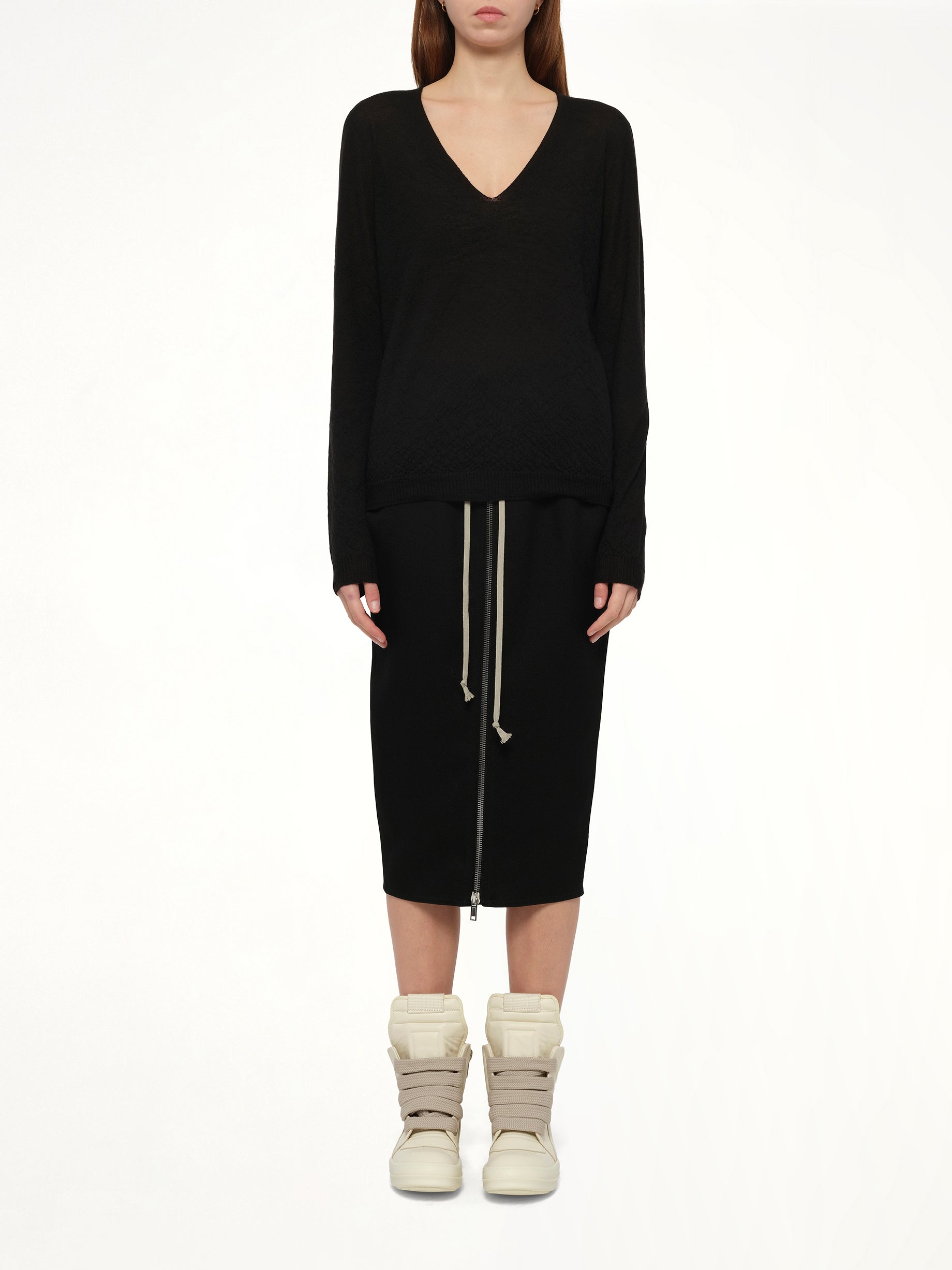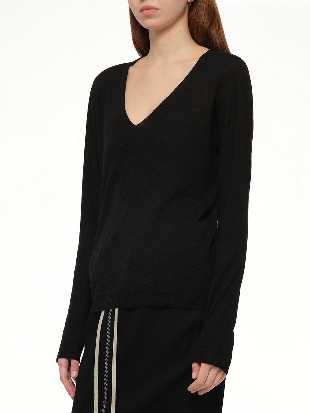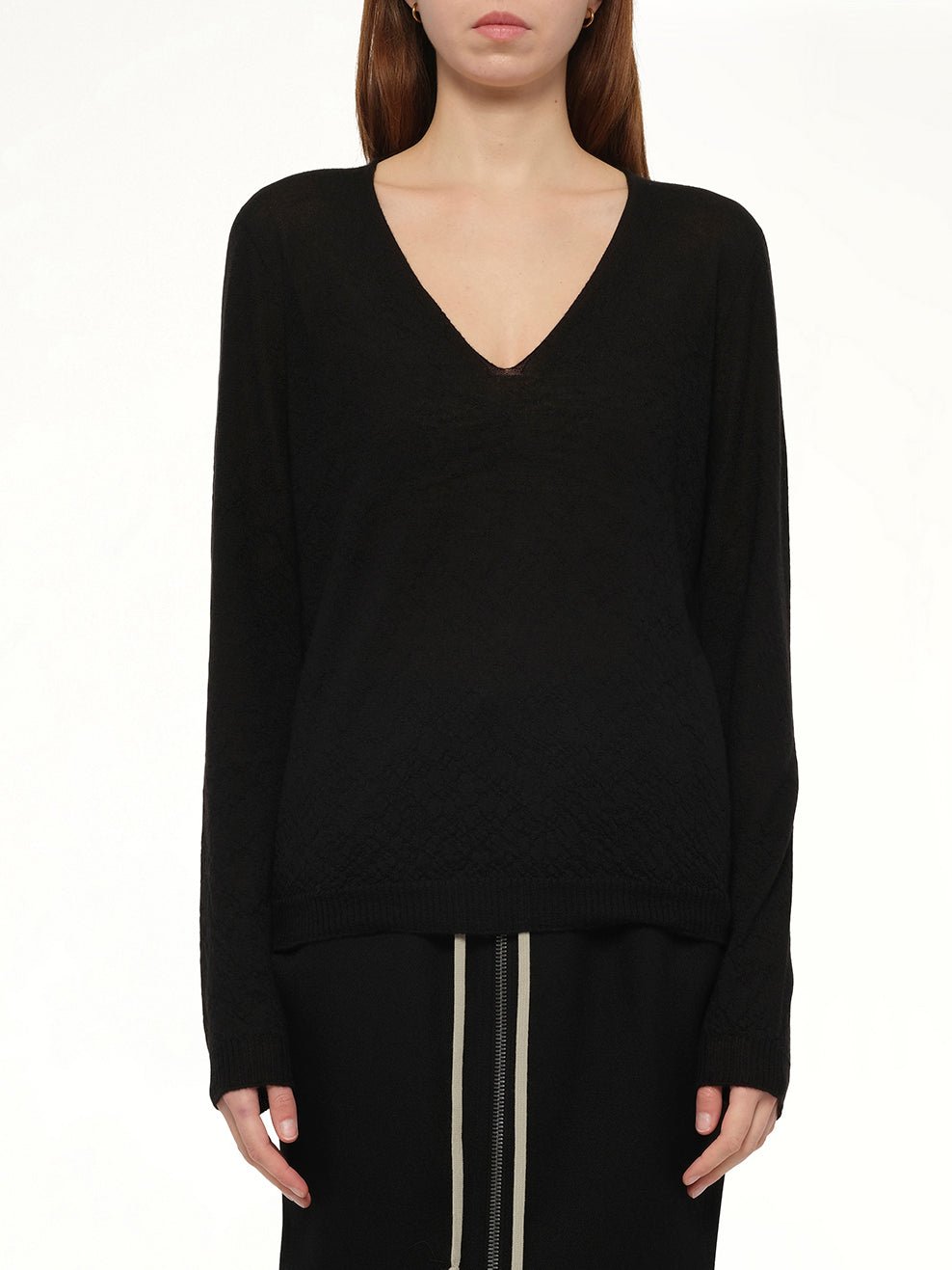 Rick Owens's Cashmere V-Neck Pull in Black is a luxurious and versatile addition to any wardrobe. Its minimalist design and premium craftsmanship make it a timeless piece for any occasion.
