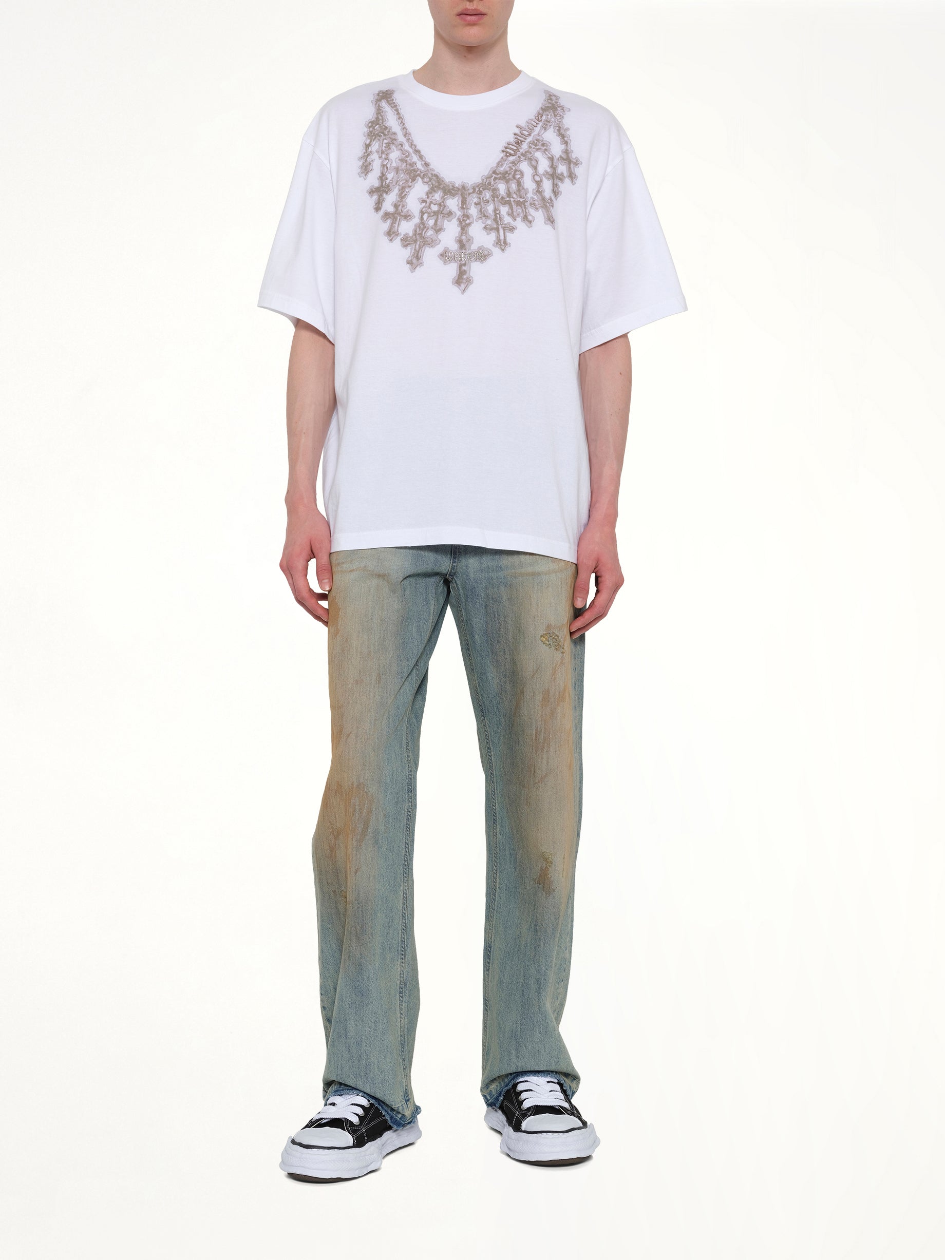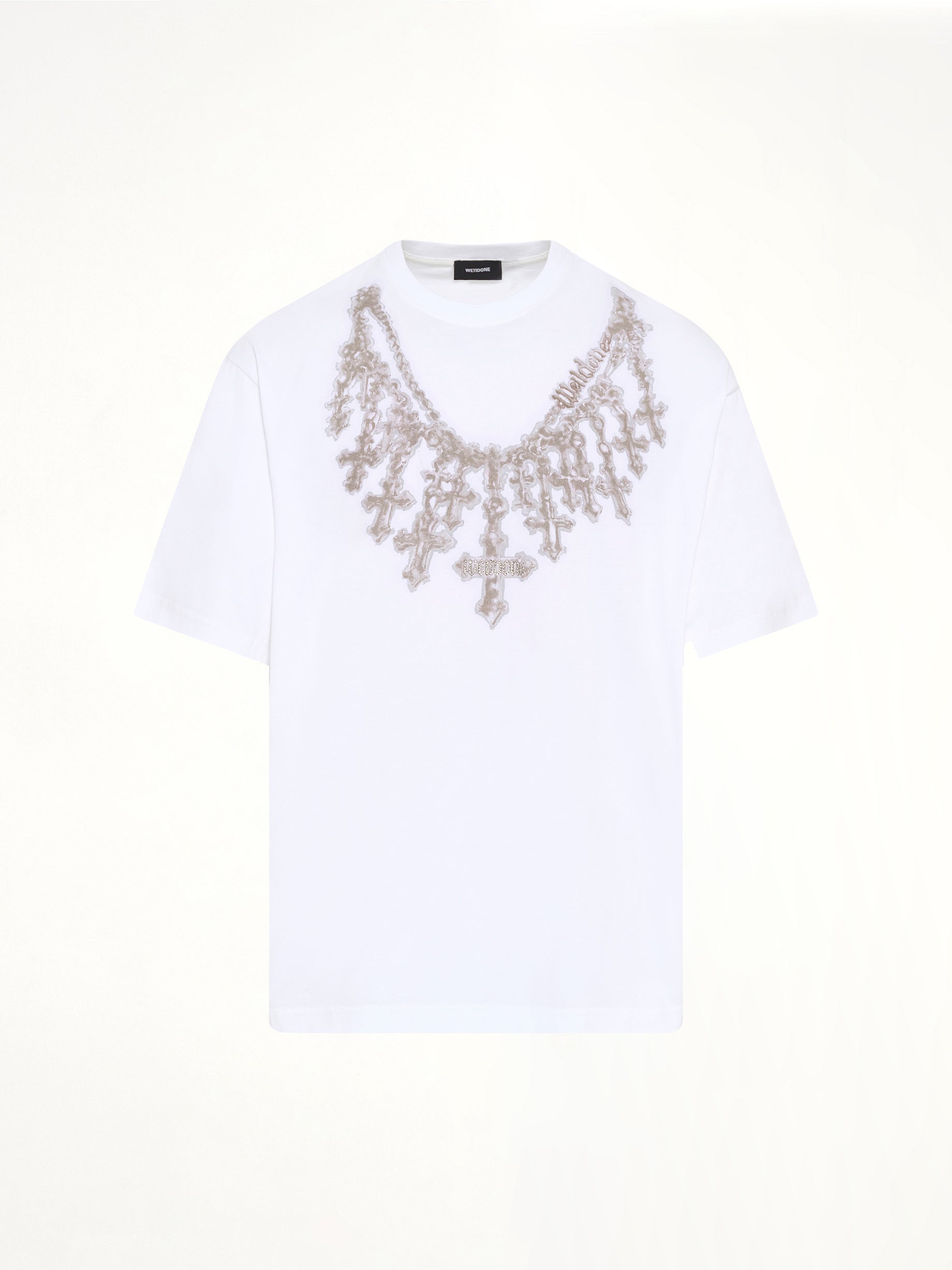 We11done's Cross Necklace T-Shirt in White is a stylish and contemporary piece that combines fashion with a subtle statement. This t-shirt features a unique cross necklace graphic that adds a touch of edge to any outfit.
