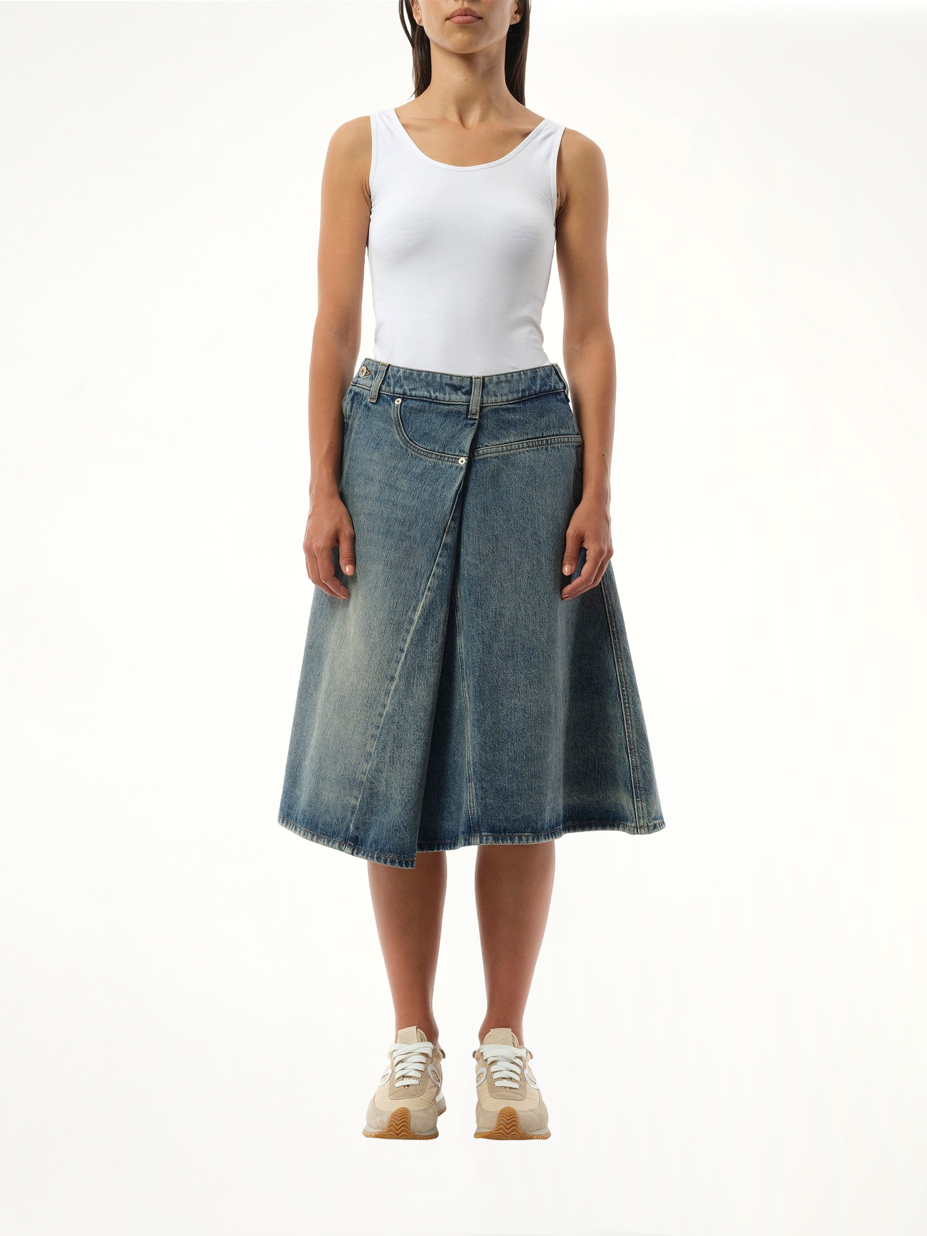 Expertly crafted from washed denim, our Deconstructed Skirt is both stylish and comfortable. Its unique deconstructed design adds a modern twist to the classic denim skirt, making it a versatile and trendy addition to any wardrobe.