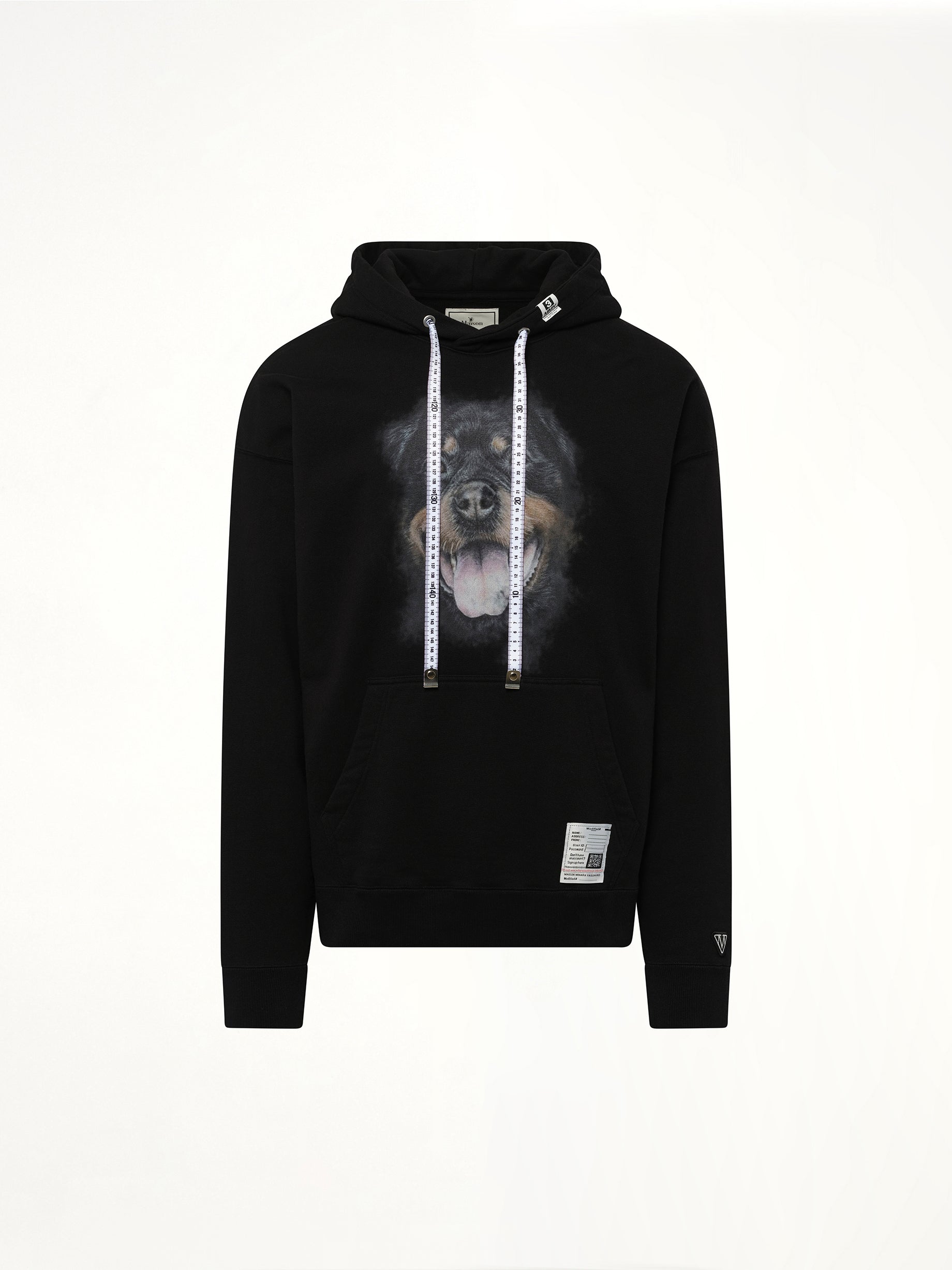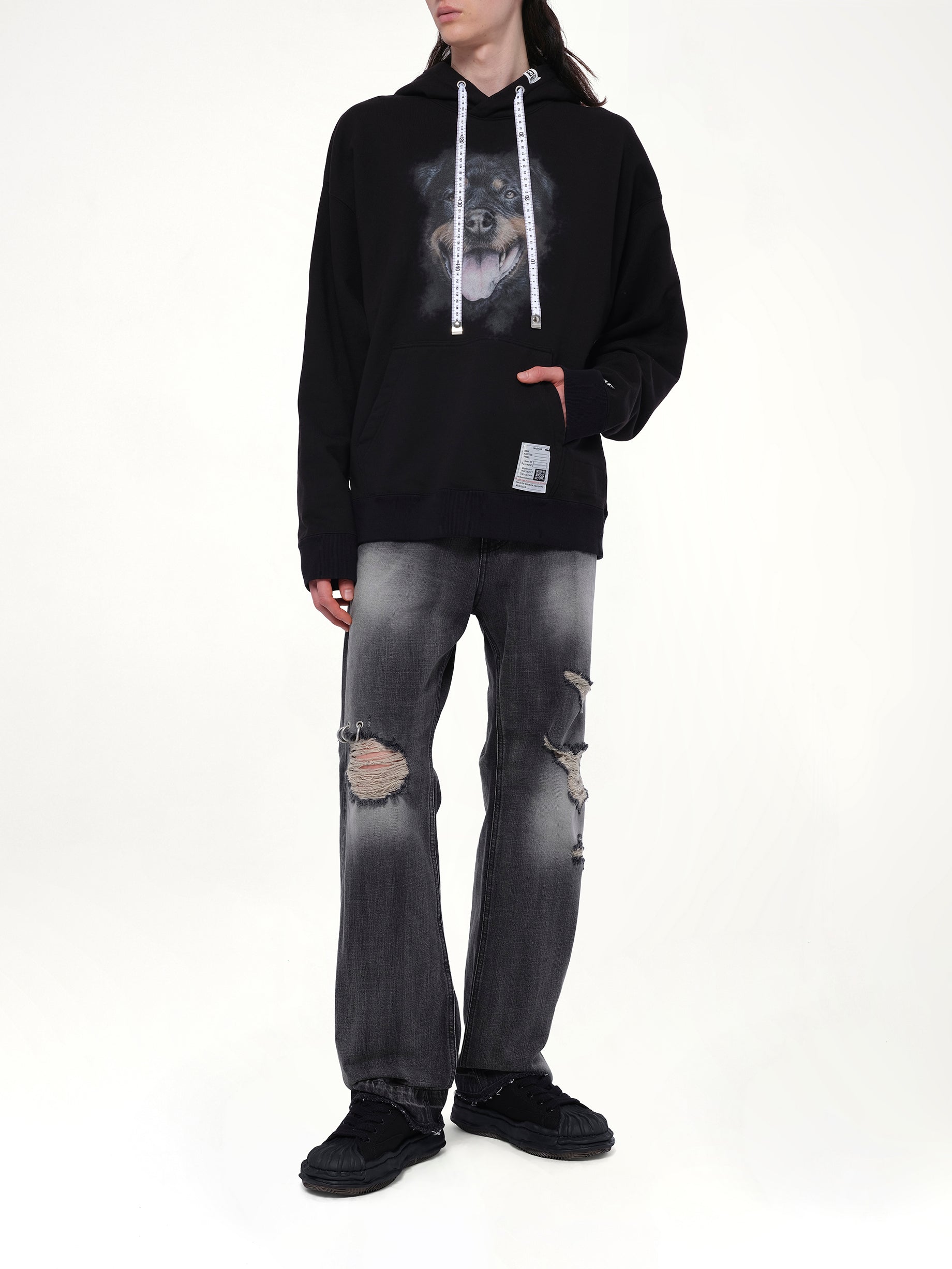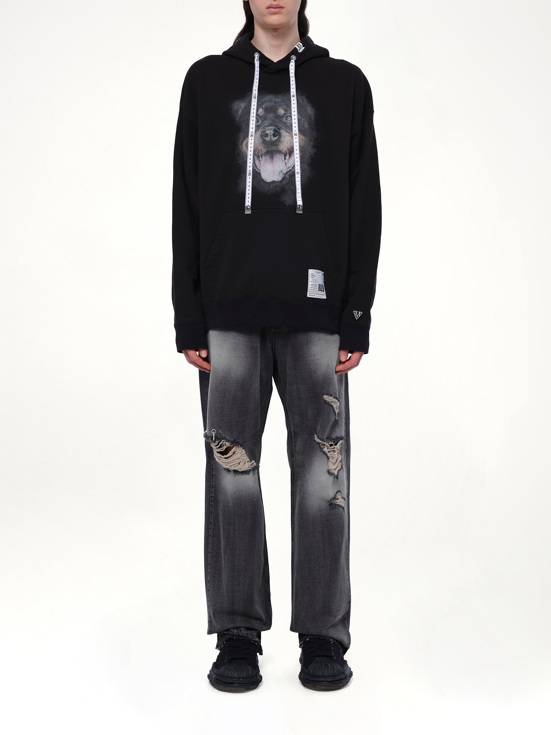 MAISON MIHARA YASUHIRO's Dog Printed Hoodie in Black is a stylish and unique piece that combines comfort with a playful design. Featuring a bold dog print, this hoodie is perfect for making a statement in casual settings.