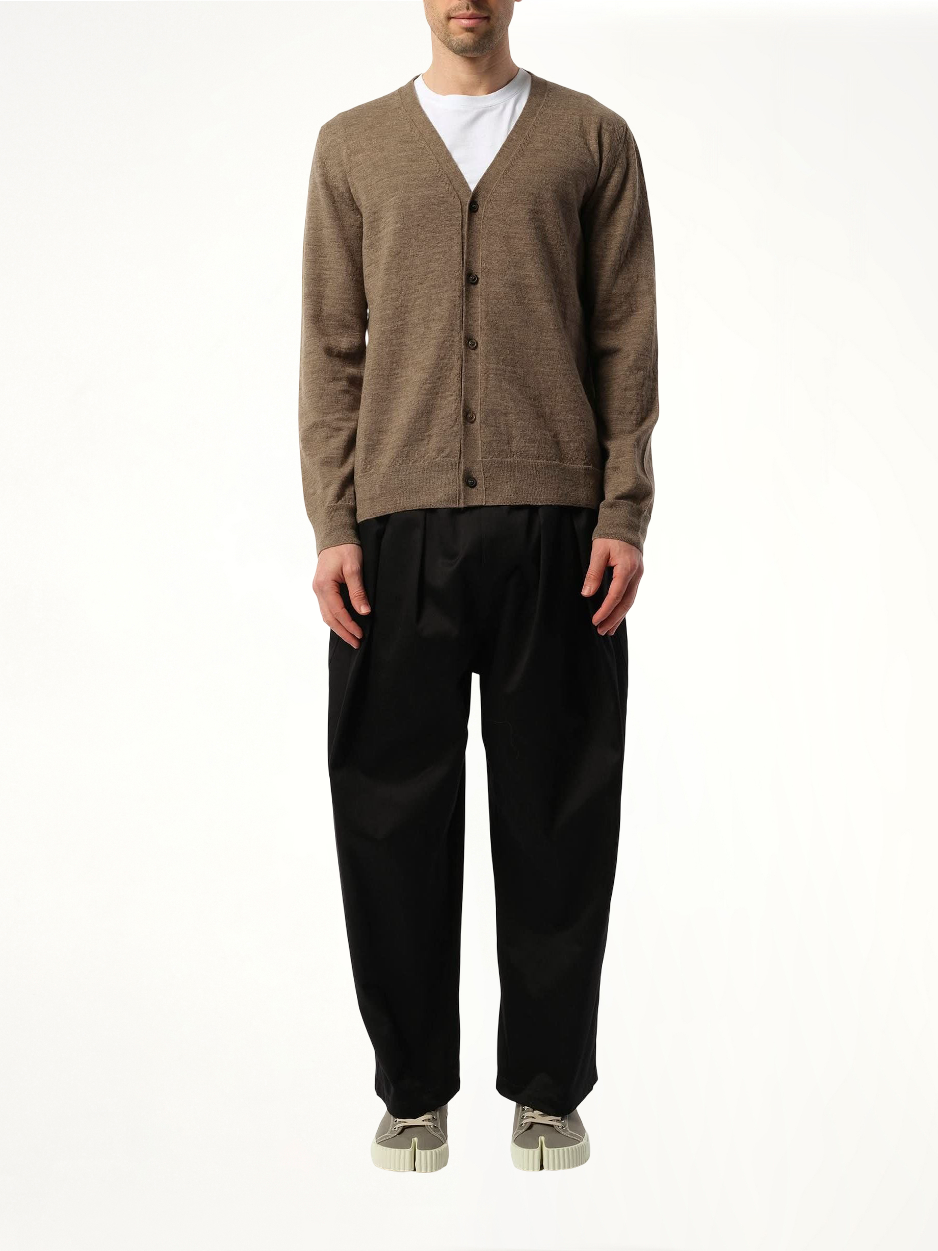 This walnut-colored knit cardigan features elbow patches for added durability and style. Made with high-quality materials, it is both comfortable and fashionable. Perfect for any occasion, this cardigan is a must-have for any wardrobe.