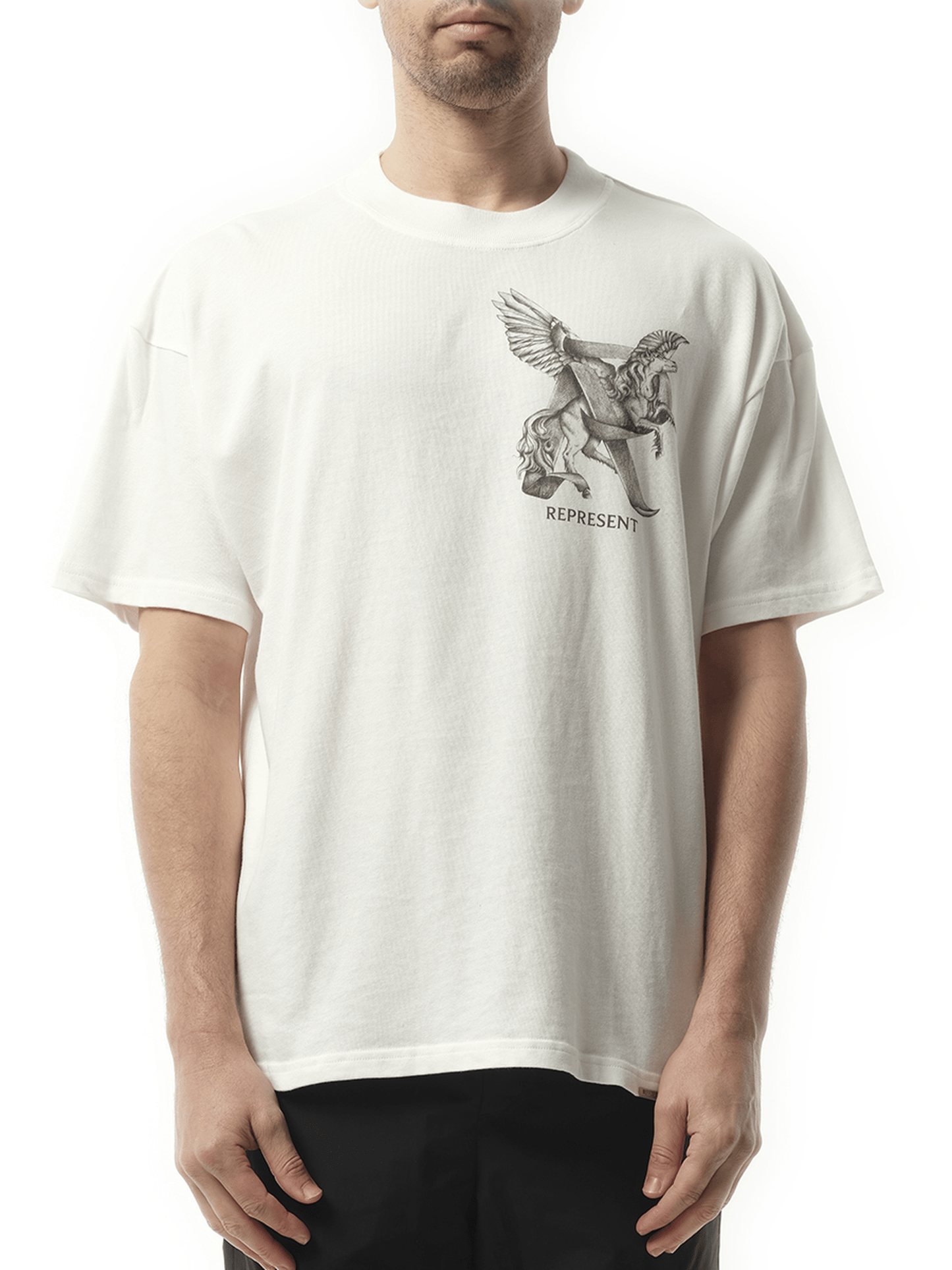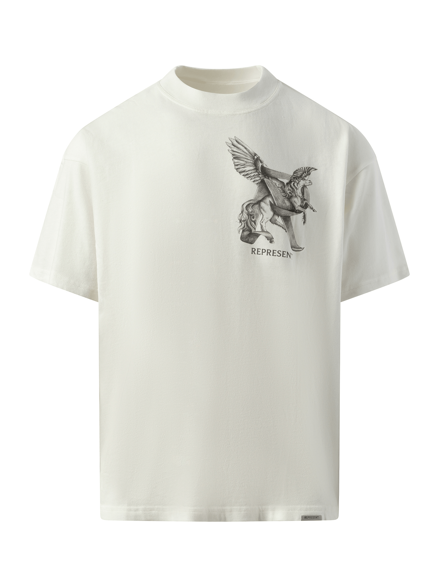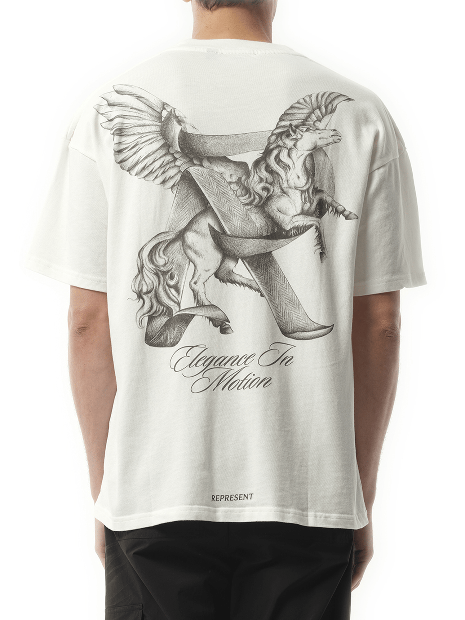 Represent's Elegance In Motion T-Shirt in Flat White combines streetwear aesthetics with premium comfort. Crafted from medium-weight jersey cotton, this slightly oversized t-shirt features dynamic 'Elegance in Motion' graphics on the front and back, showcasing a Pegasus R logo.
