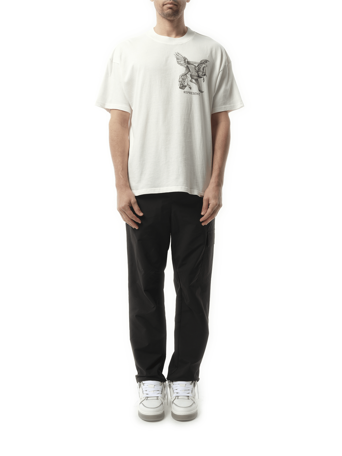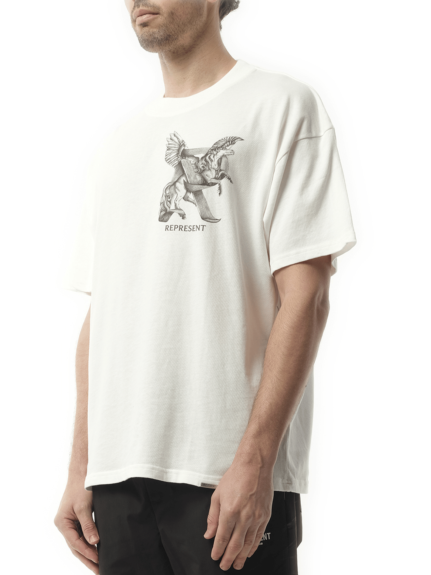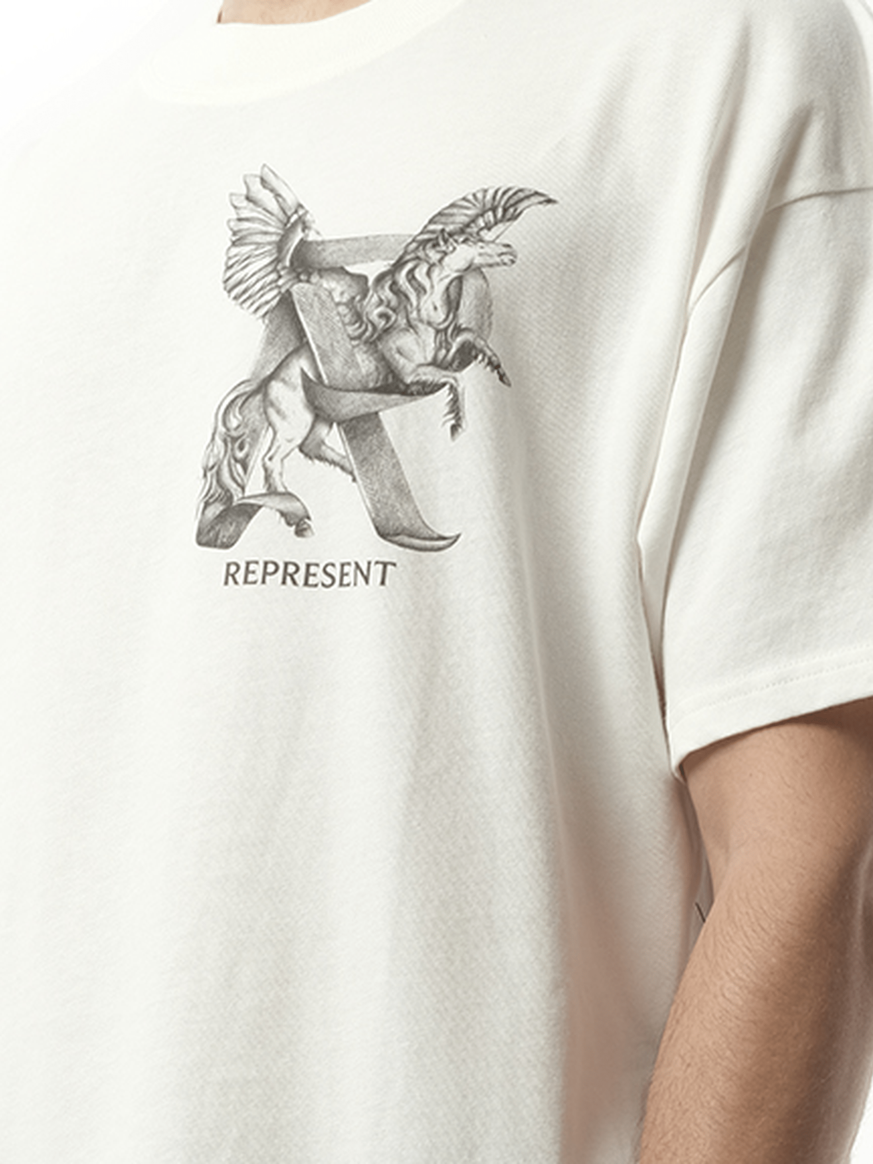 Represent's Elegance In Motion T-Shirt in Flat White combines streetwear aesthetics with premium comfort. Crafted from medium-weight jersey cotton, this slightly oversized t-shirt features dynamic 'Elegance in Motion' graphics on the front and back, showcasing a Pegasus R logo.