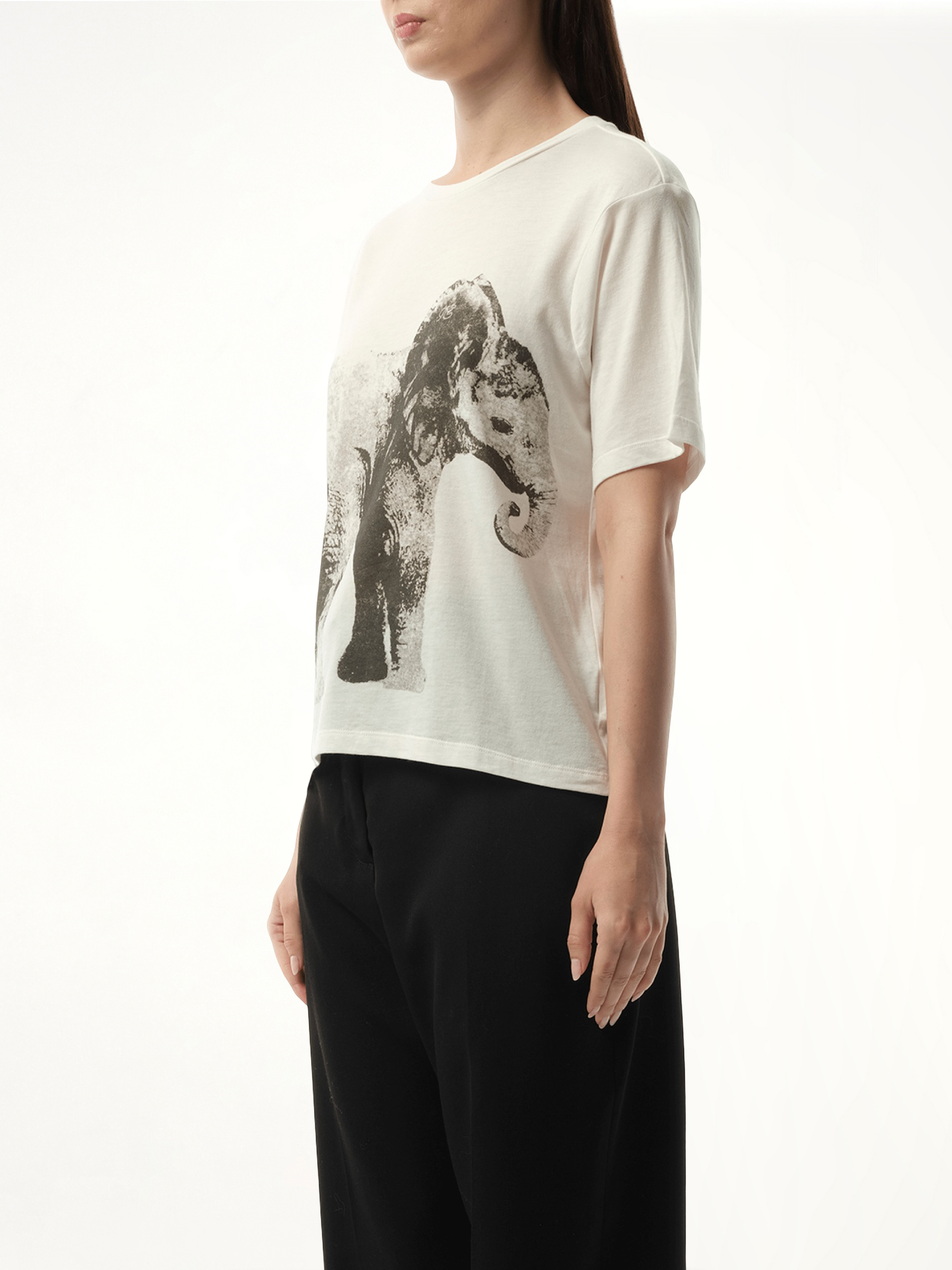 Designed with a clean, white background and a striking elephant print, this t-shirt offers a unique and stylish addition to any wardrobe. Made of high-quality material, it provides both comfort and endurance for everyday wear.
