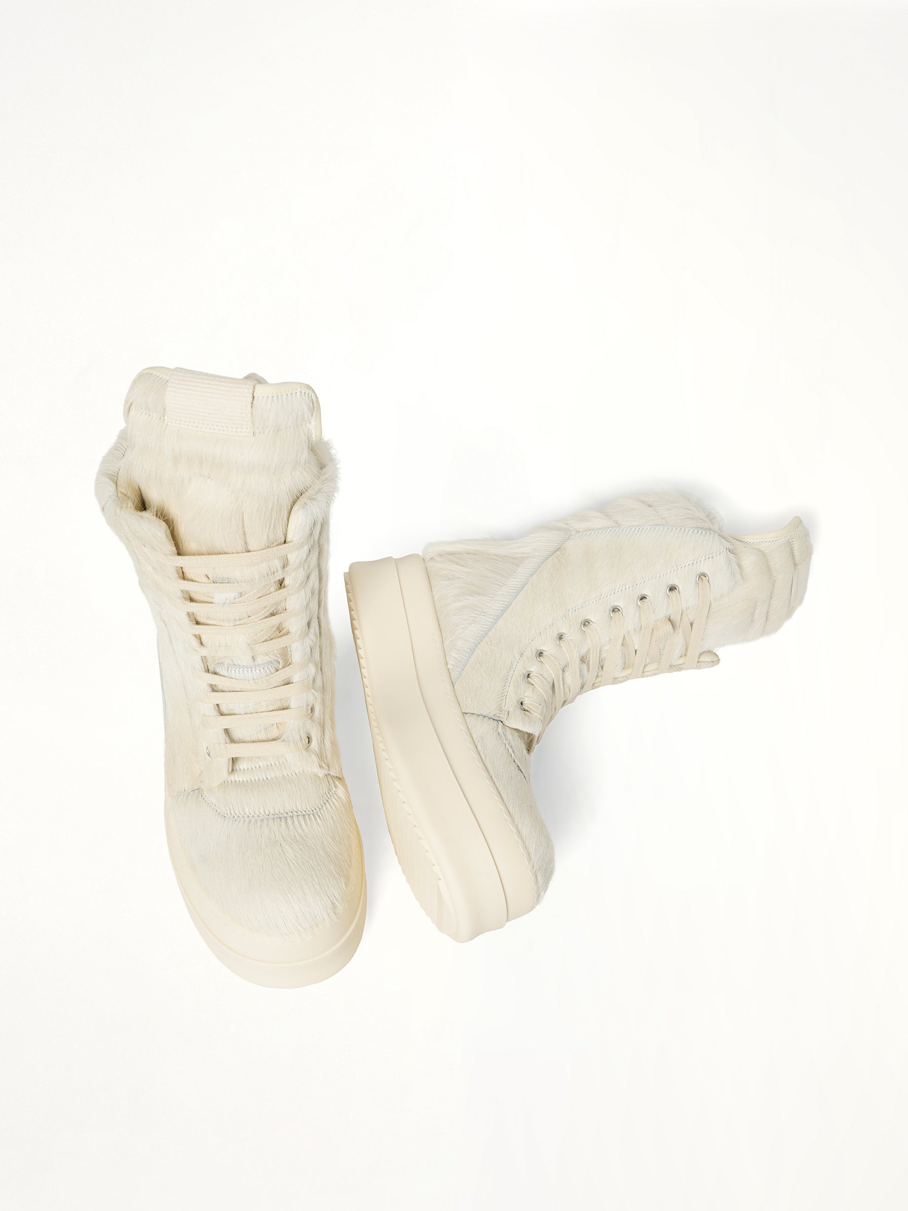 Rick Owens's Fur Megageobasket in Milk/Milk/Milk is a bold and avant-garde sneaker that combines luxury with streetwear aesthetics. This statement piece is designed for those who appreciate high fashion and unique design.