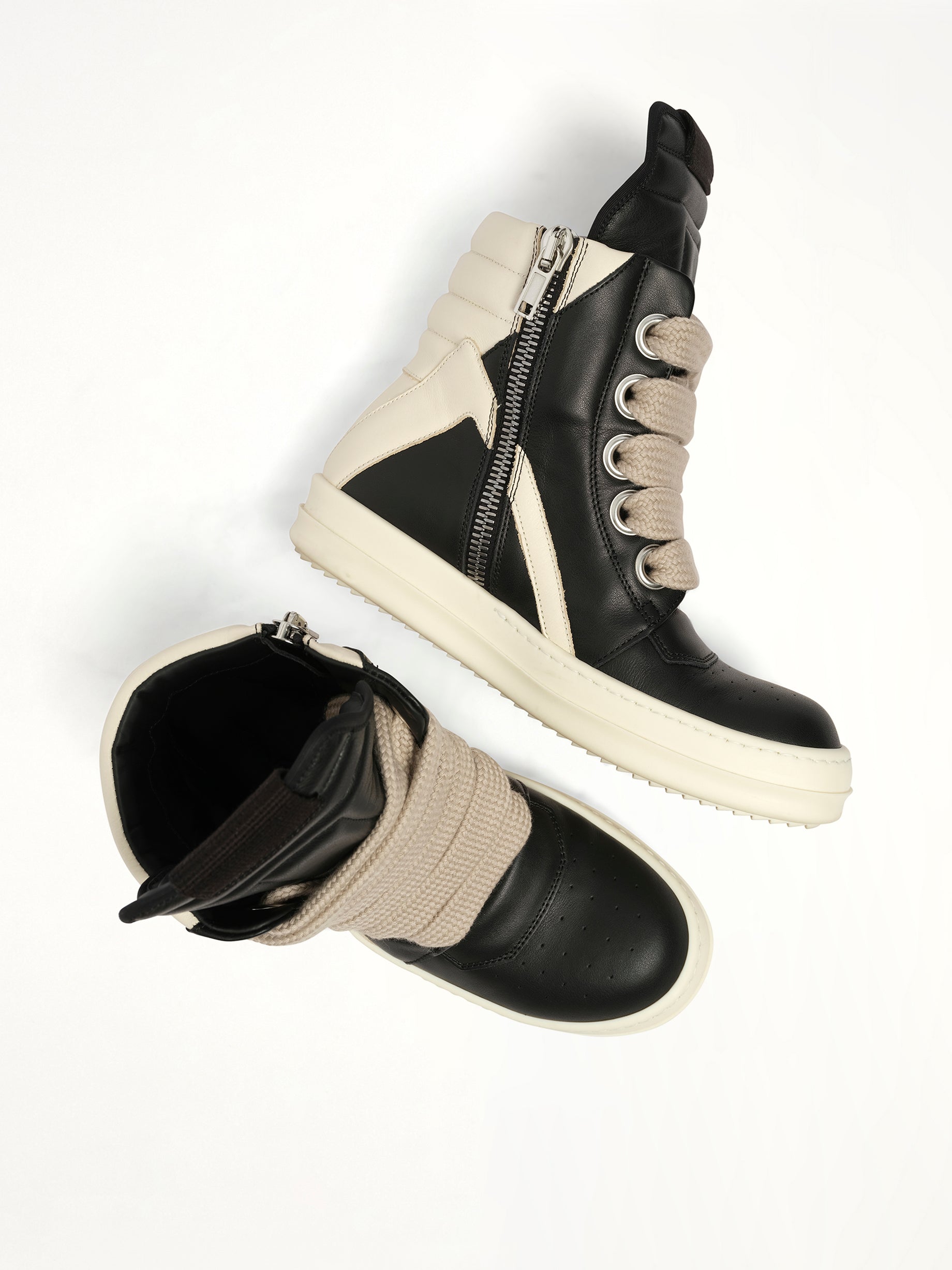 Rick Owens's Jumbolace Geobasket in Black/Milk/Milk is a striking high-top sneaker that combines avant-garde design with urban edge. Featuring a bold color contrast and oversized laces, this shoe is a statement piece for any fashion-forward wardrobe.
