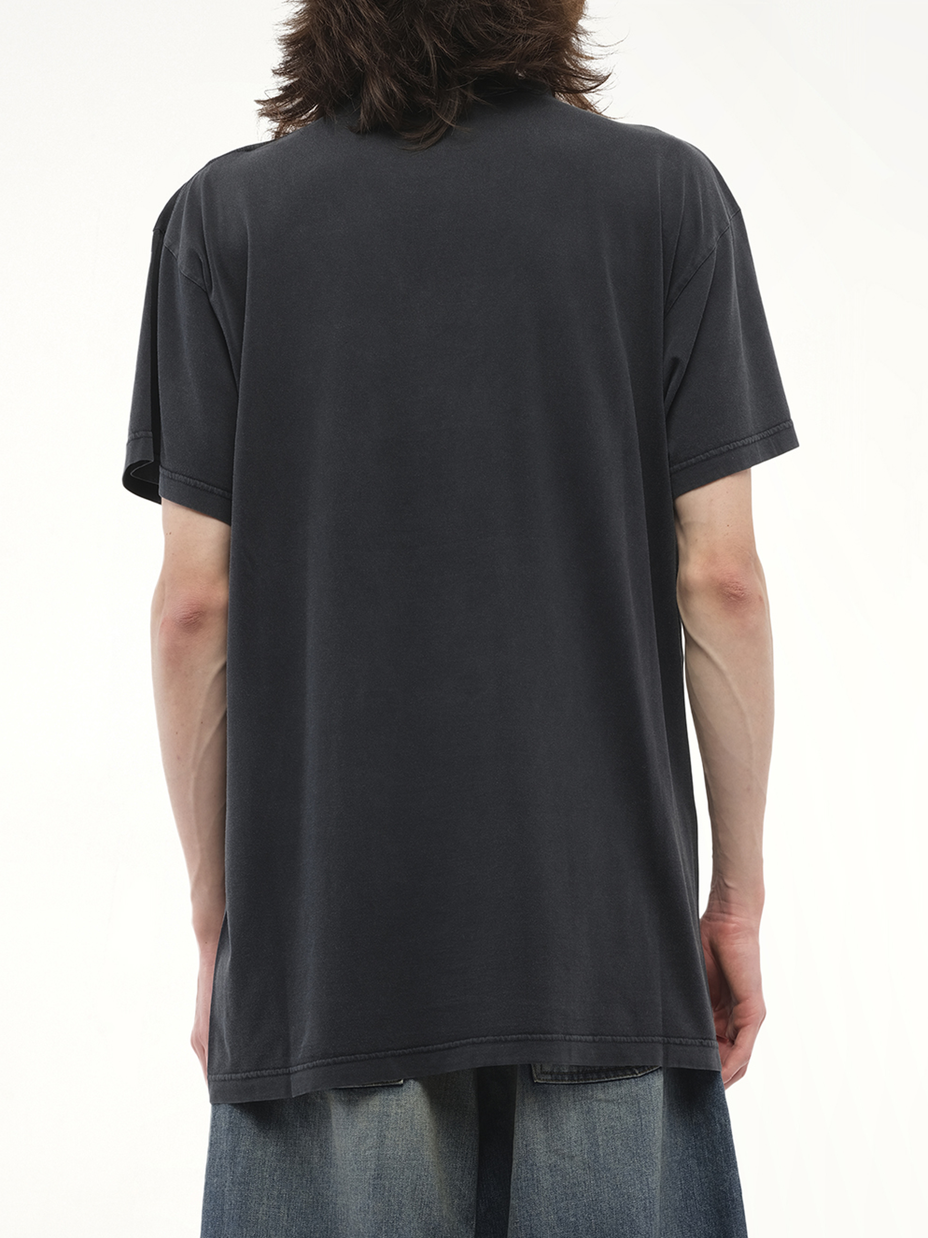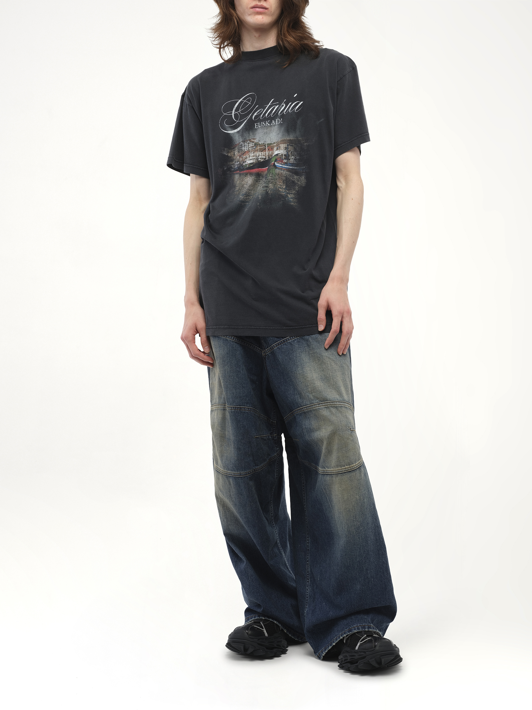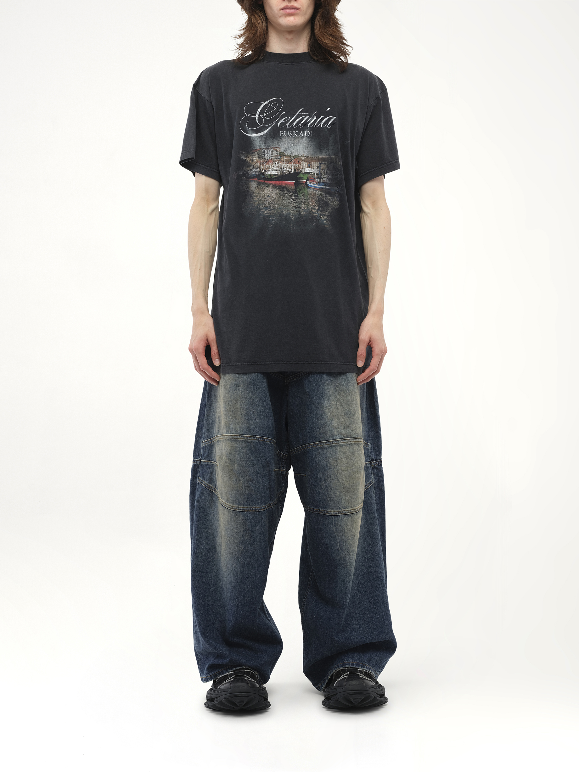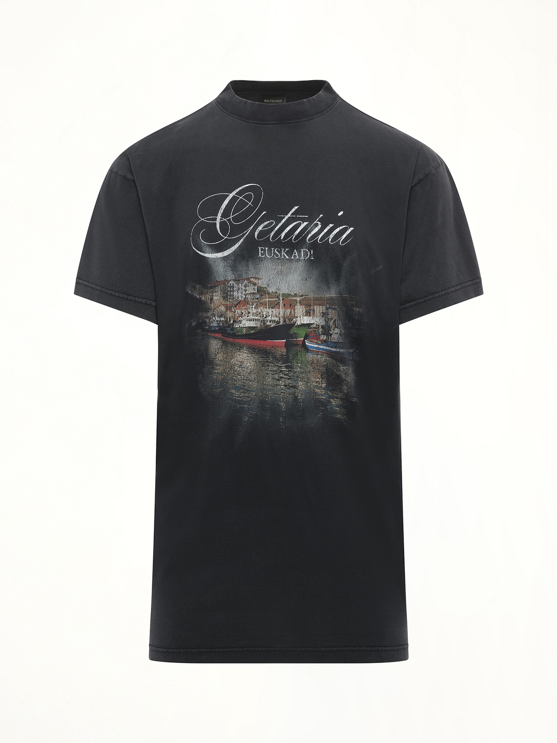 Balenciaga's Getaria Oversized T-Shirt in Faded Washed Black, crafted from washed black tubular jersey, this oversized tee features a bold cityscape graphic print of Getaria, Spain. The design upgrades a classic vintage jersey with a creative touch, ideal for off-duty days.