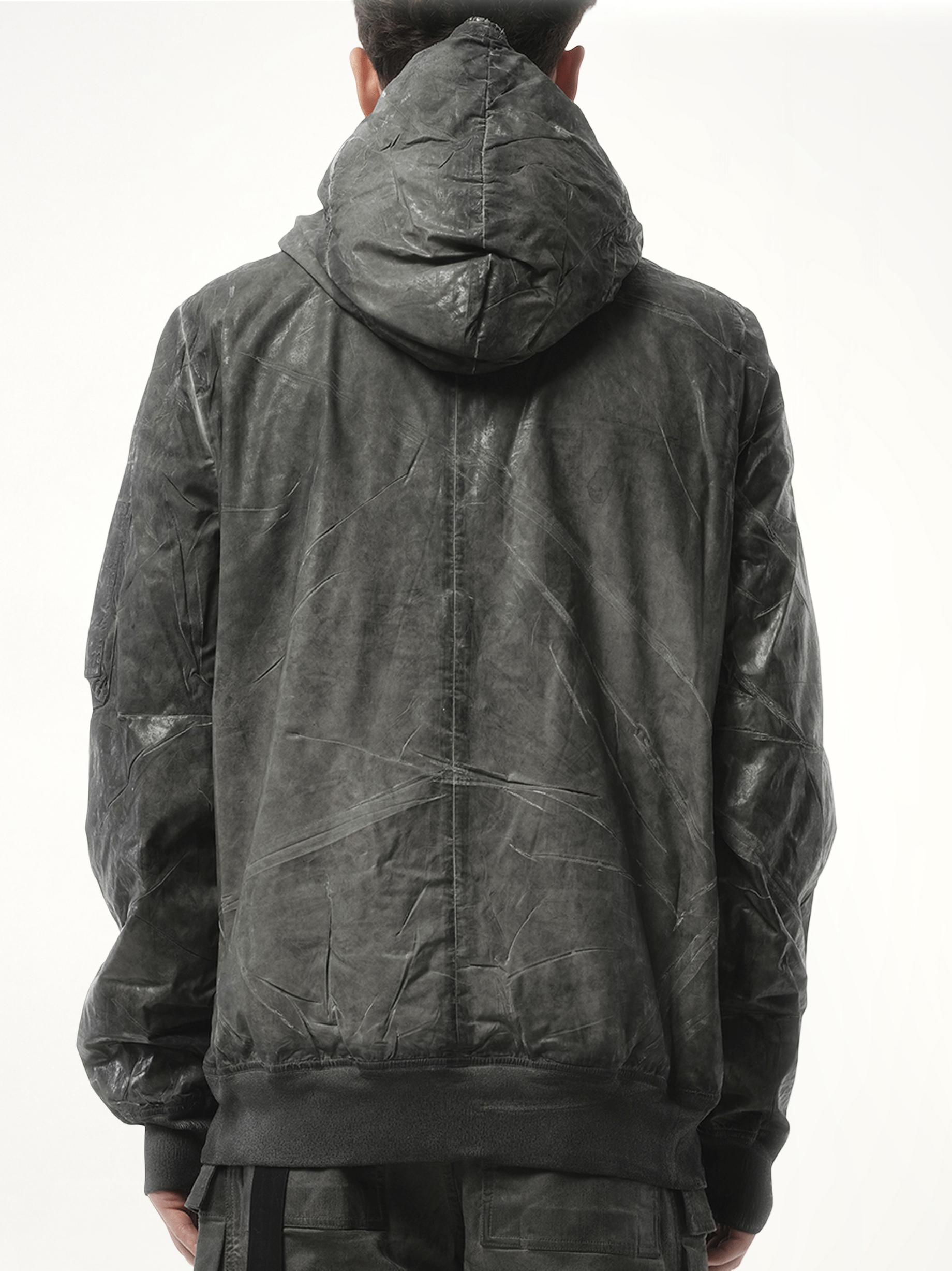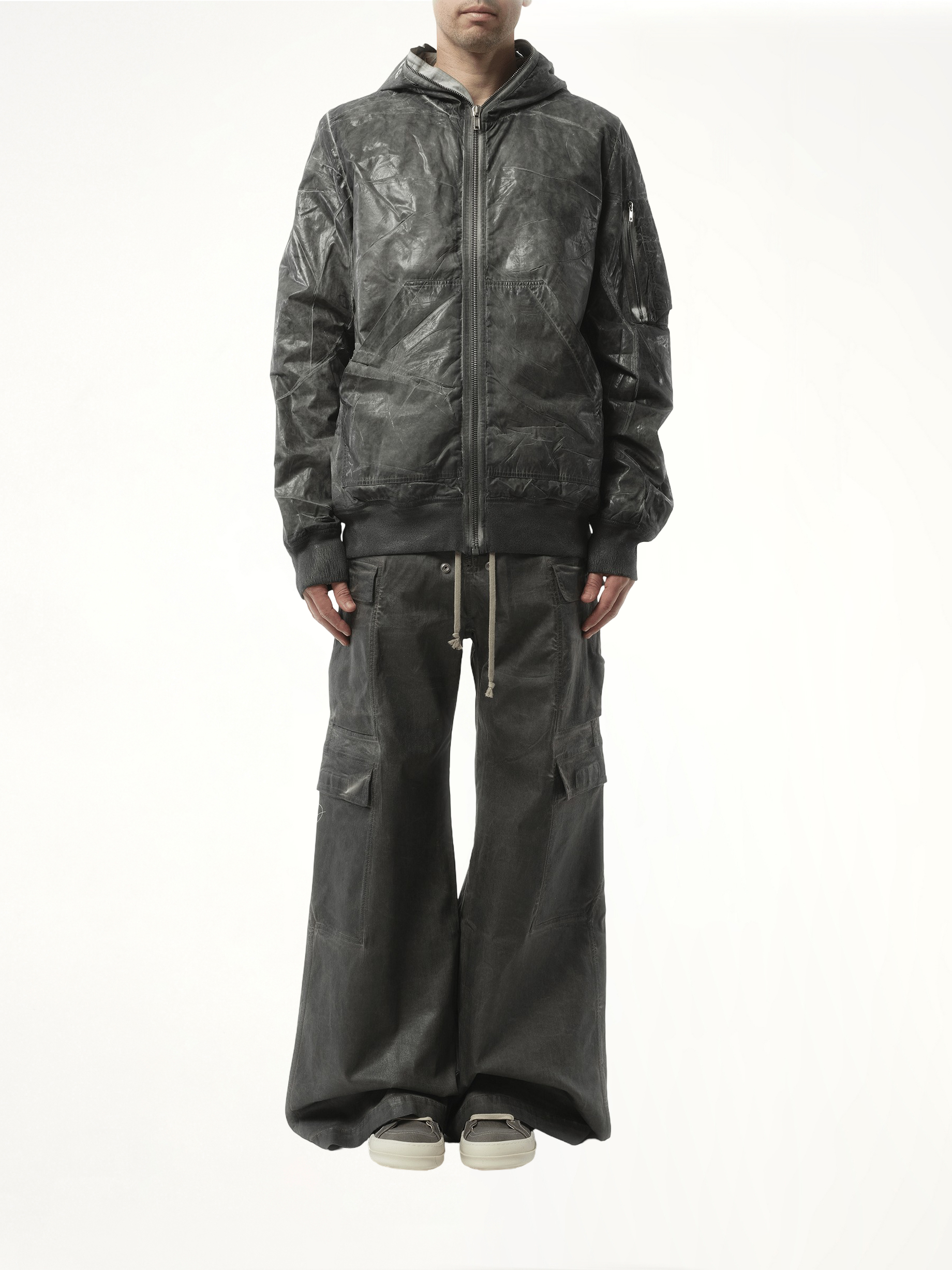 The Rick Owens DRKSHDW Gimp Flight Bomber Jacket in Dark Dust combines functional design with a touch of avant-garde style. This jacket features a regular fit, long sleeves, and a front zip fastening with a slouchy hood. The jacket also includes practical storage with two side patch pockets and a zip pocket on the sleeve.
