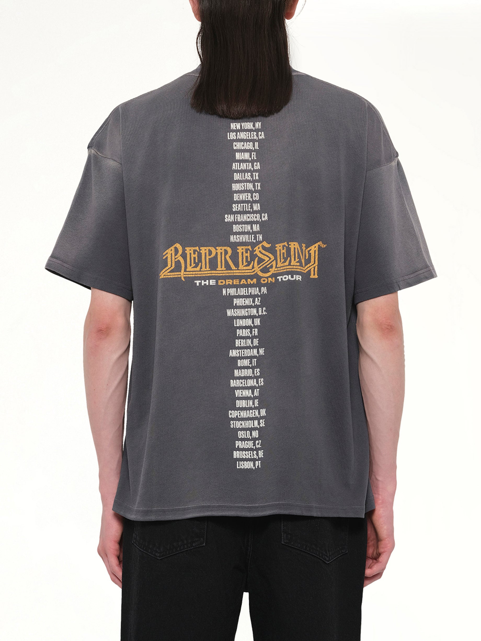 Represent's Golden Tour T-Shirt in Sun Fade Grey is a stylish and versatile piece that adds a touch of vintage flair to any wardrobe. Its unique sun-faded grey color gives it a worn-in look, perfect for casual outings or relaxed gatherings.