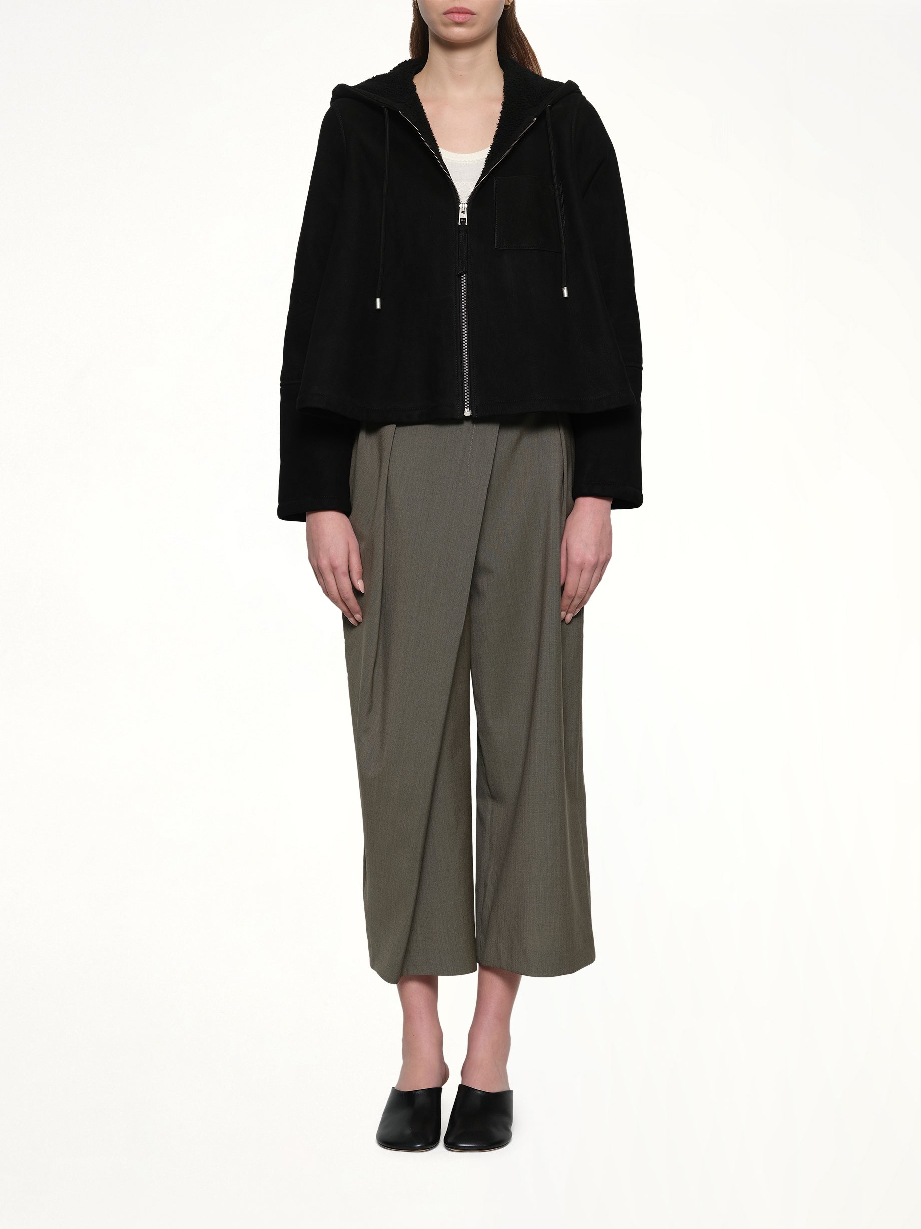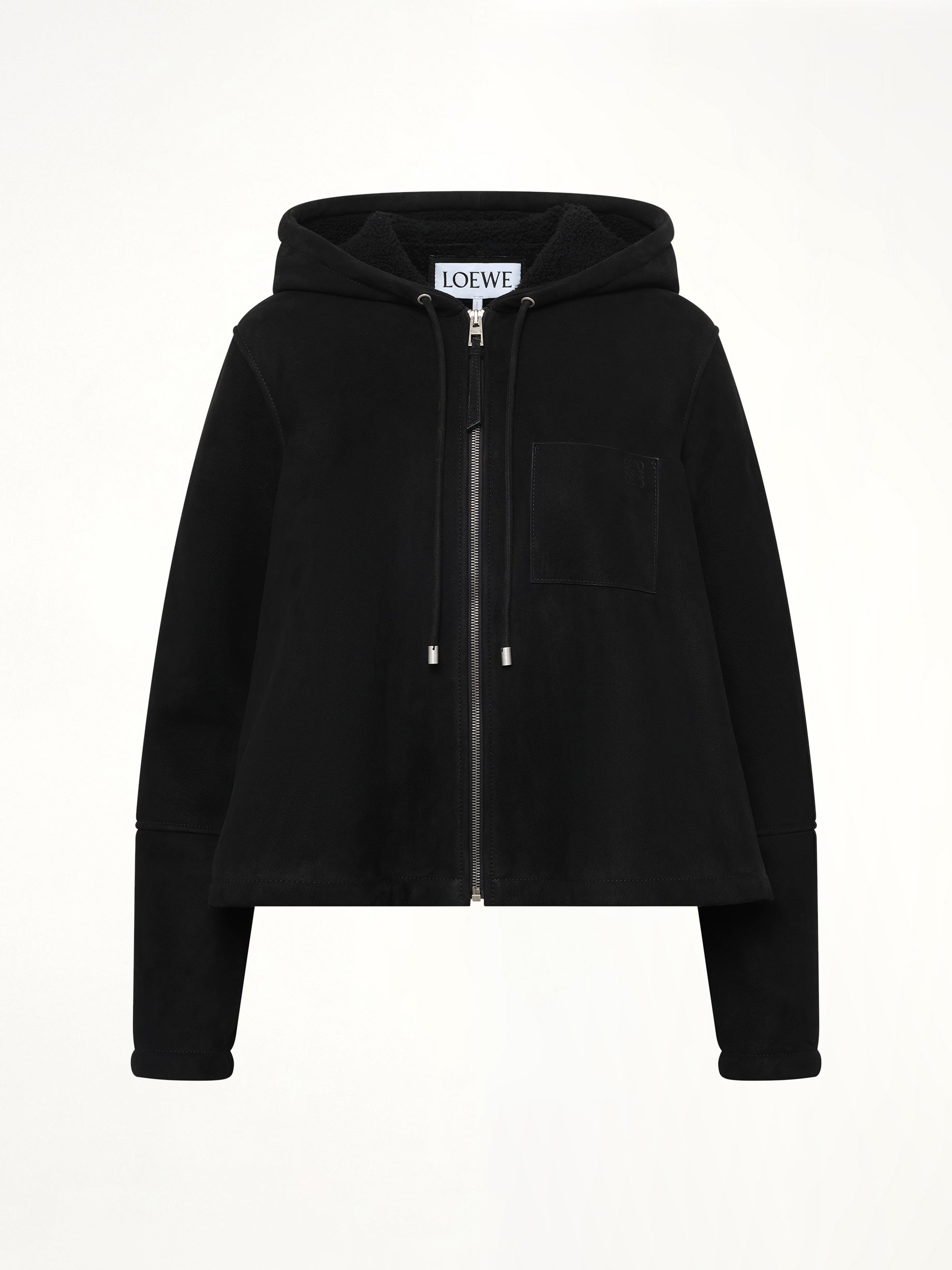 Loewe's Hooded Shearling Jacket in Black is a luxurious outerwear piece that combines style and warmth. Perfect for cold weather, this jacket offers a sophisticated look with its sleek design.