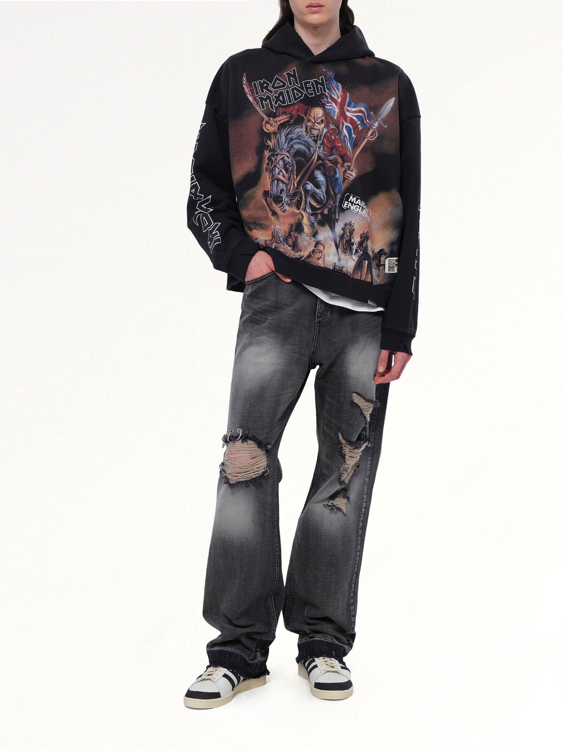 REPRESENT's Iron Maiden Steed Hoodie in Stained Black is a striking piece that combines iconic band imagery with modern streetwear style. This hoodie offers a bold look with its unique design and comfortable fit.