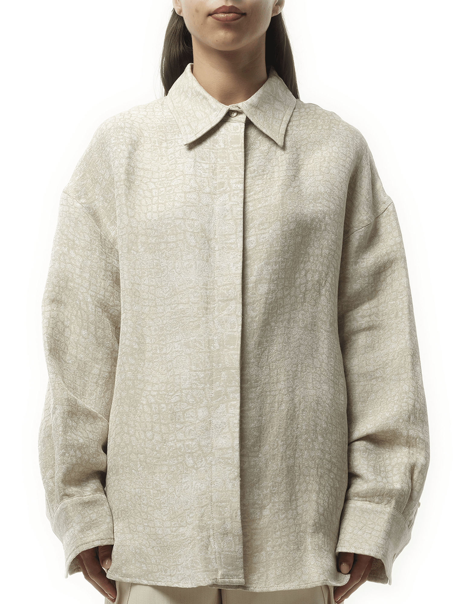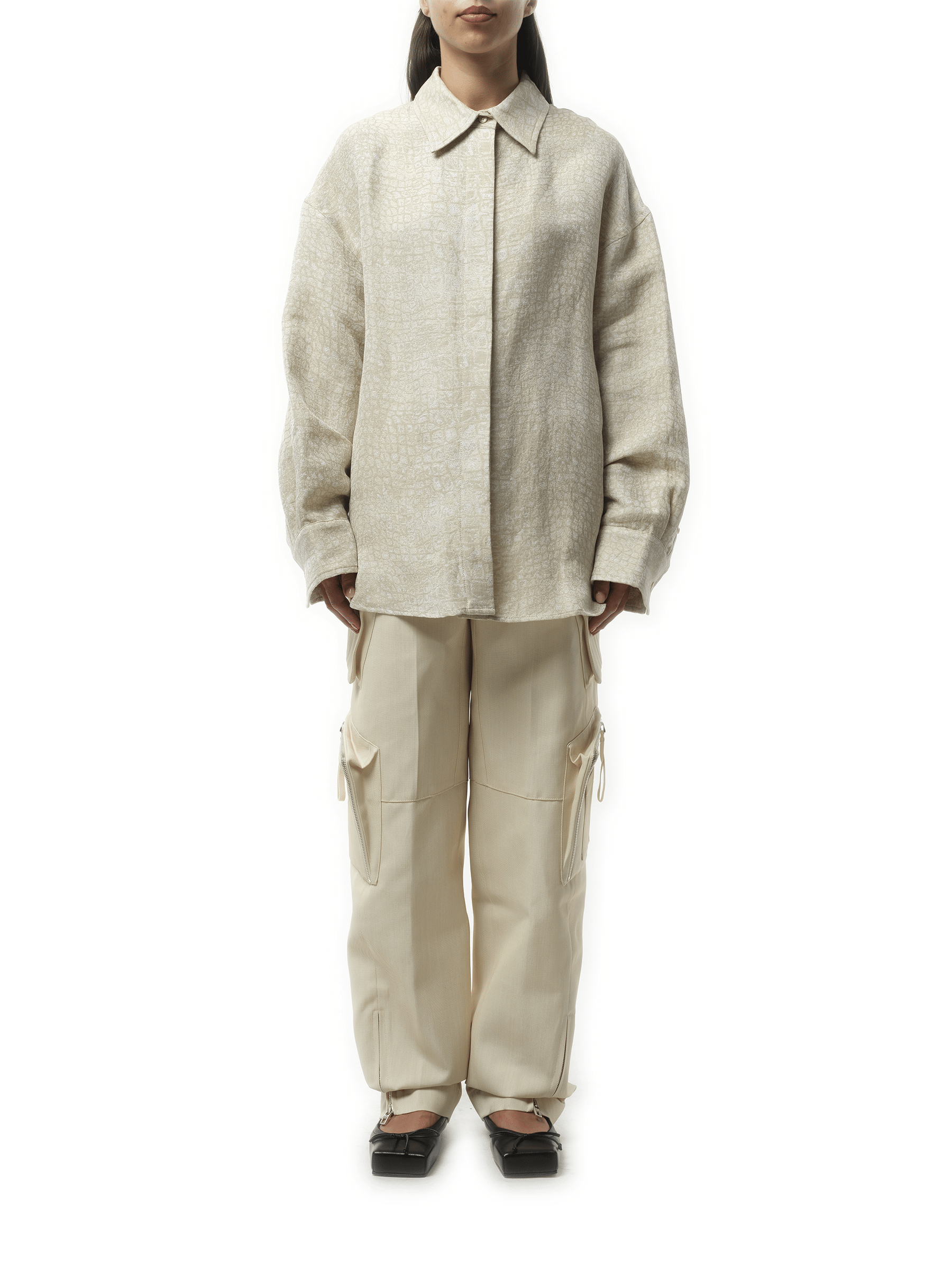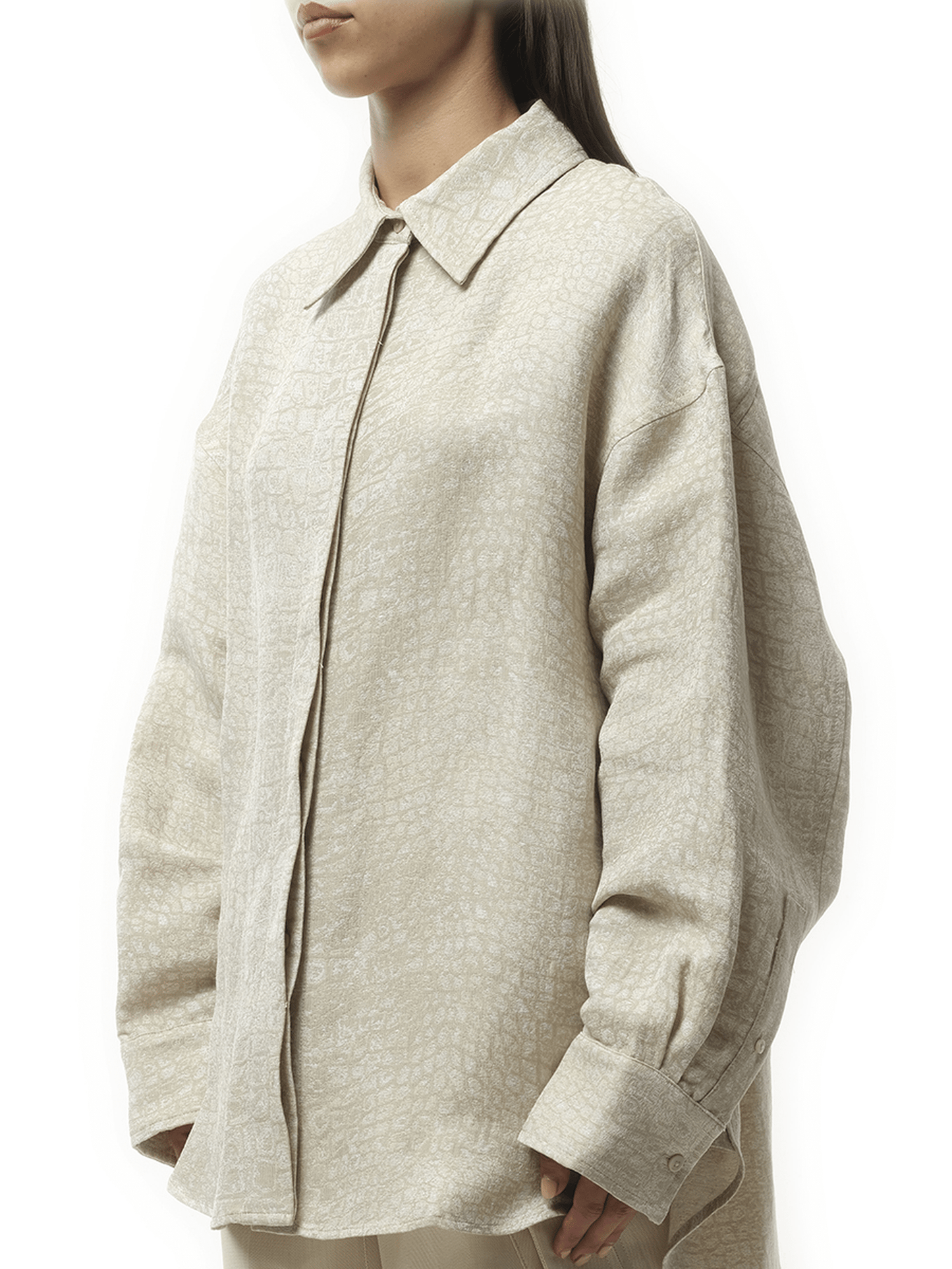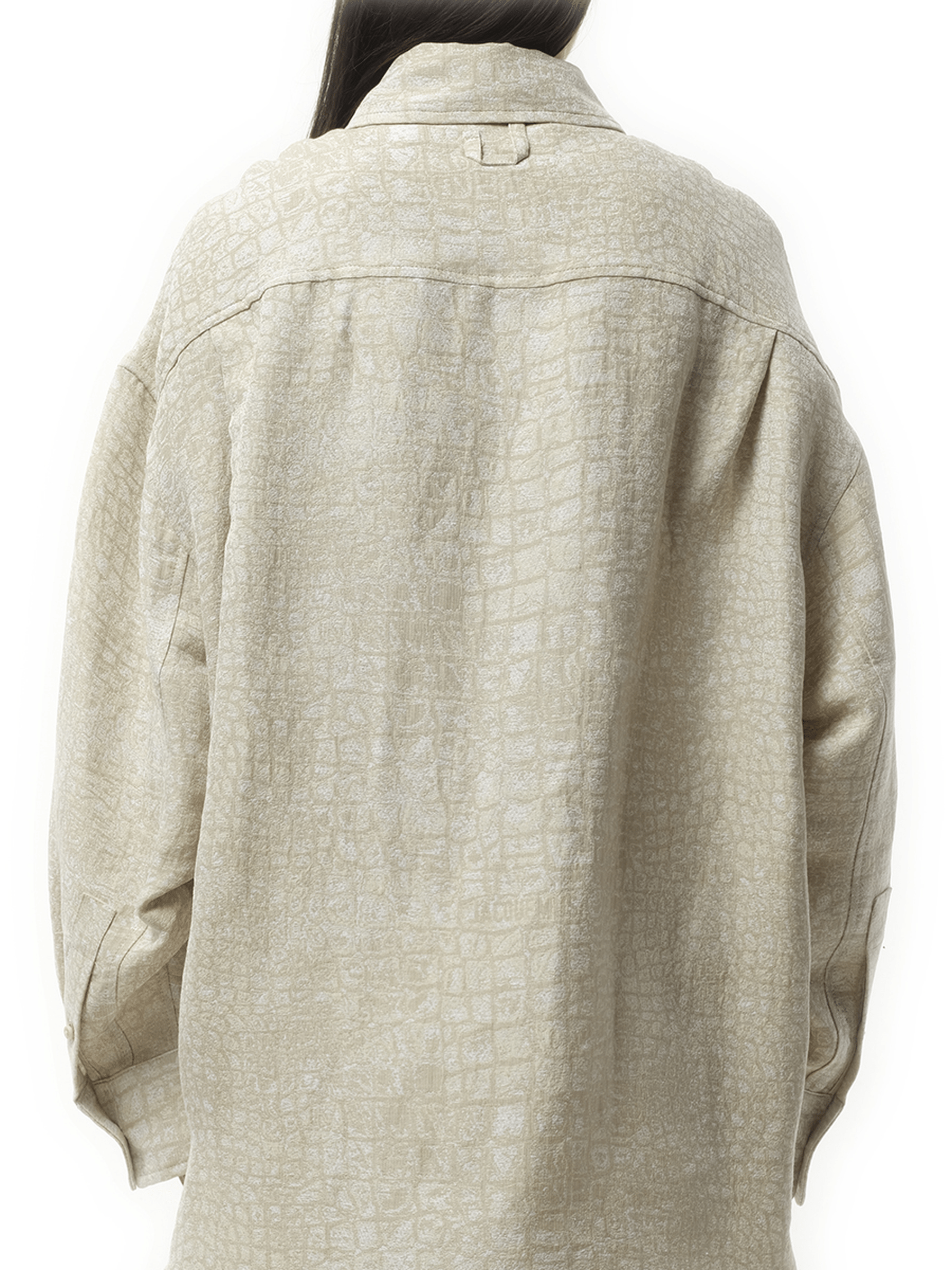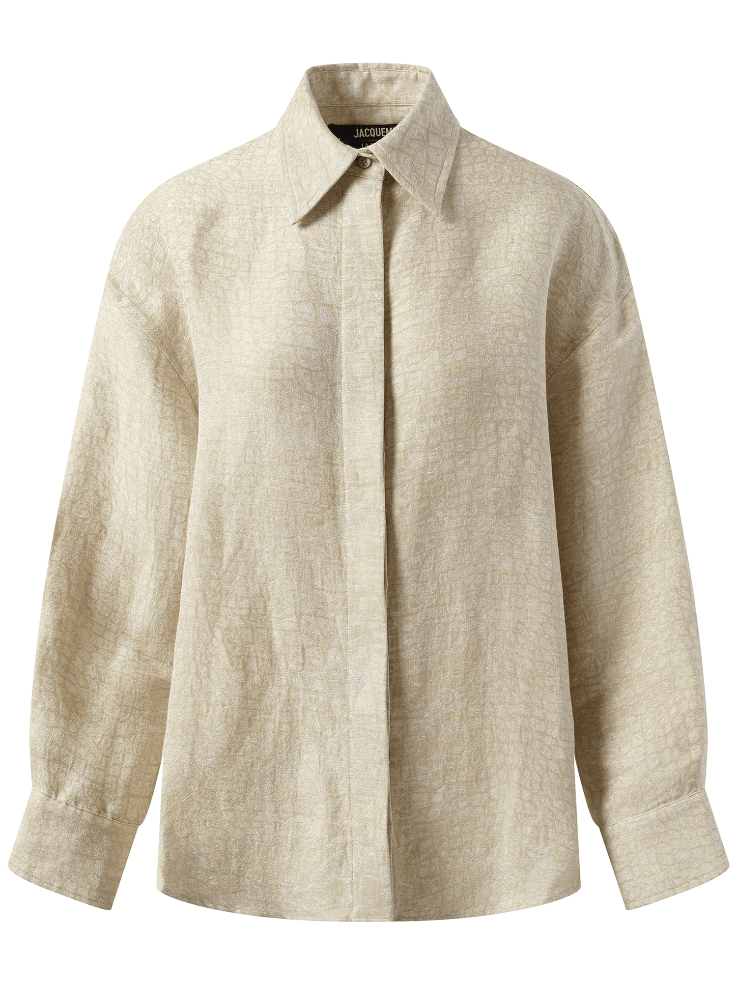 Jacquemus's La Chemise Pasadena in Croco Beige is an oversized shirt crafted from a luxurious linen-blend jacquard with a subtle crocodile motif. The relaxed silhouette and refined construction give this piece an effortless yet elevated appeal.