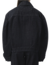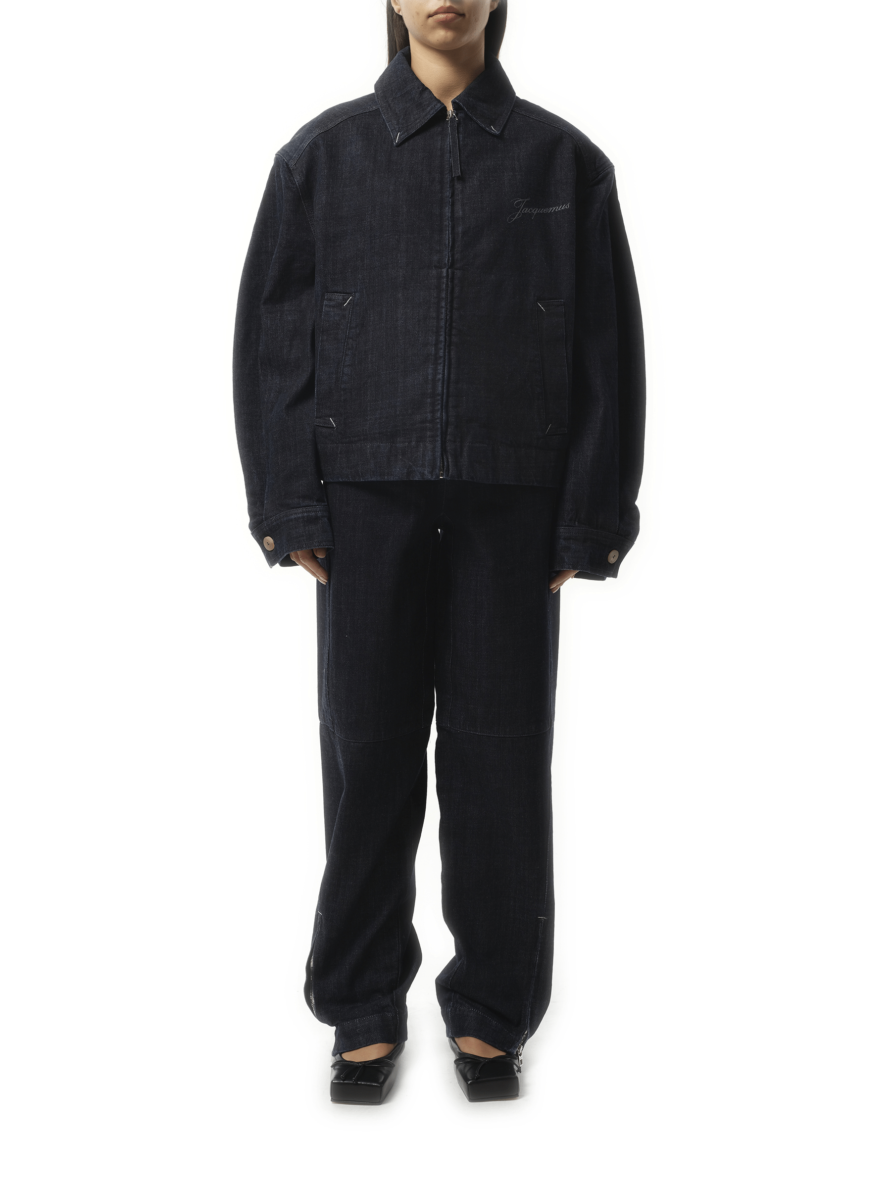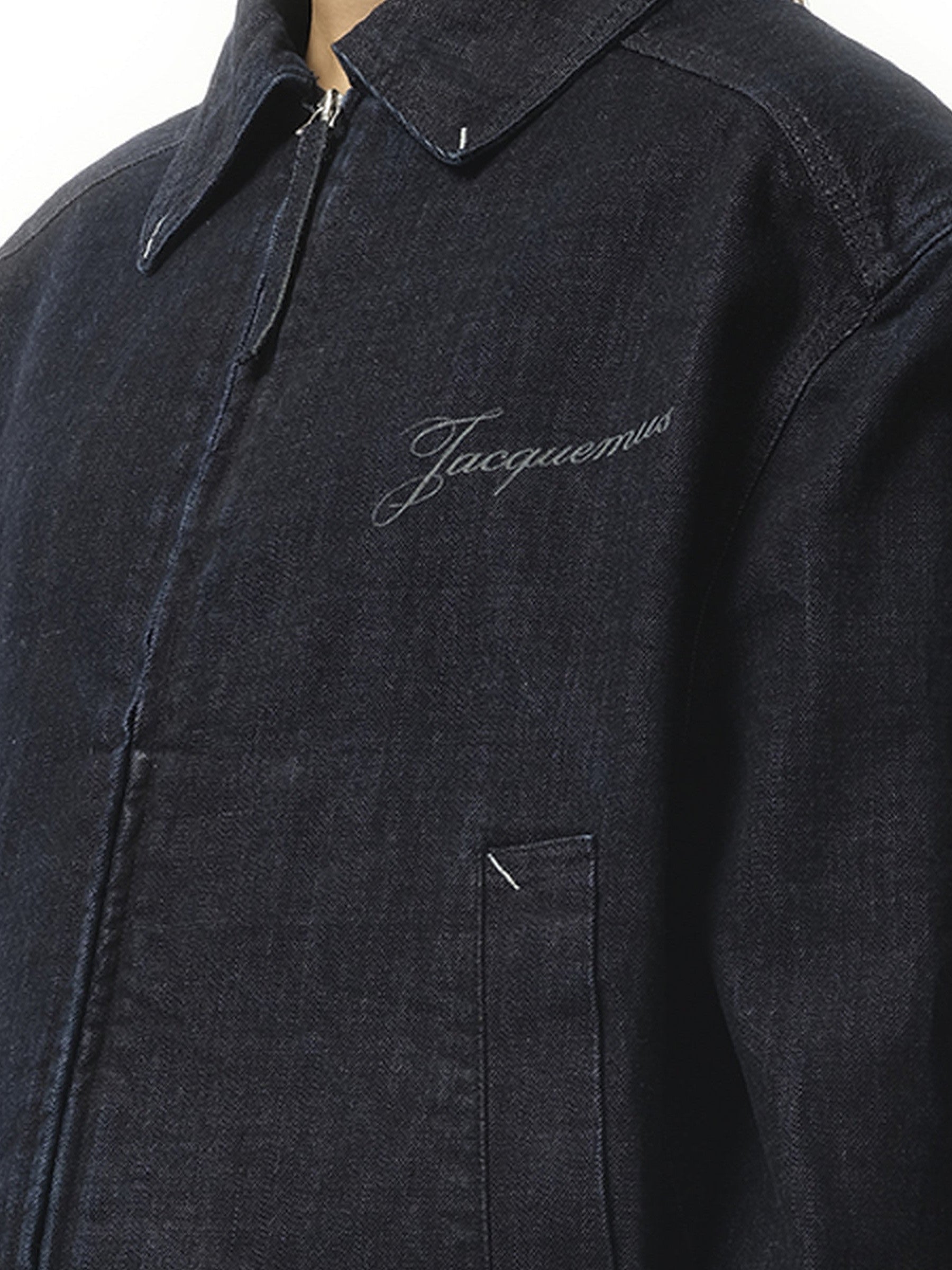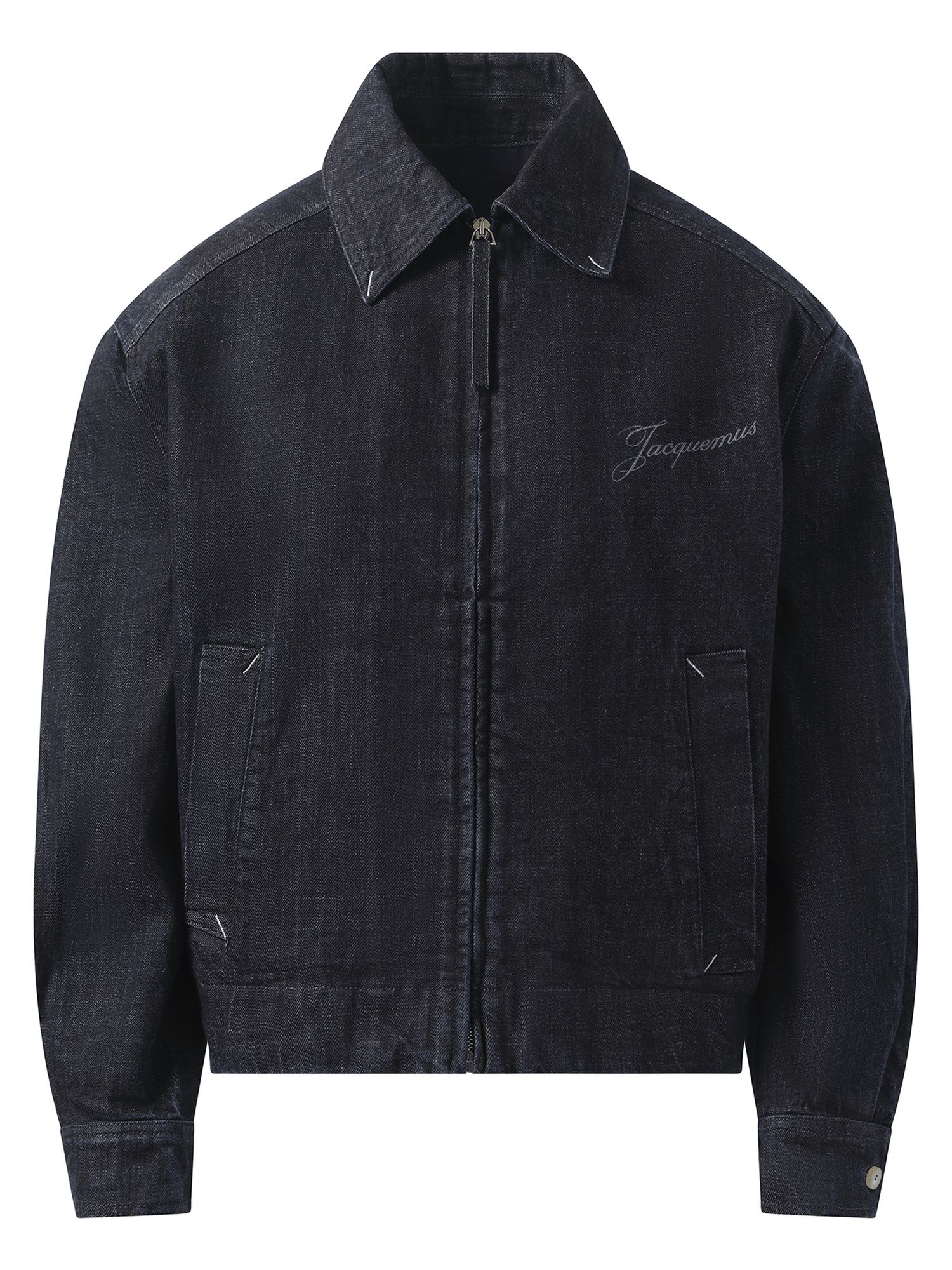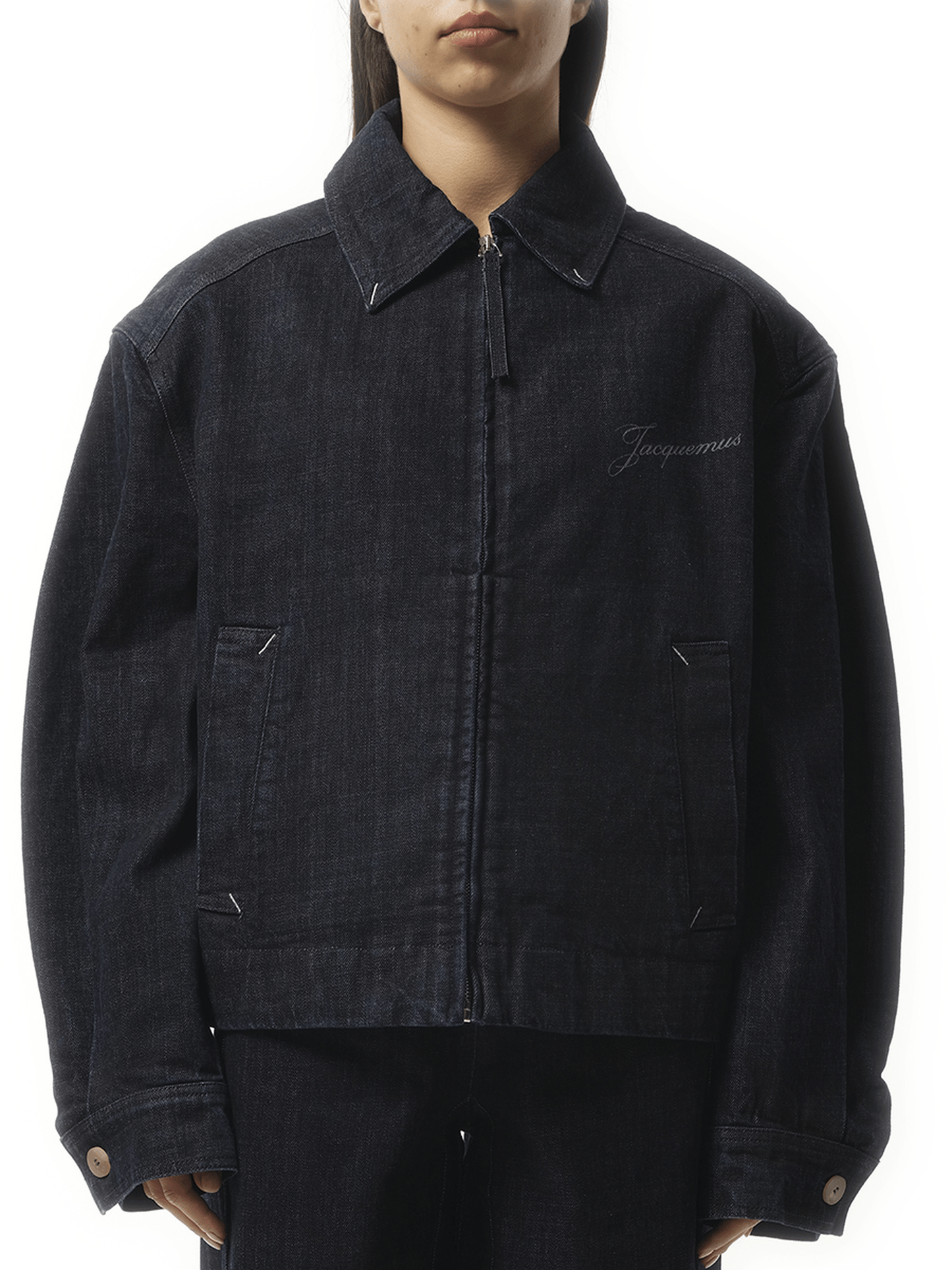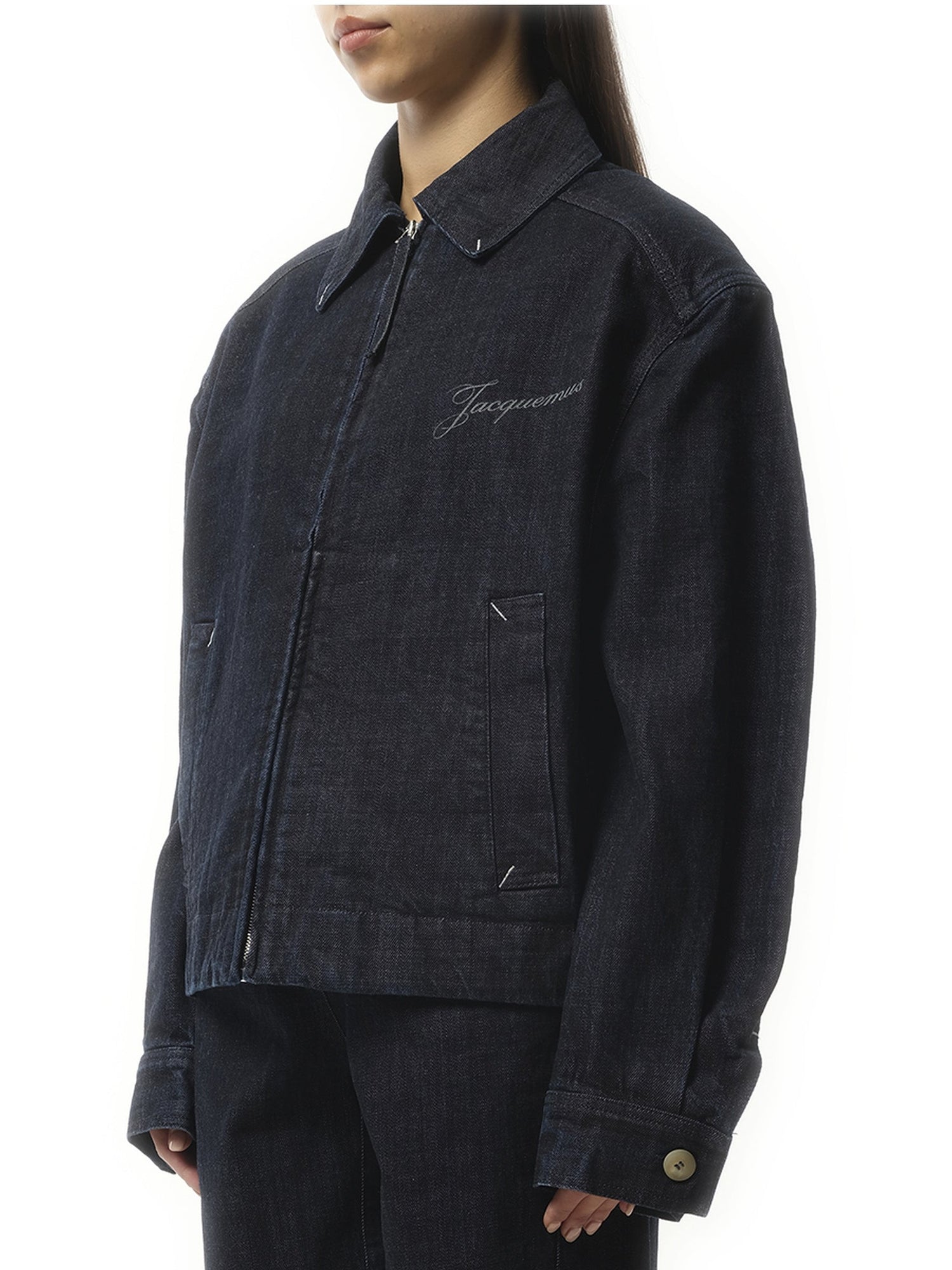 Jacquemus's La Veste Denim Canevas in Dark Navy is a workwear-inspired denim jacket crafted from dark navy cotton denim. It features a workwear collar, long sleeves, a zip closure with a denim puller, contrast bartacks, and two front welt pockets.