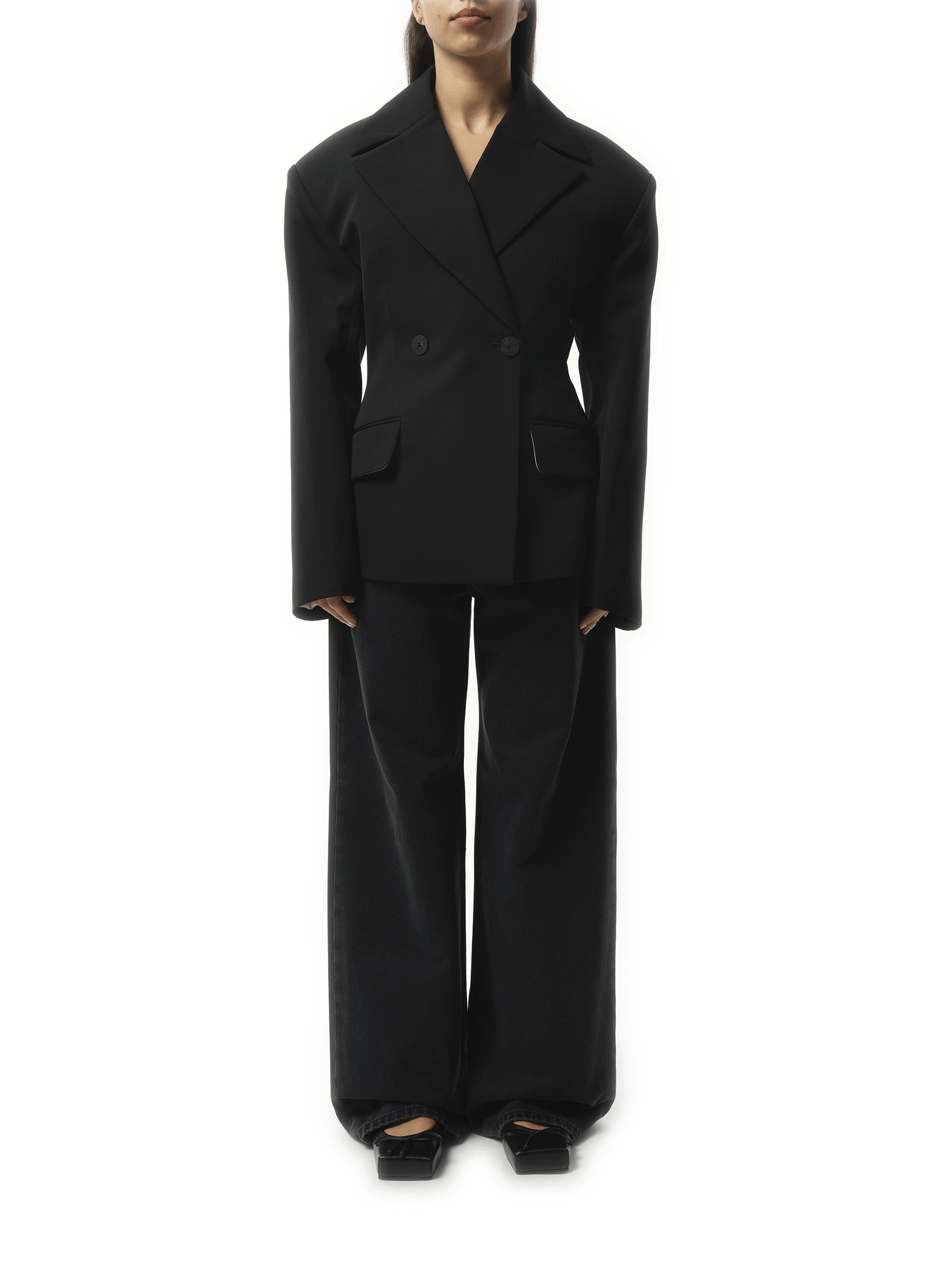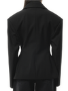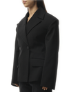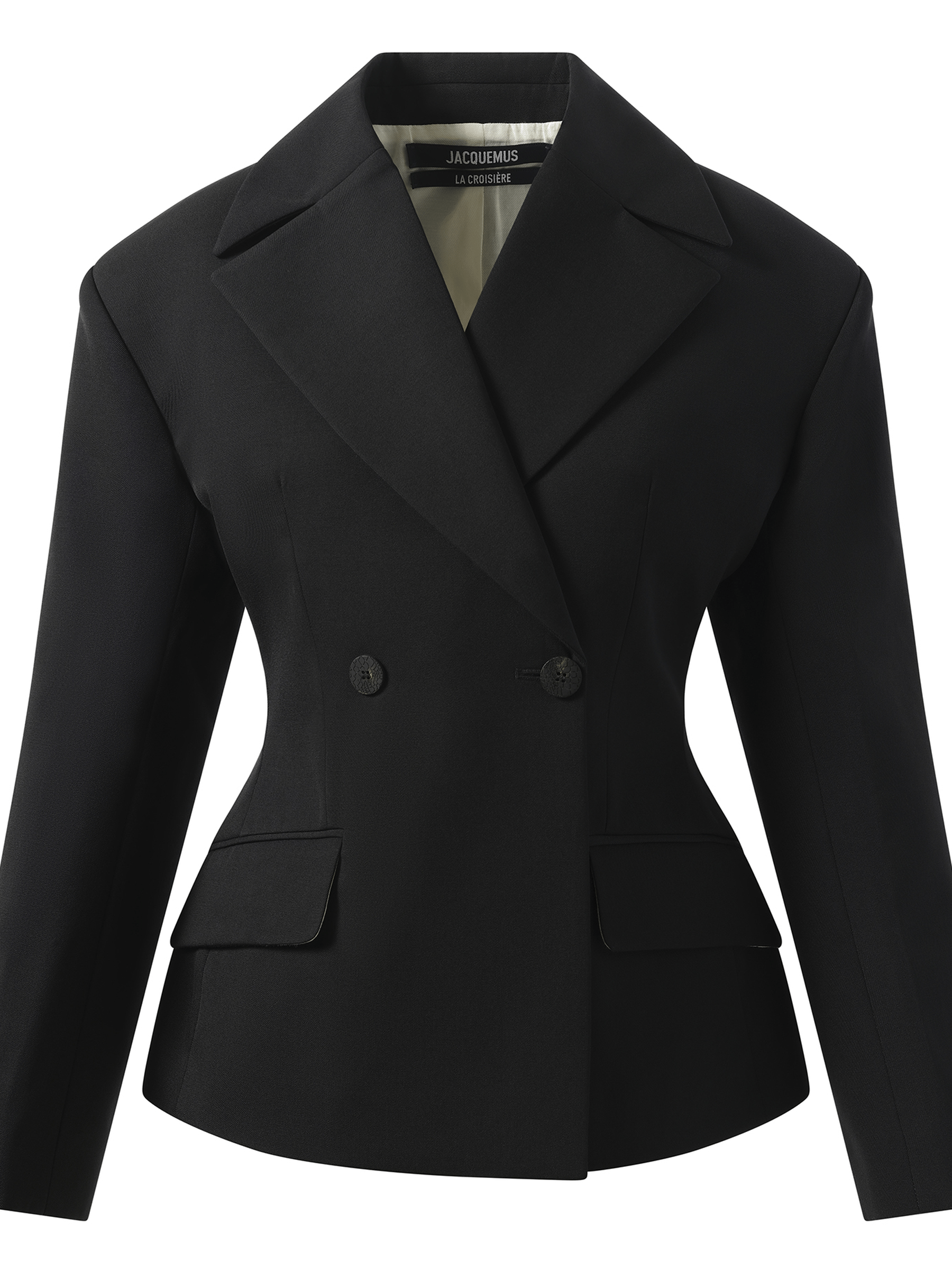 Jacquemus's La Veste Norma in Black is a tailored blazer with a double-breasted silhouette and sharp, structured shoulders. Its hourglass cut and minimalist details give it a modern, sculptural edge.