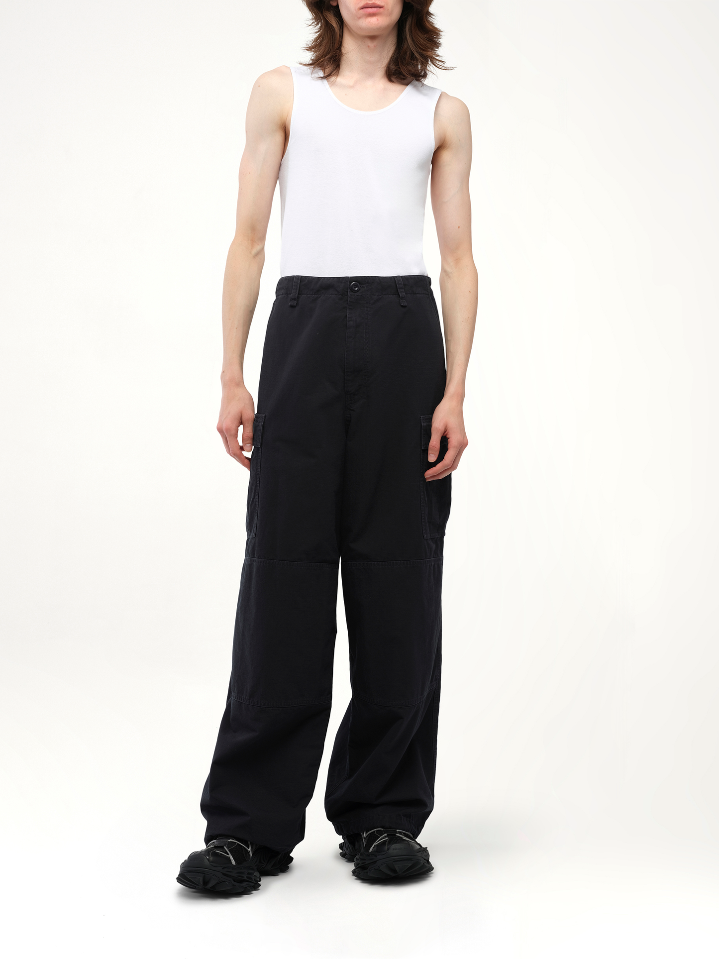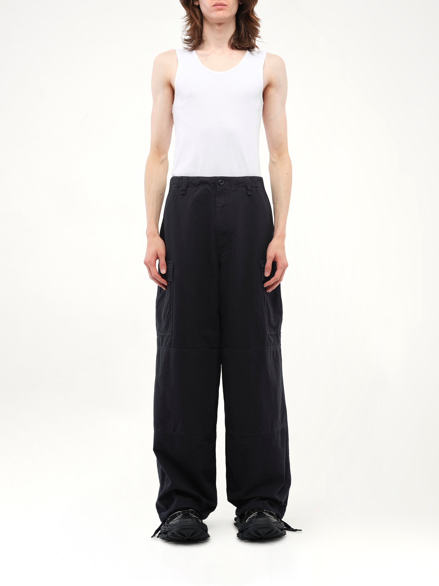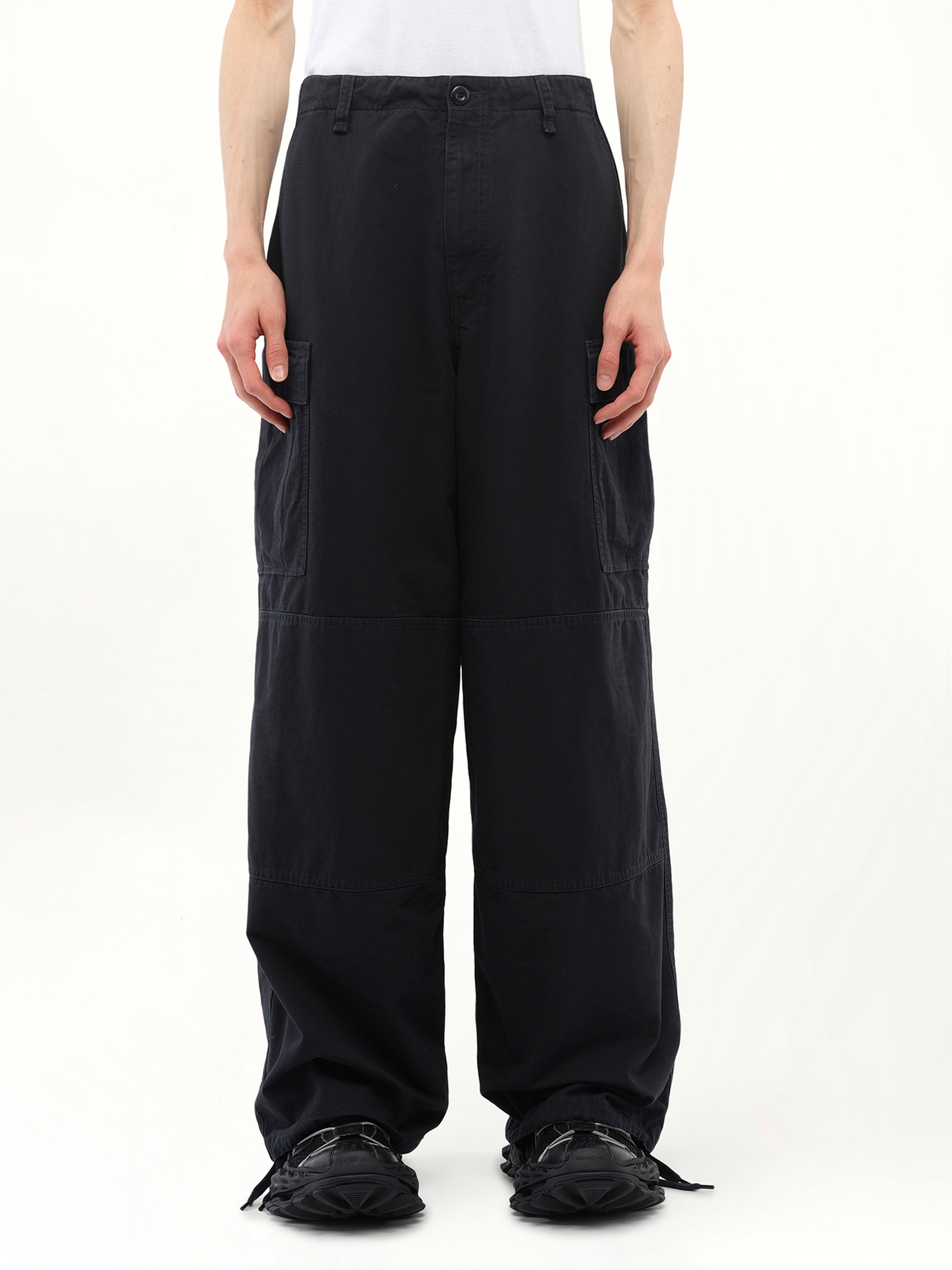 Balenciaga's Large Cargo Pants in Ink, crafted from durable cotton ripstop, these pants feature an oversized silhouette with utilitarian details. The design blends streetwear functionality with a high-fashion edge.
