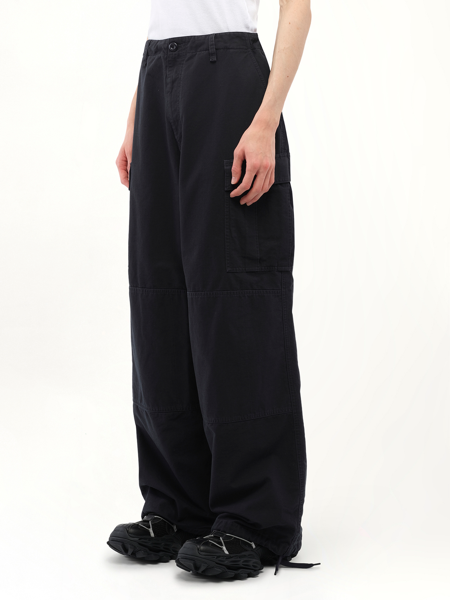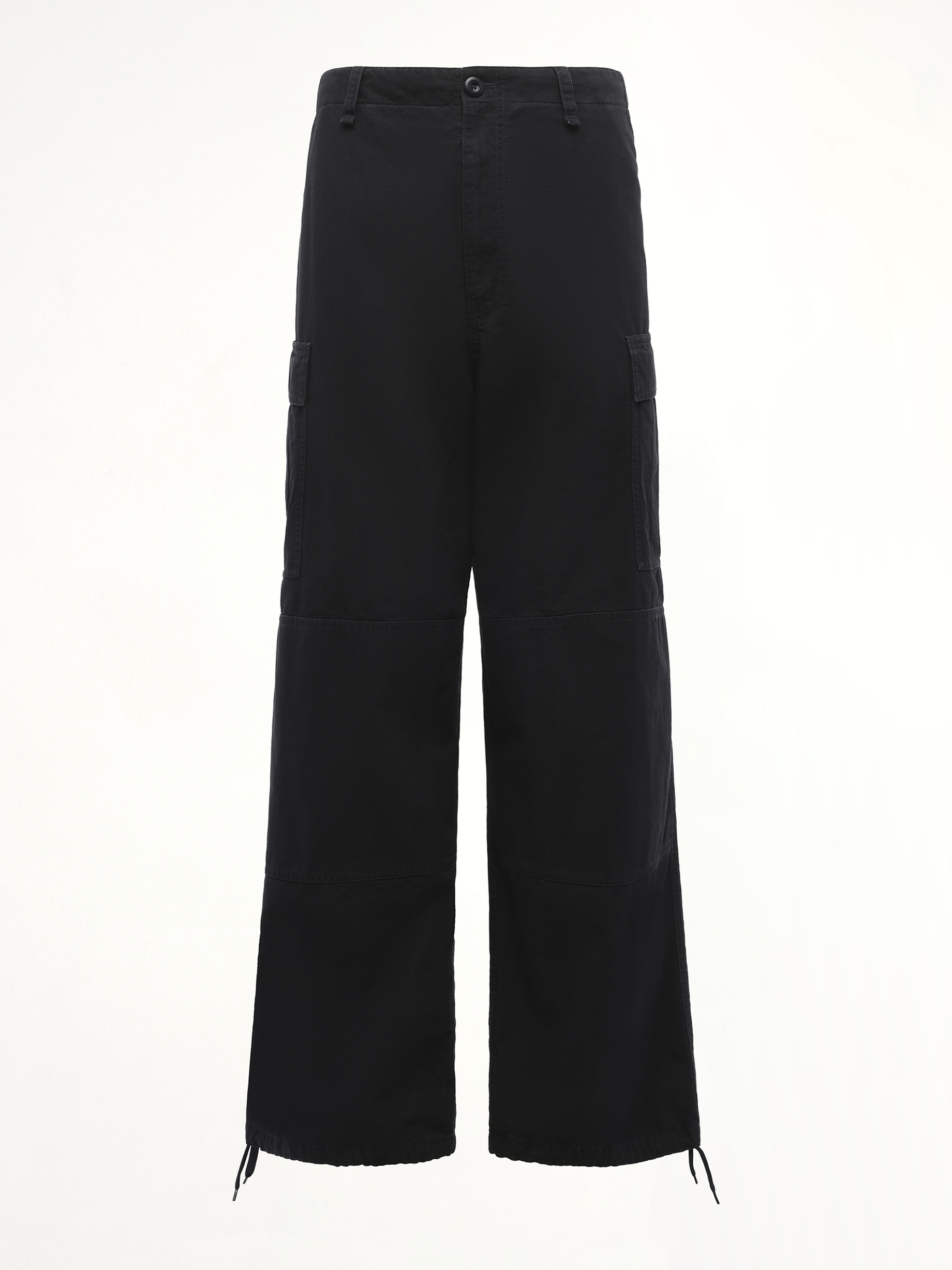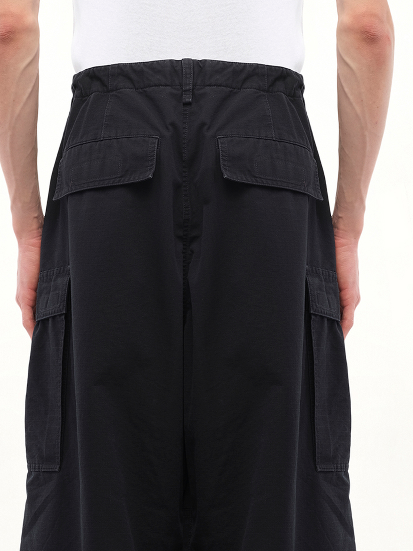 Balenciaga's Large Cargo Pants in Ink, crafted from durable cotton ripstop, these pants feature an oversized silhouette with utilitarian details. The design blends streetwear functionality with a high-fashion edge.