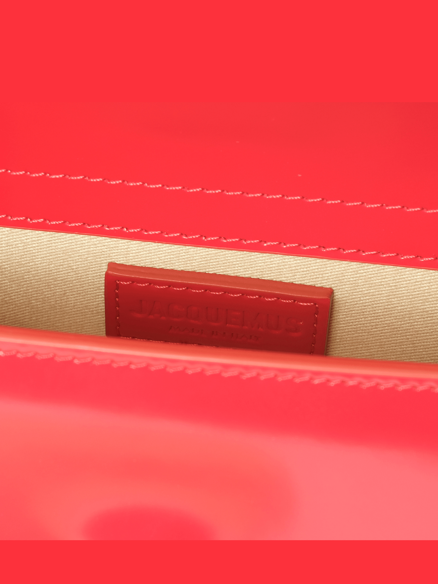 Jacquemus's Le Bambino in Red, a compact, structured mini bag with a glossy finish and refined silhouette. Designed with a padded handle and adjustable strap, it transitions seamlessly from daywear to evening style.